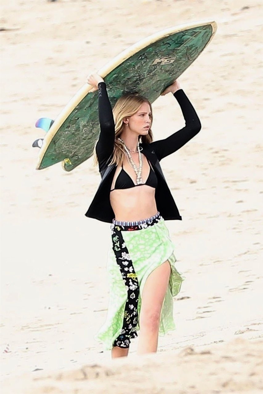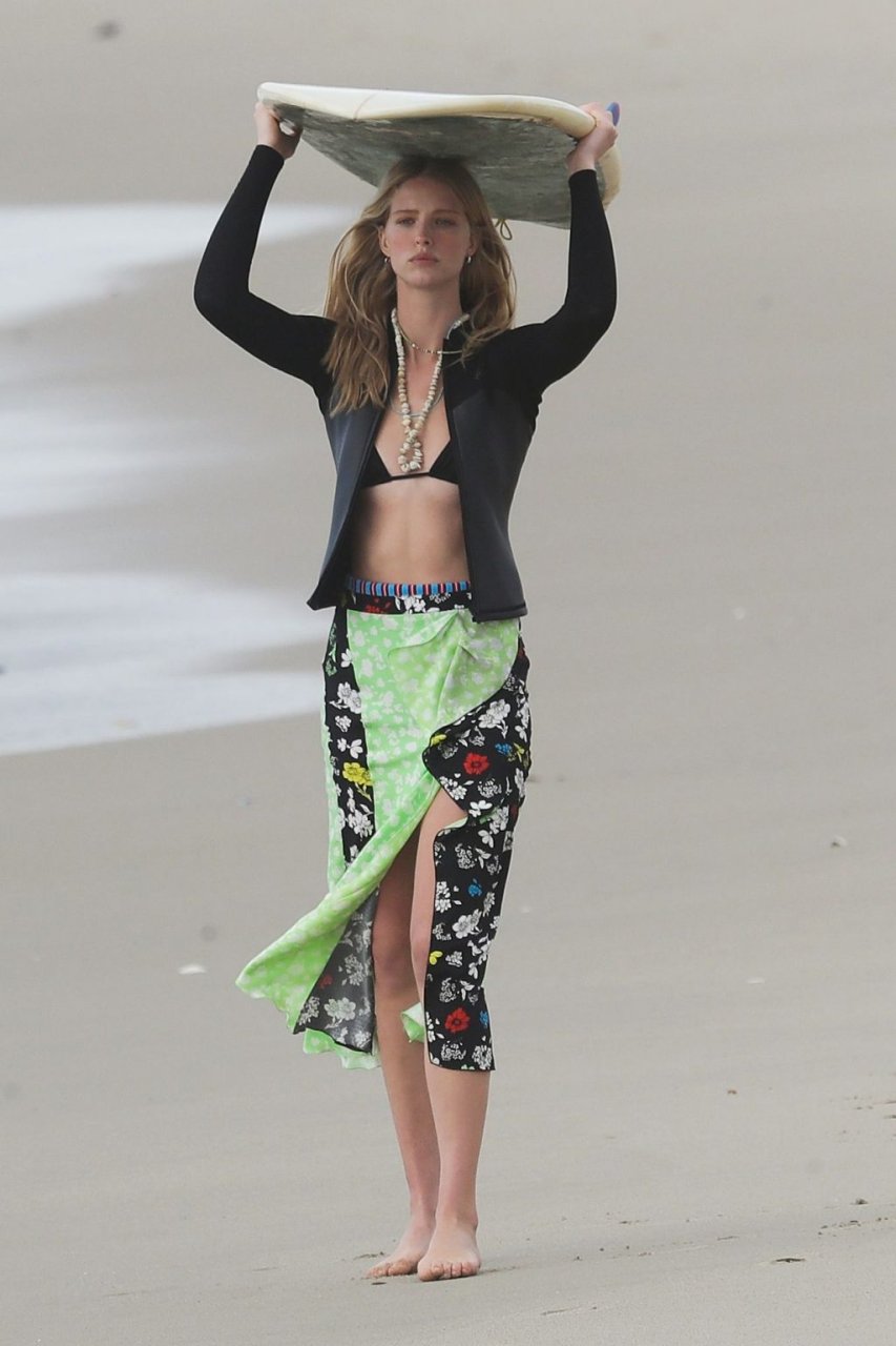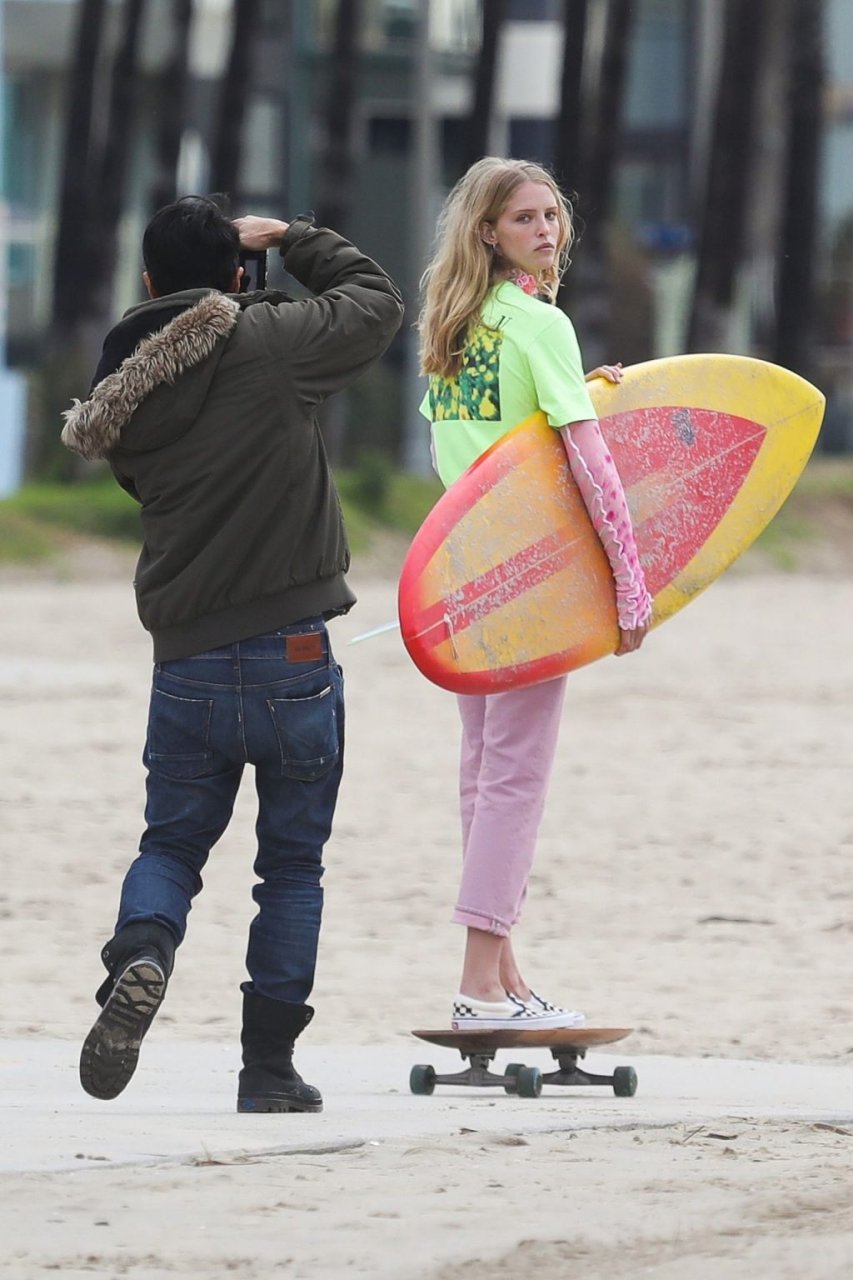 La petite amie de Patrick Schwarzenegger, la mannequin Abby Champion (21 ans), a été aperçue en train de faire une séance photo sur la plage de Venice Beach, le 15/01/2019. Abby arborait son style surfeuse avec un pull noir, un bikini noir et une jupe à imprimé floral vert et noir tout en tenant une planche de surf au-dessus de sa tête.