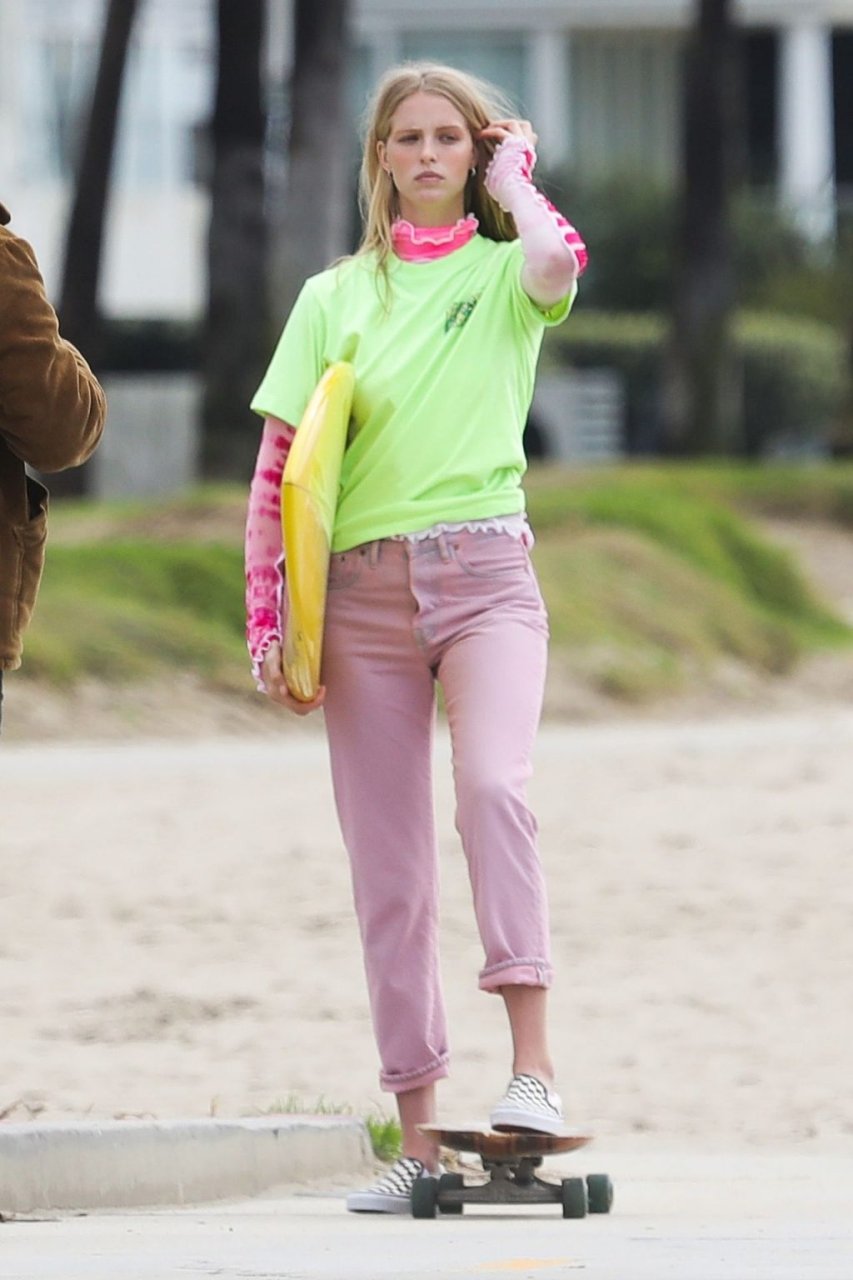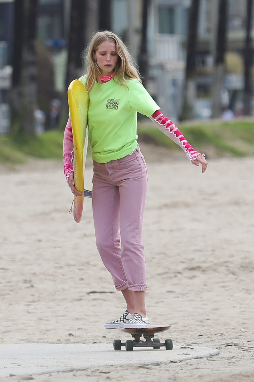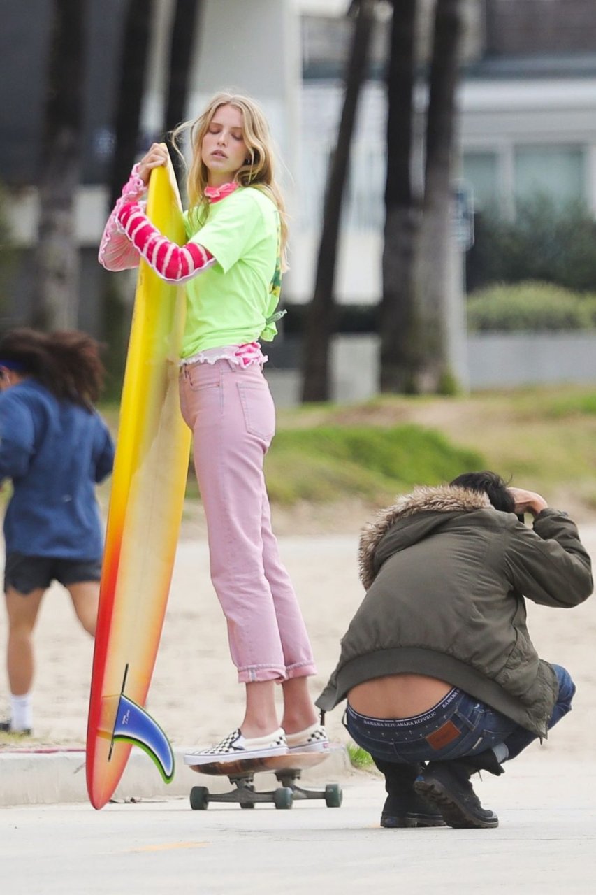 La petite amie de Patrick Schwarzenegger, la mannequin Abby Champion (21 ans), a été aperçue en train de faire une séance photo sur la plage de Venice Beach, le 15/01/2019. Abby arborait son style surfeuse avec un pull noir, un bikini noir et une jupe à imprimé floral vert et noir tout en tenant une planche de surf au-dessus de sa tête.