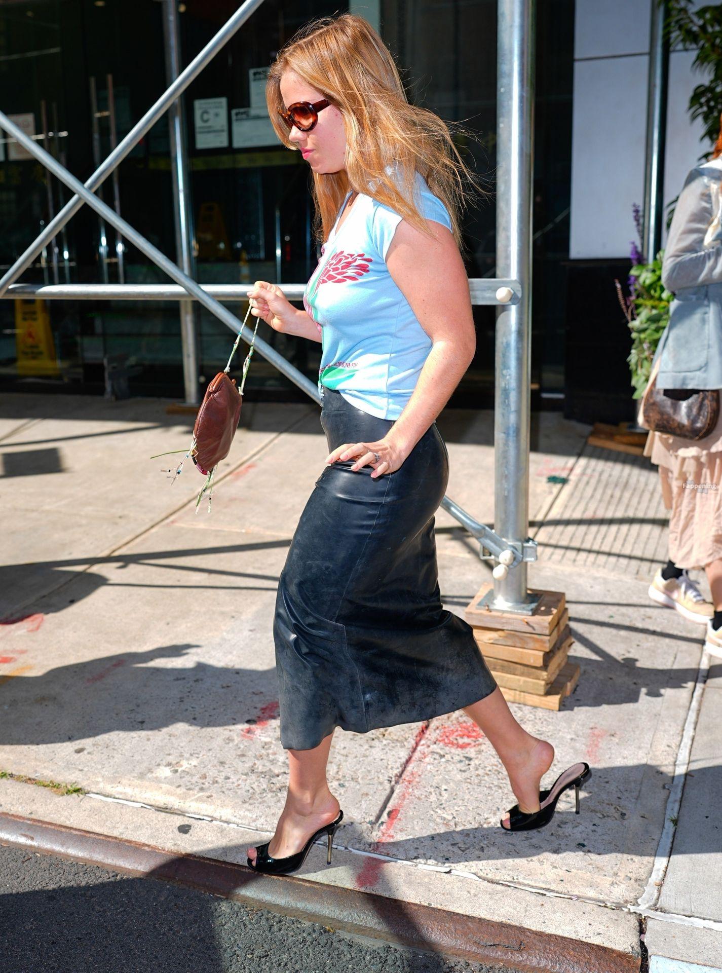 Addison Rae a été vue en train de se promener à New York, arborant un t-shirt bleu clair décontracté avec une jupe midi en cuir élégante, le tout complété par des talons et un petit sac.