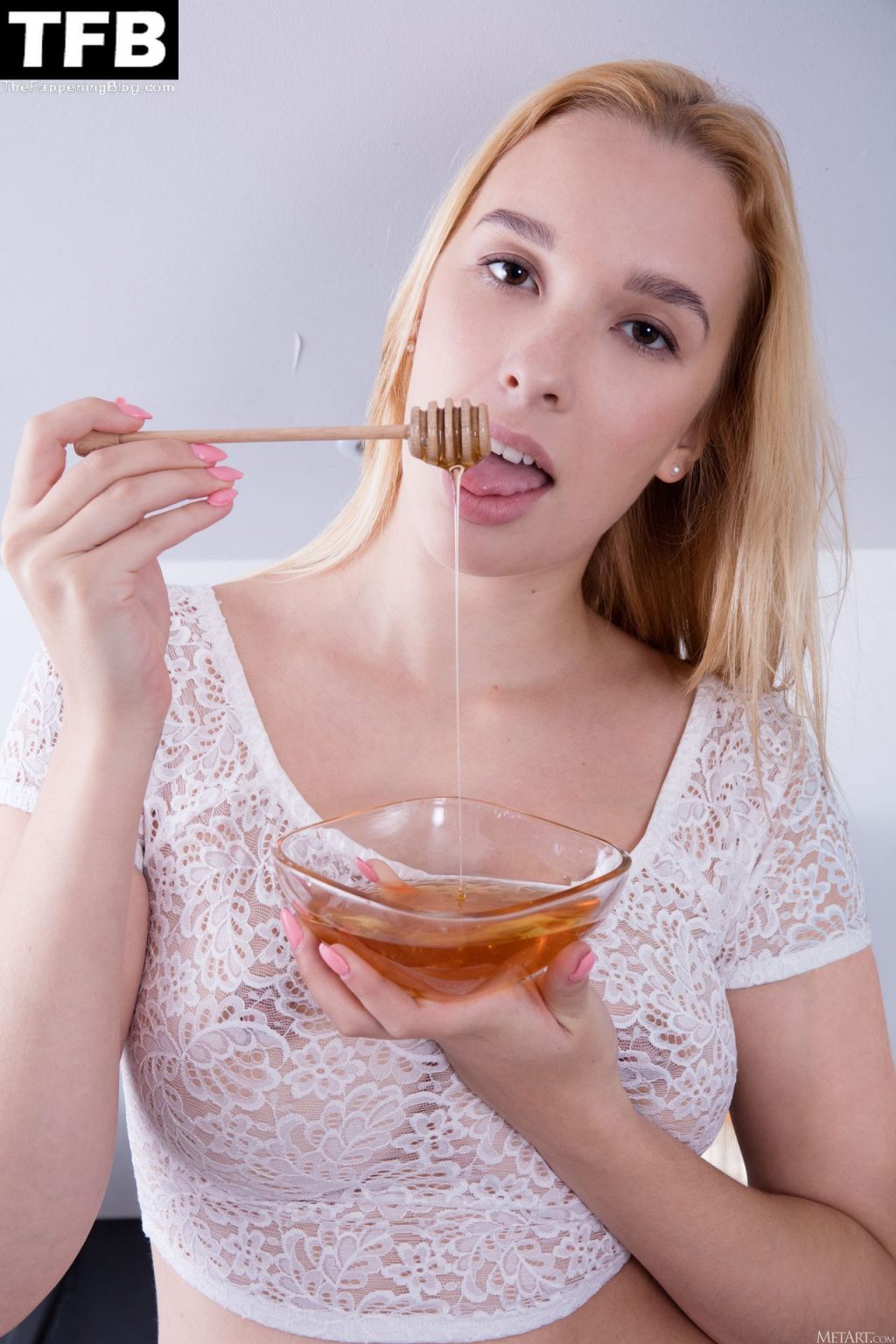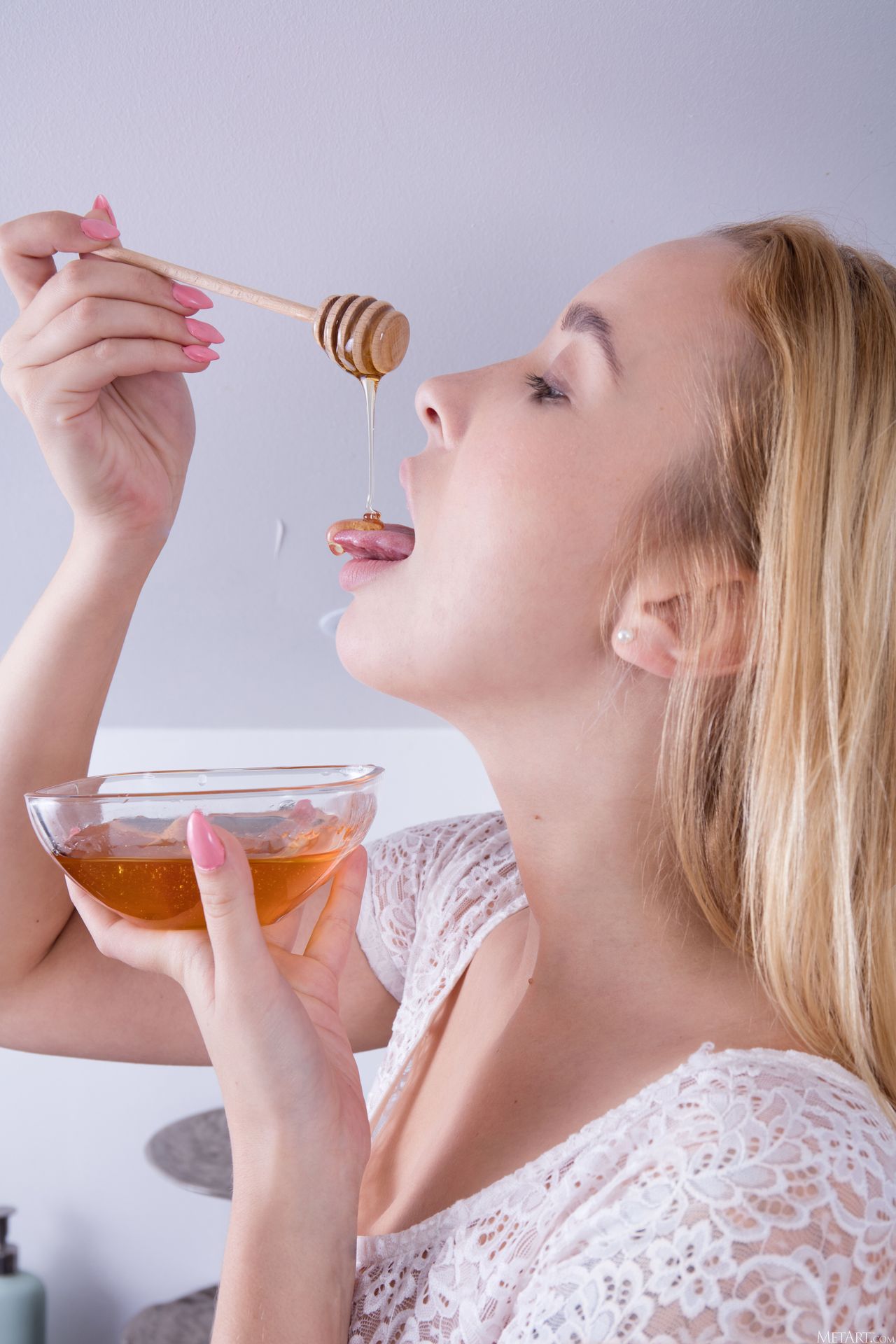 Charmante modèle Agata pose nue dans la cuisine et étale du miel sur ses seins. C’est la première séance photo d’Agata avec une nouvelle coiffure et la jeune femme est très séduisante en blonde.