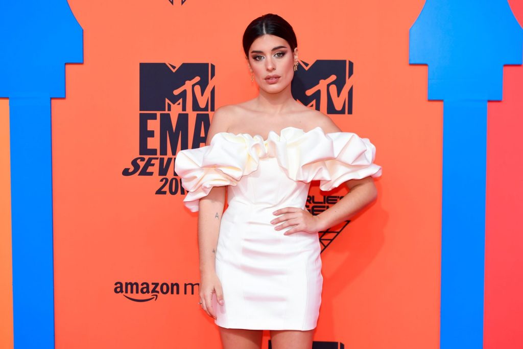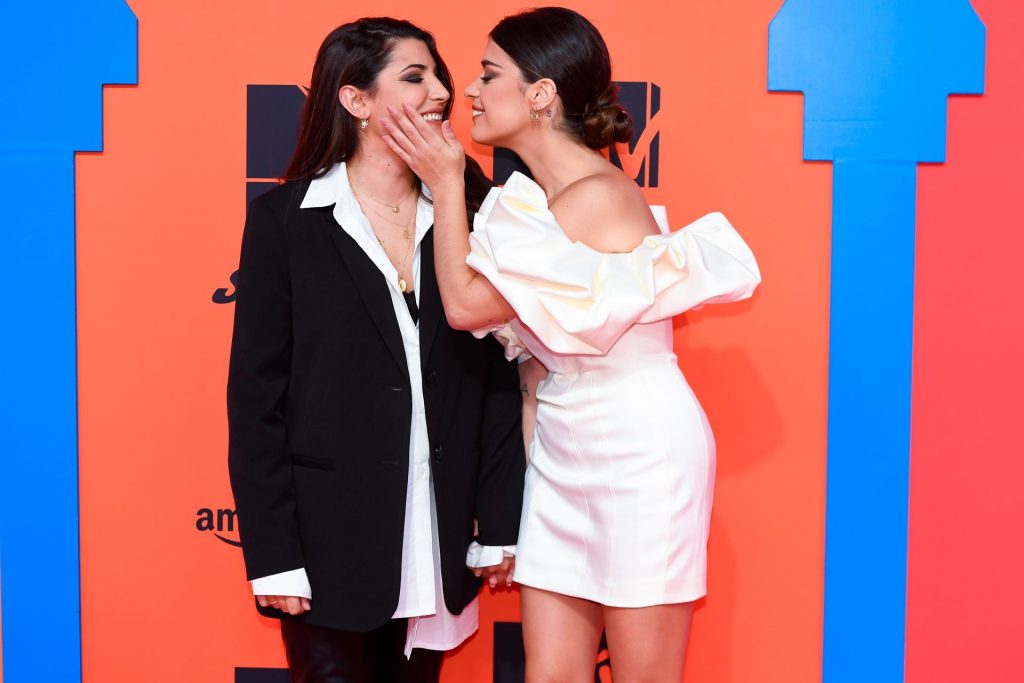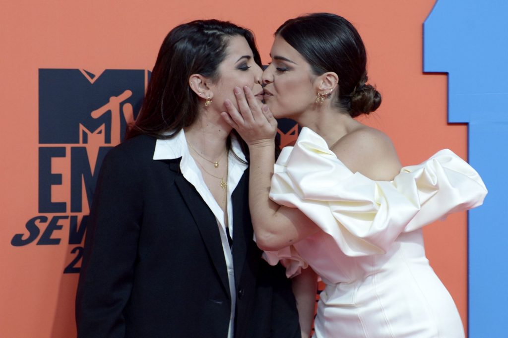 Les influenceuses espagnoles Aida Domenech alias Dulceida et sa partenaire Alba Paul s’embrassent sur le tapis rouge lors de leur arrivée aux MTV Europe Music Awards au Centre de Conférences et d’Expositions FIBES de Séville, 11/03/2019.