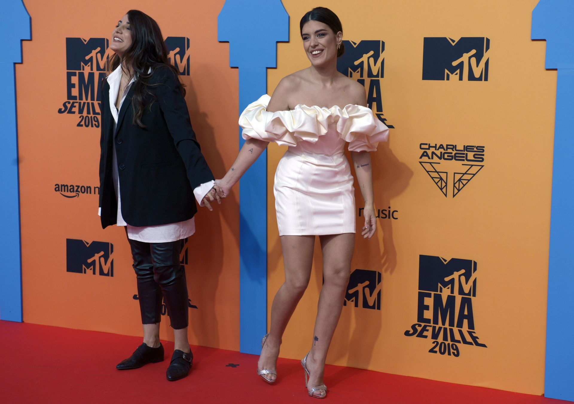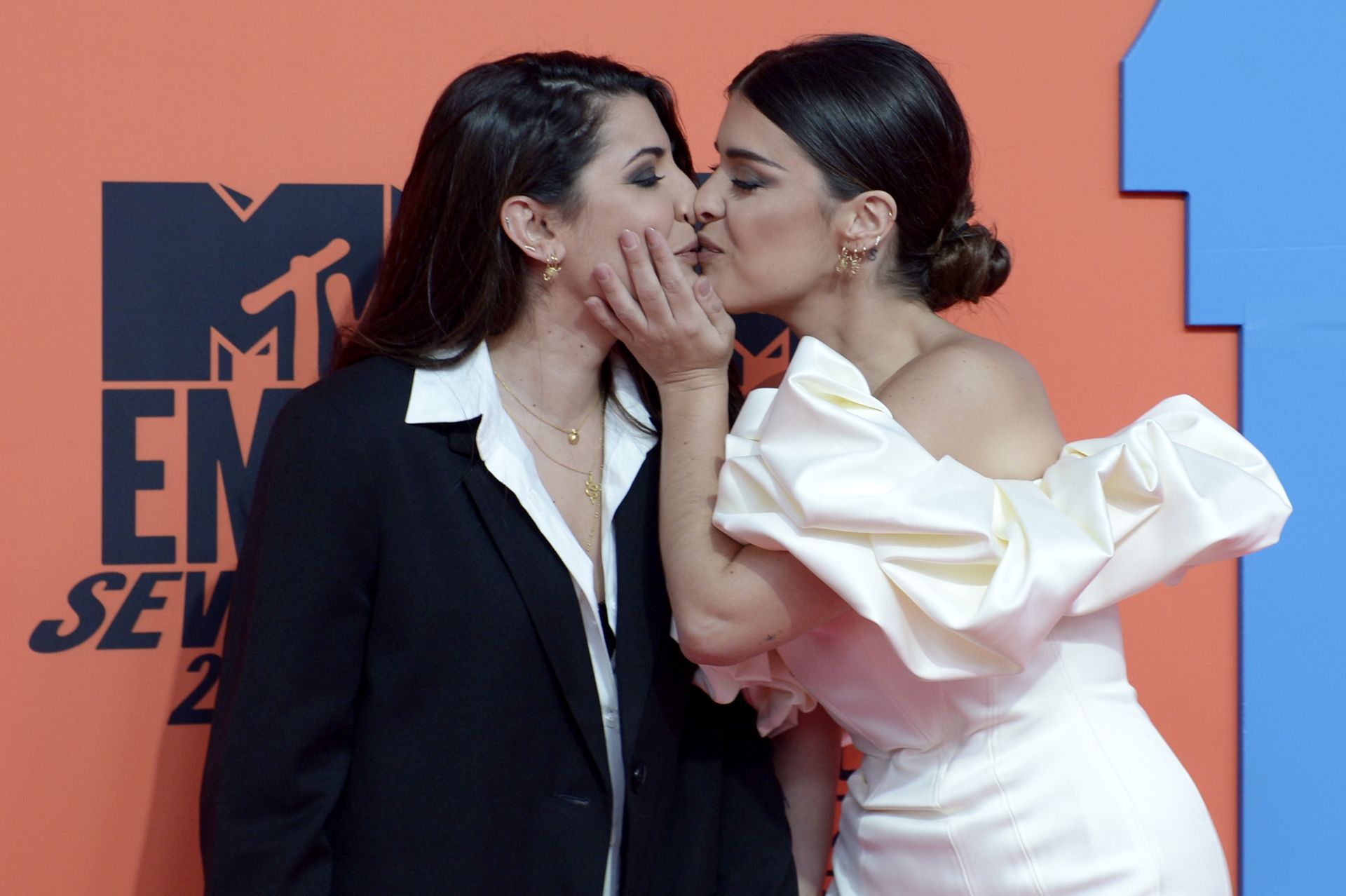 Les influenceuses espagnoles Aida Domenech alias Dulceida et sa partenaire Alba Paul s’embrassent sur le tapis rouge lors de leur arrivée aux MTV Europe Music Awards au Centre de Conférences et d’Expositions FIBES de Séville, 11/03/2019.