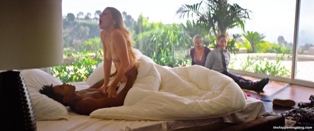 Alena Savostikova is having energetic sex with a guy while riding him on a bed as she bounces up and down showing off her breasts before they finish and she leans over passionately kissing him and continuing to show her breasts all while Angela Hisel and a guy sit bound and gagged forced to watch them.