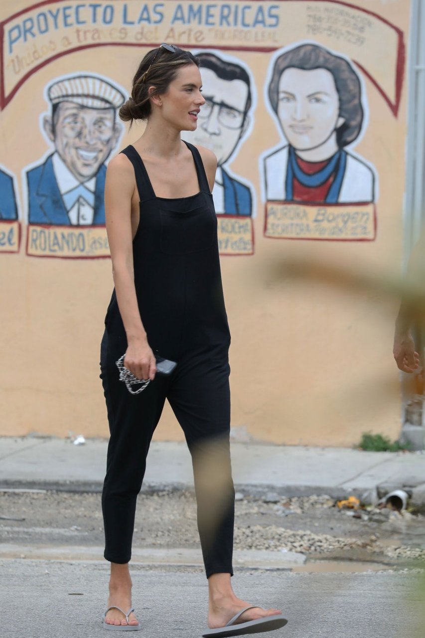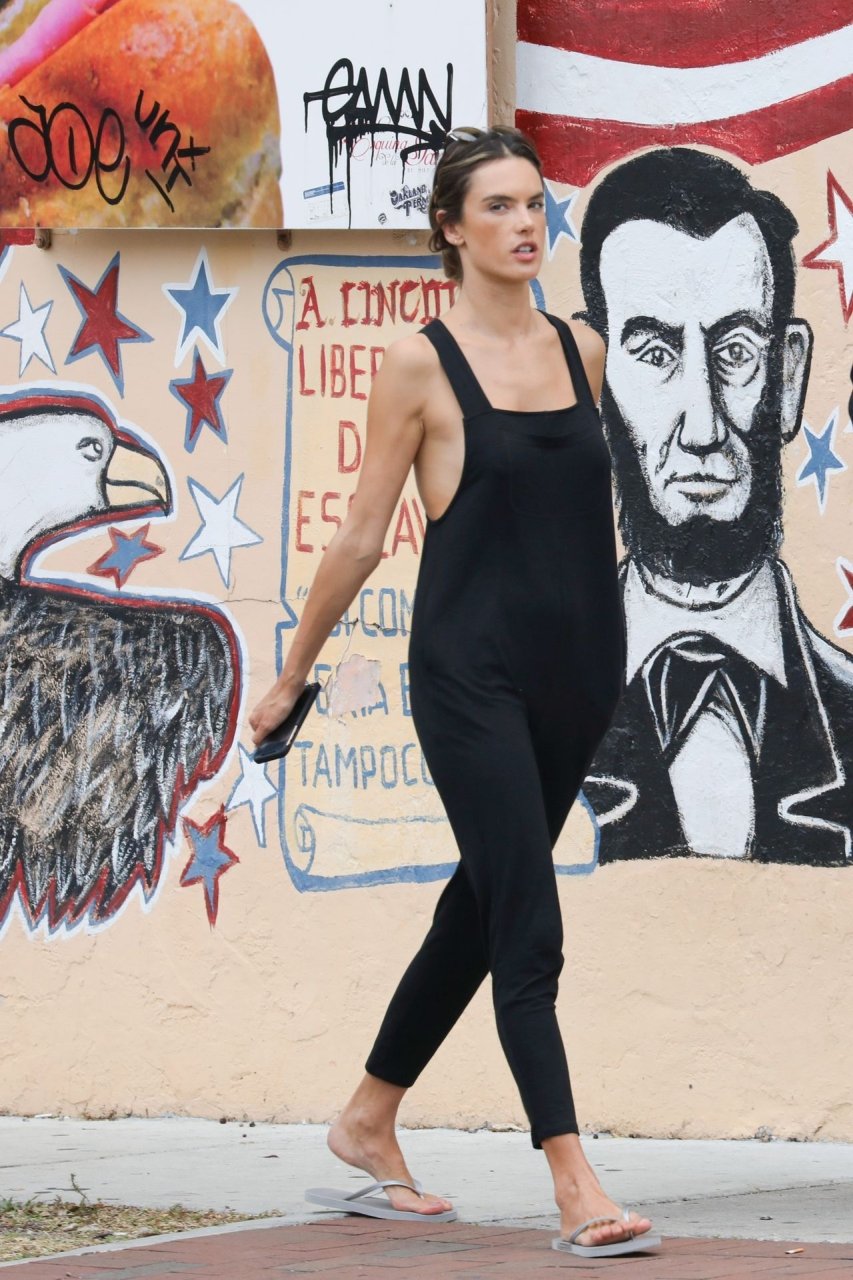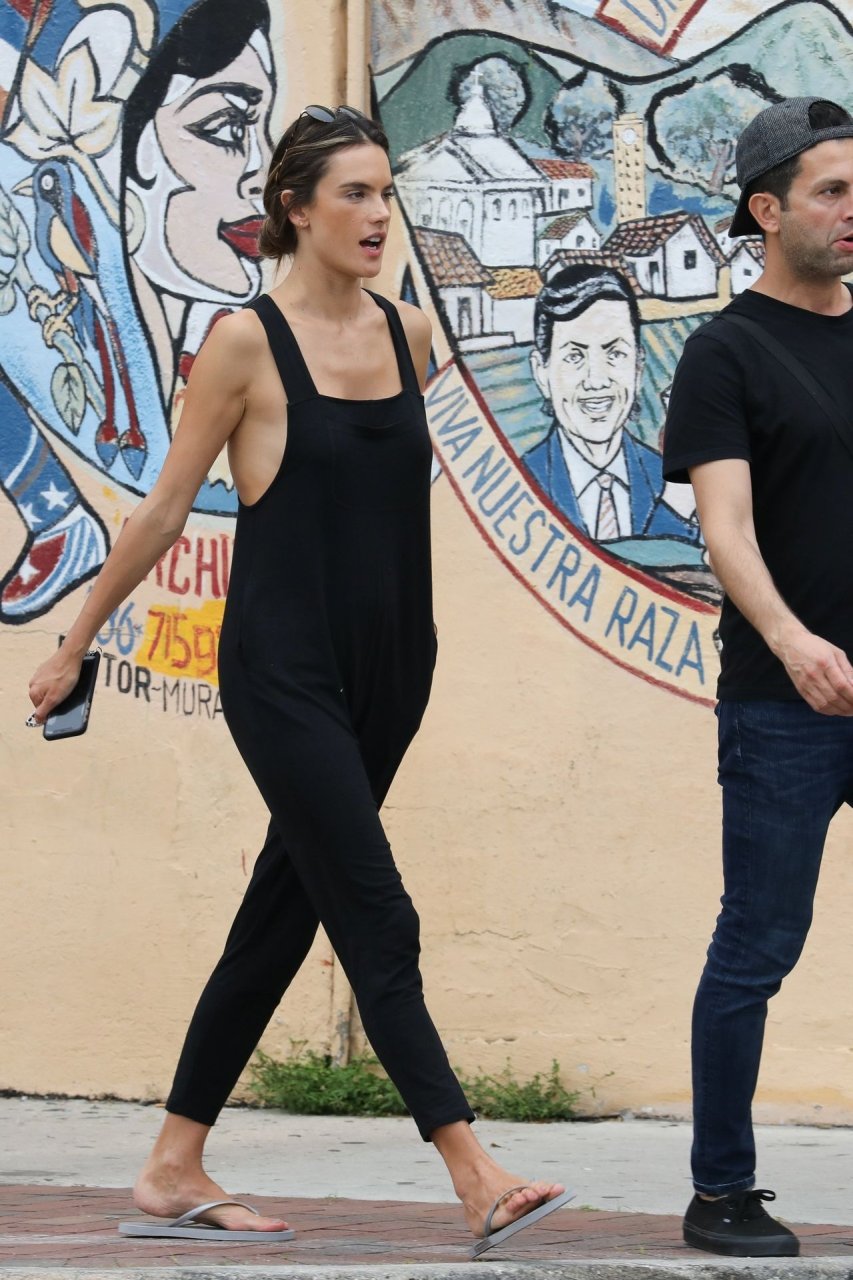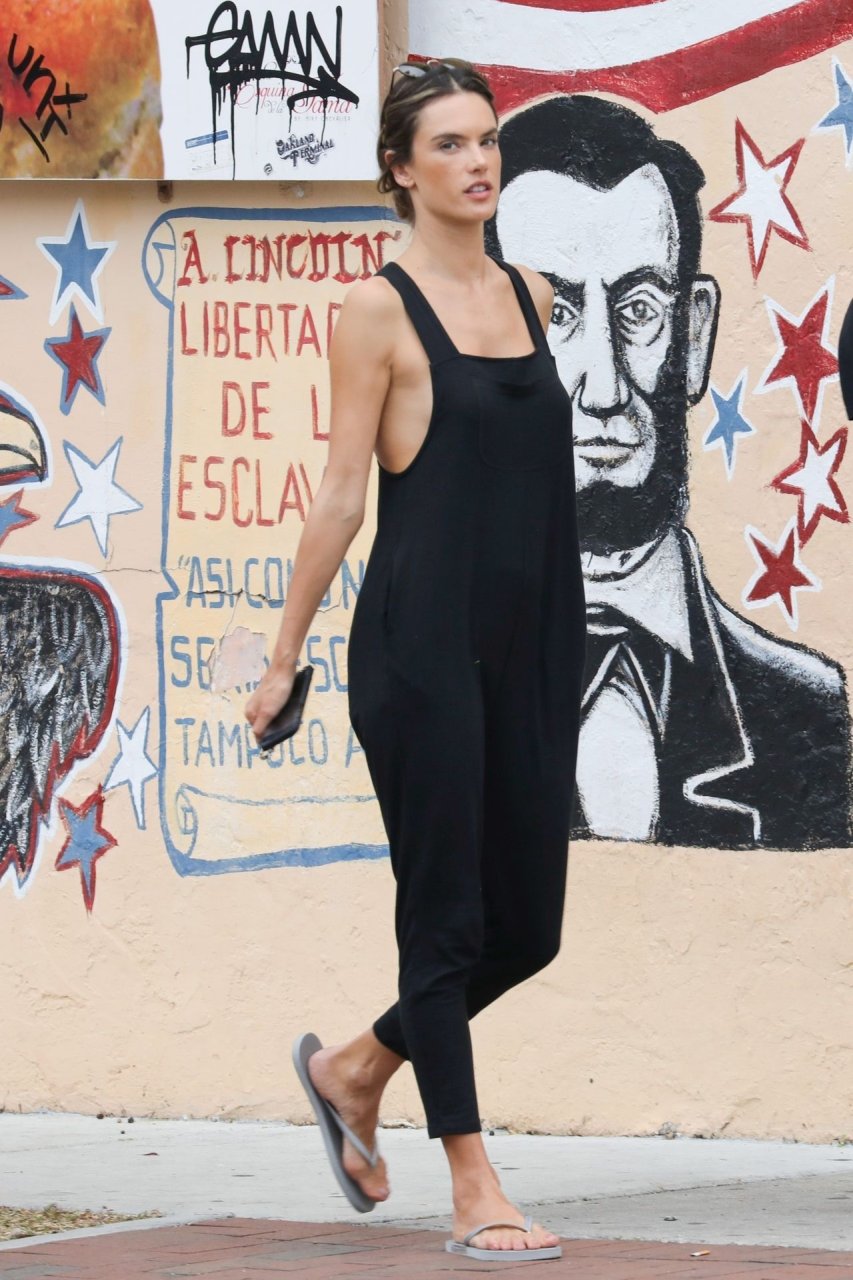 Alessandra Ambrosio sans soutien-gorge enfile une salopette noire et des tongs grises après une séance photo à Miami, 23/01/2019.