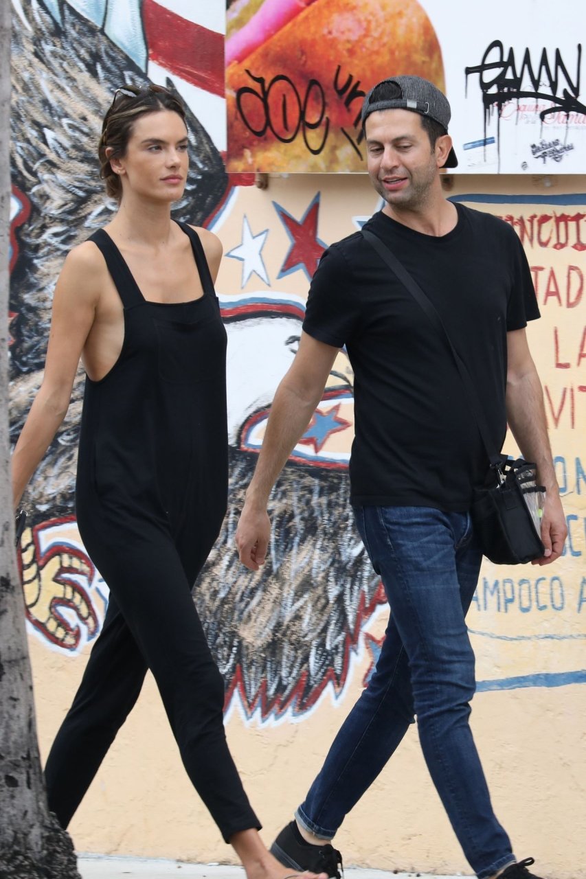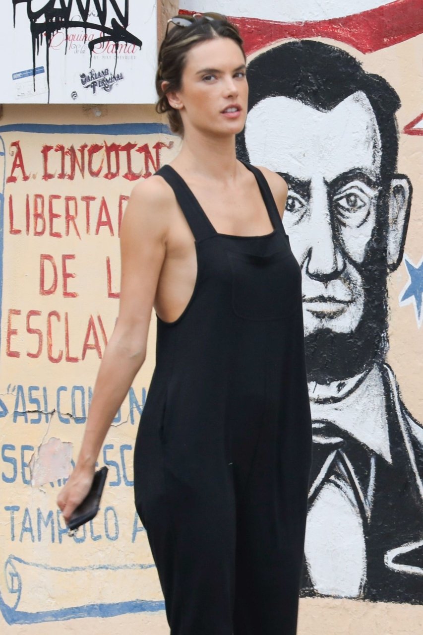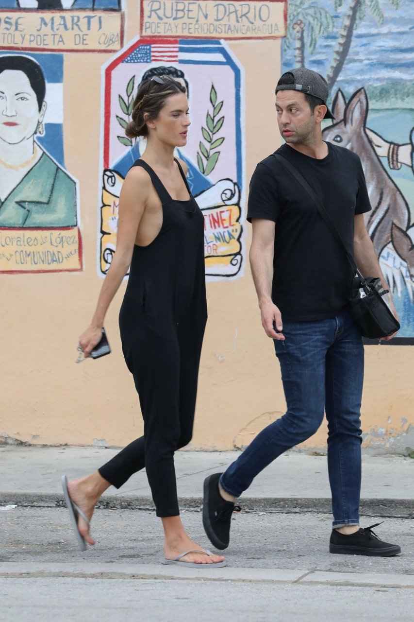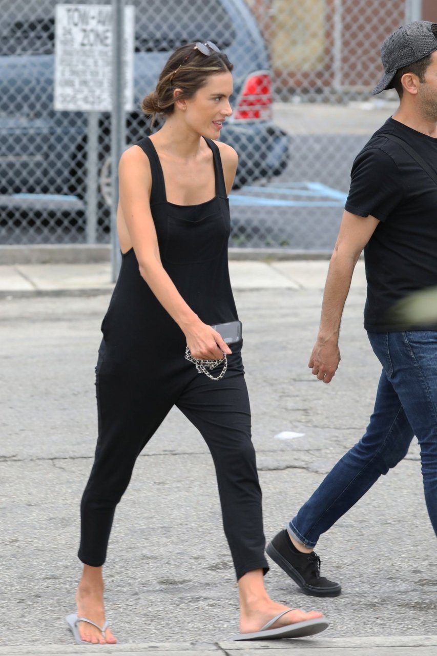Alessandra Ambrosio sans soutien-gorge enfile une salopette noire et des tongs grises après une séance photo à Miami, 23/01/2019.