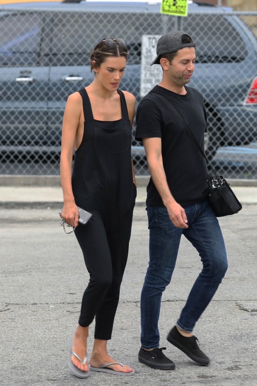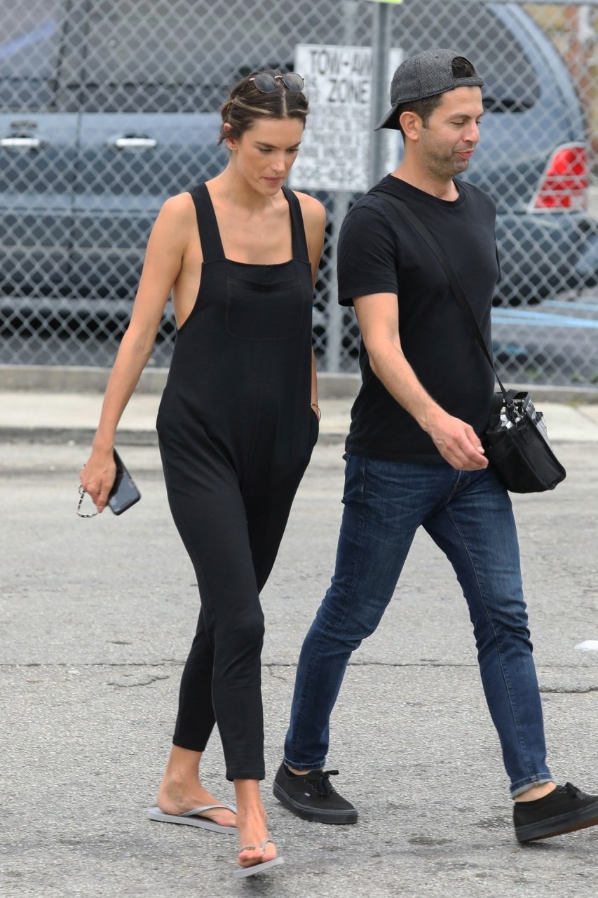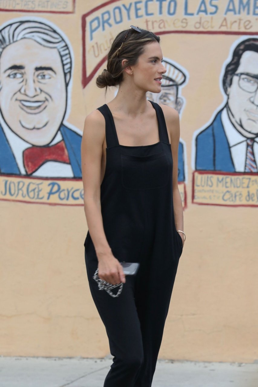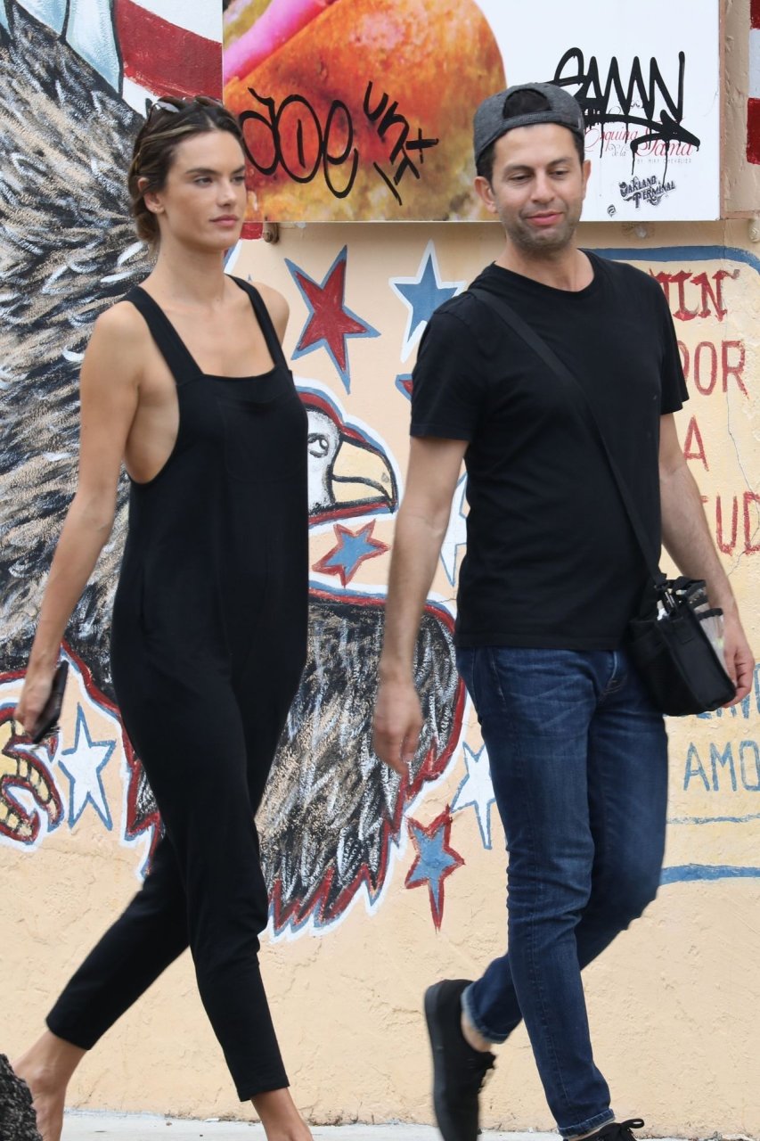 Alessandra Ambrosio sans soutien-gorge enfile une salopette noire et des tongs grises après une séance photo à Miami, 23/01/2019.