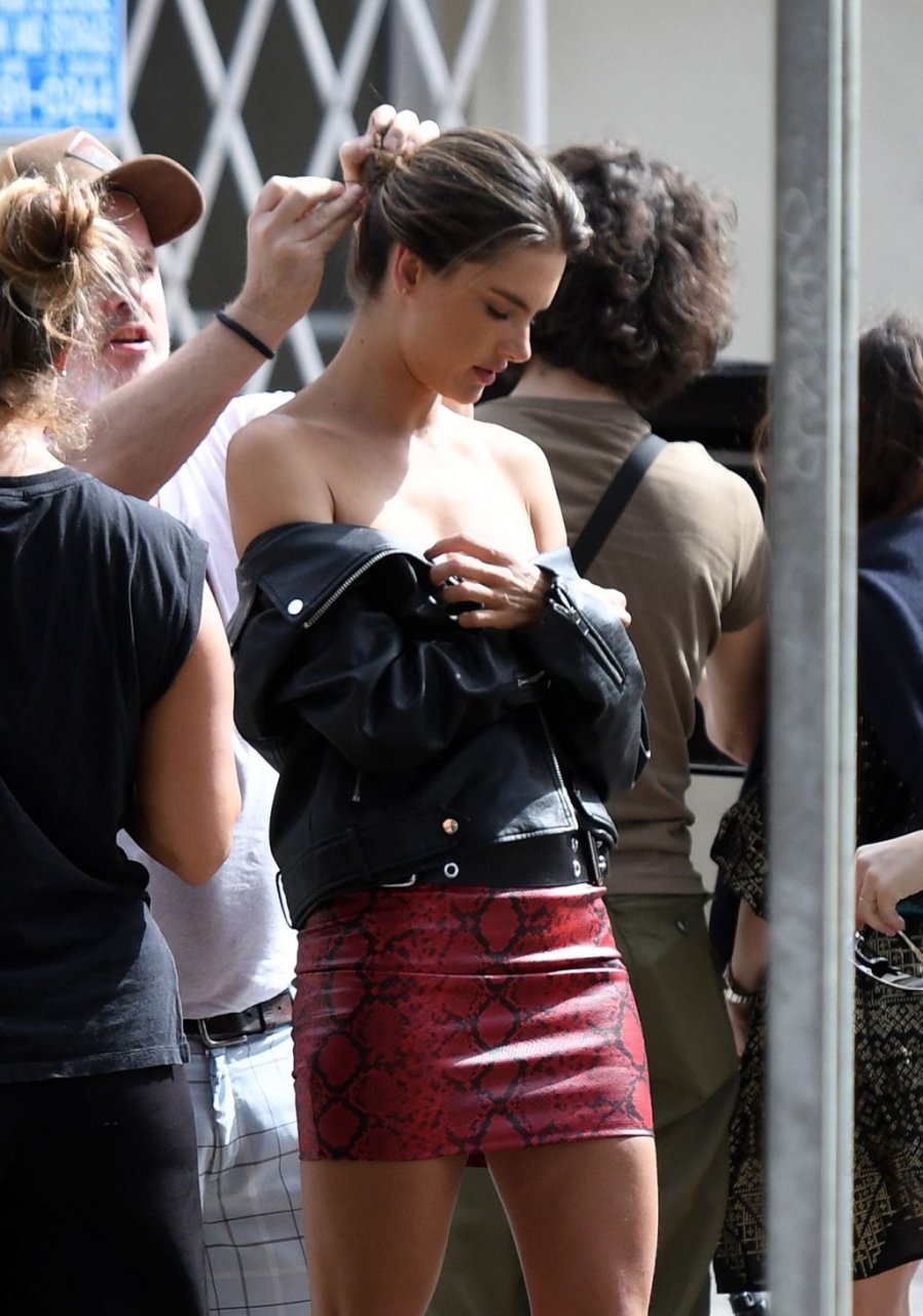 Le mannequin brésilien Alessandra Ambrosio fait de son mieux pour éviter un accident de garde-robe dans une veste en cuir noire et une jupe rouge pour la séance photo d’Elle Italie à Little Havana, Floride, 23/01/2019.