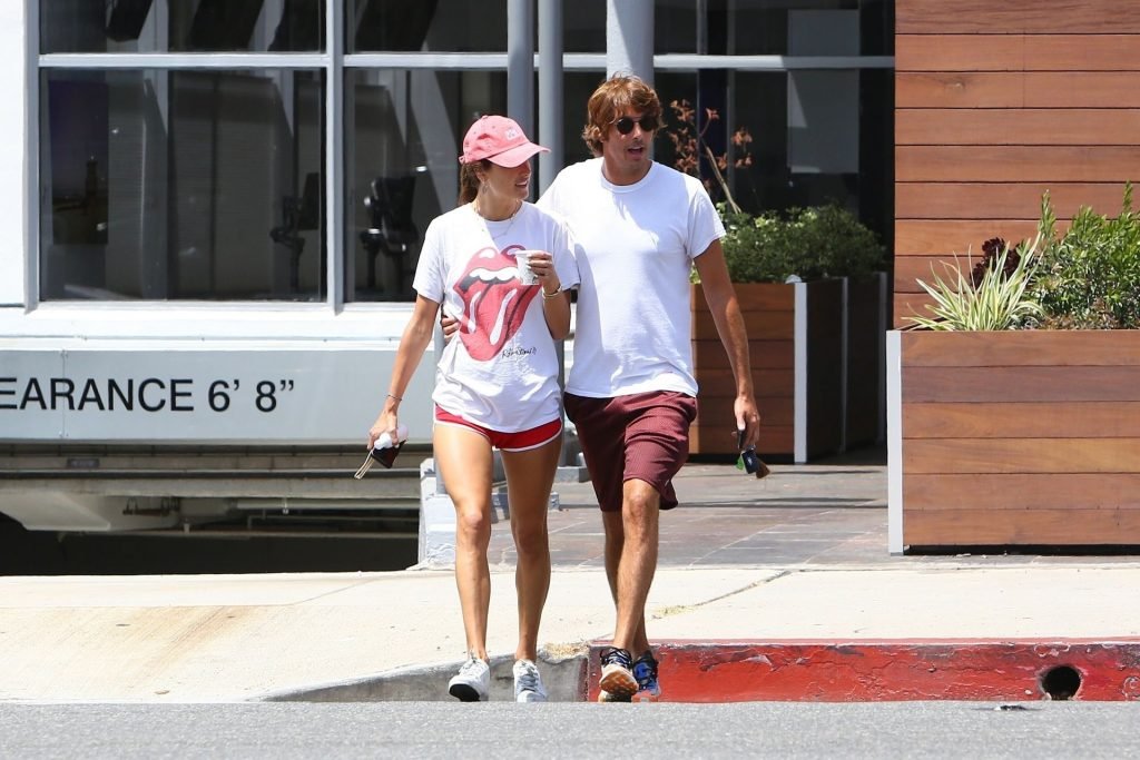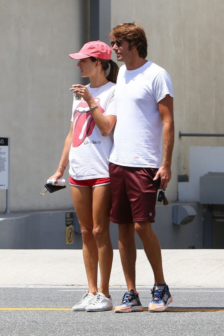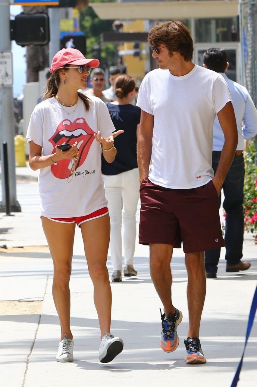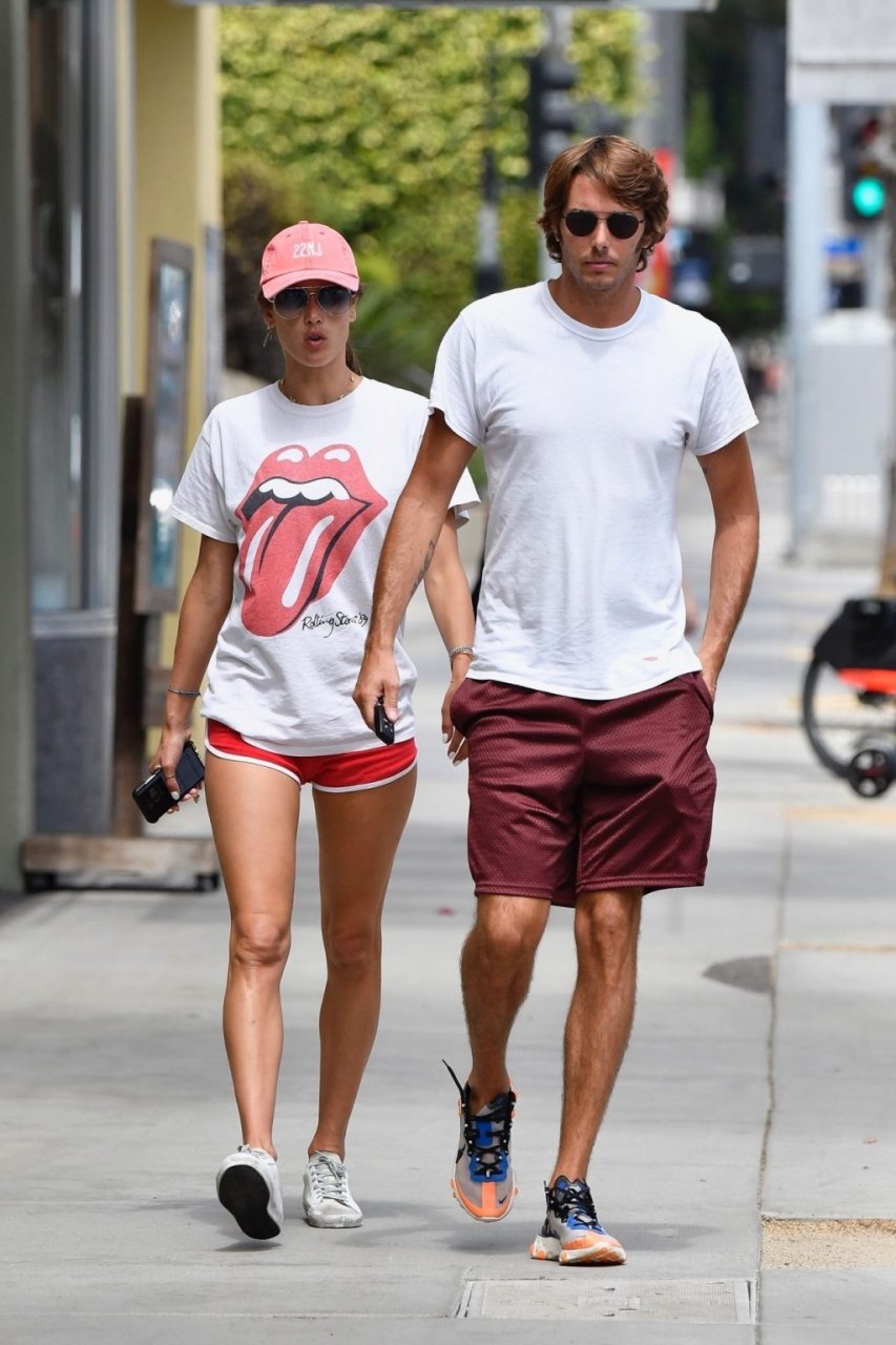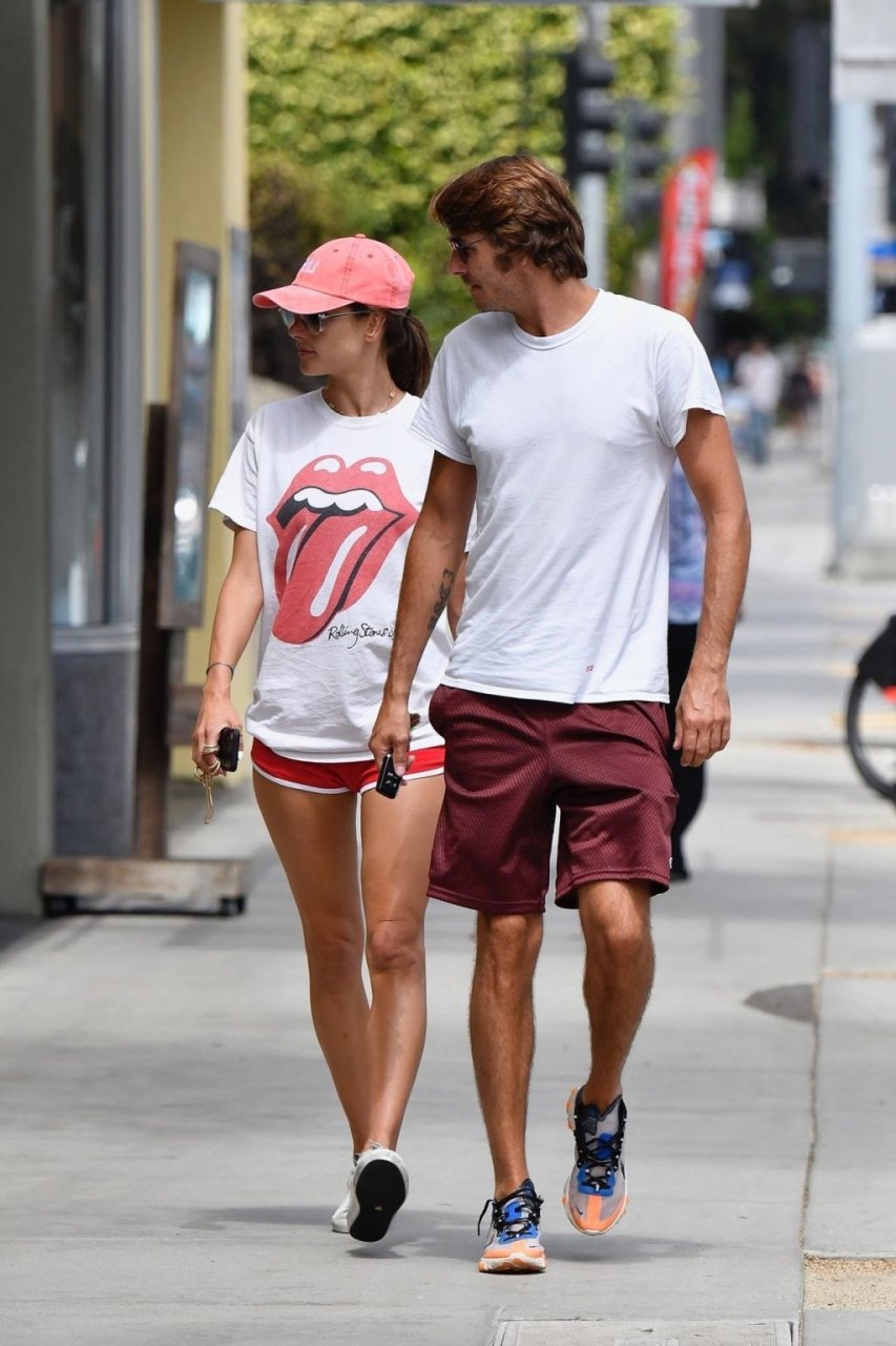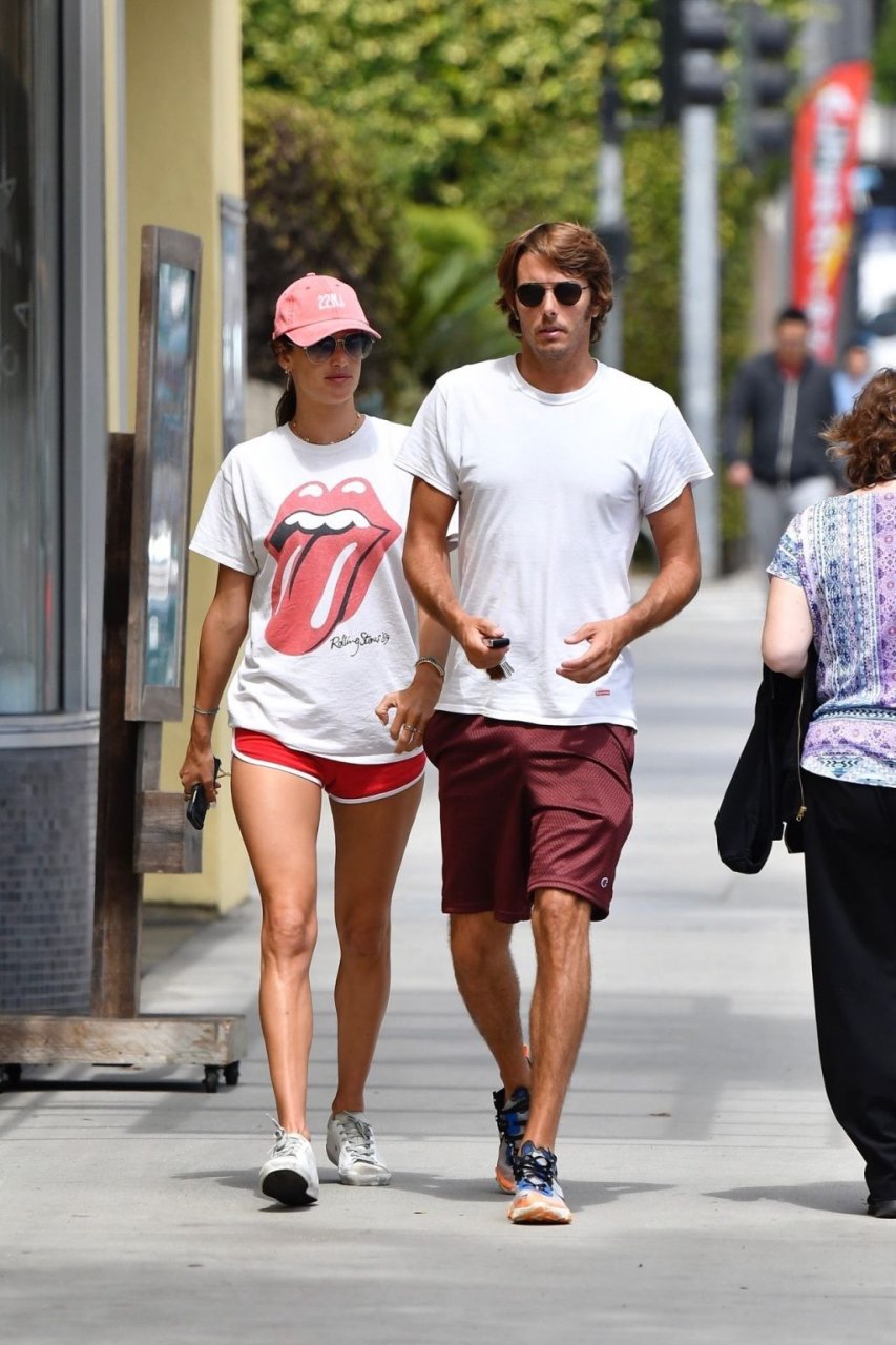 La supermodèle brésilienne Alessandra Ambrosio et son compagnon Nicolo Oddi se rendent déjeuner à Santa Monica chez Tocaya Organica, le 22/08/2019. Alessandra porte un tee-shirt des Rolling Stones avec un short rouge très court et un chapeau rouge pour sa sortie déjeuner.