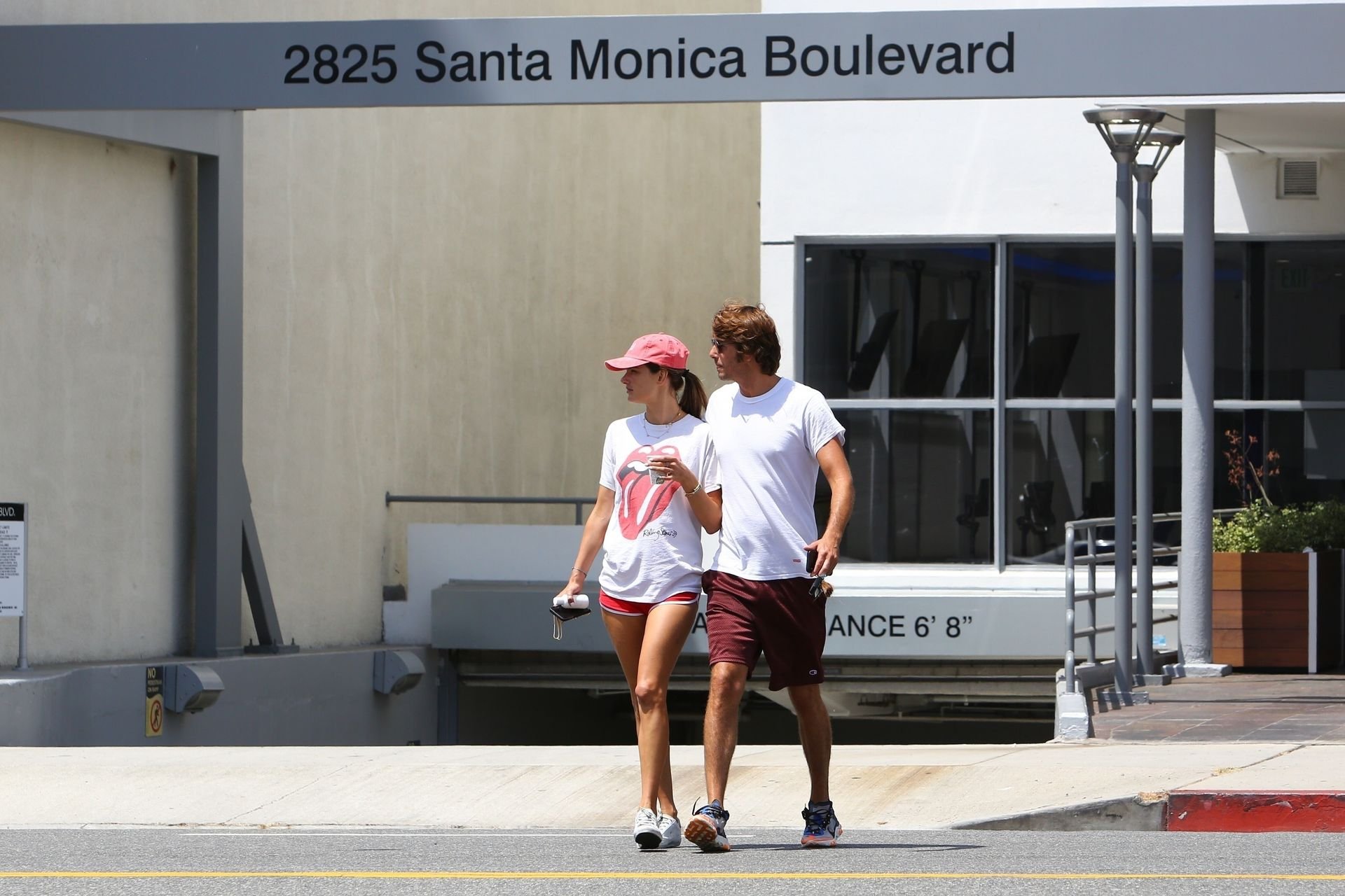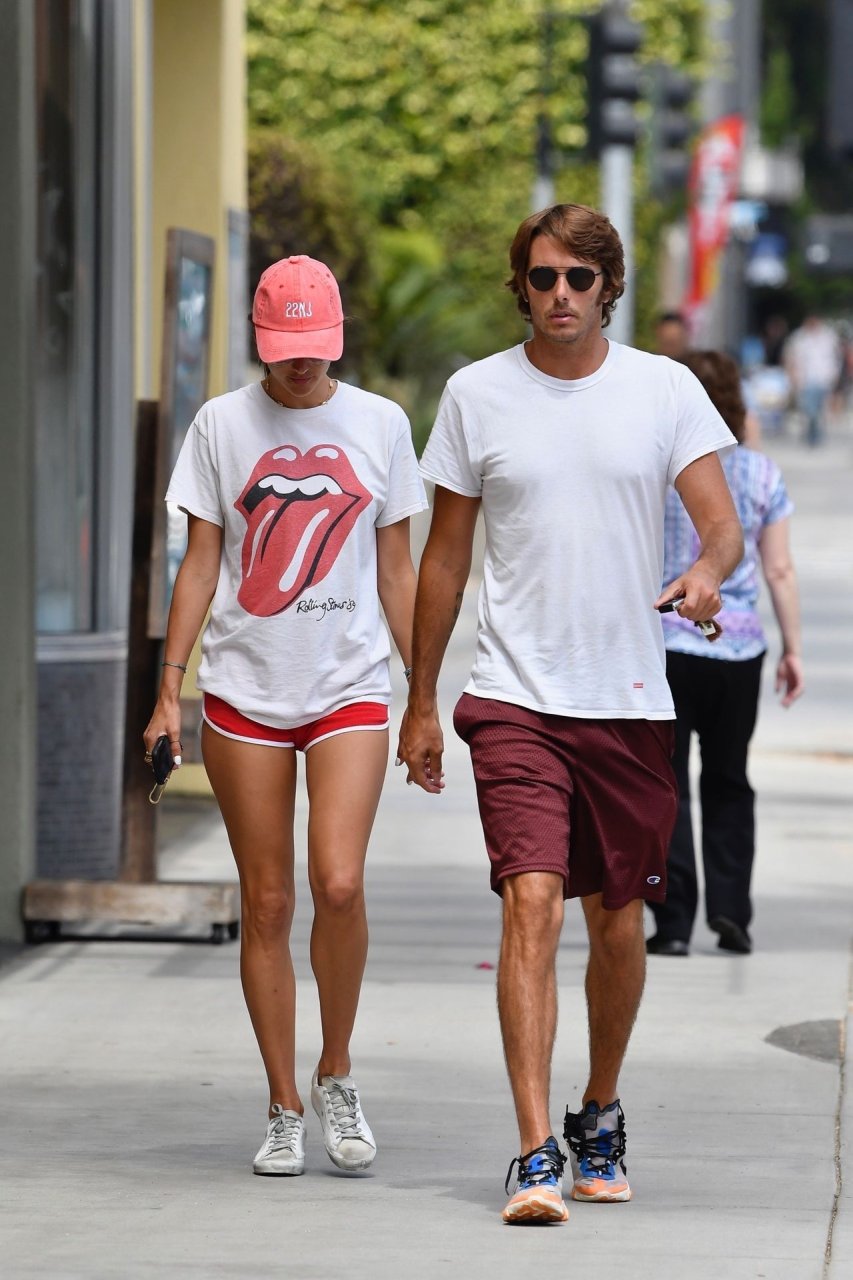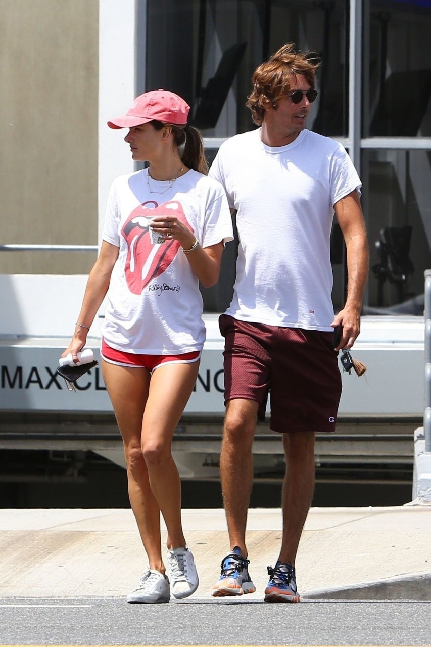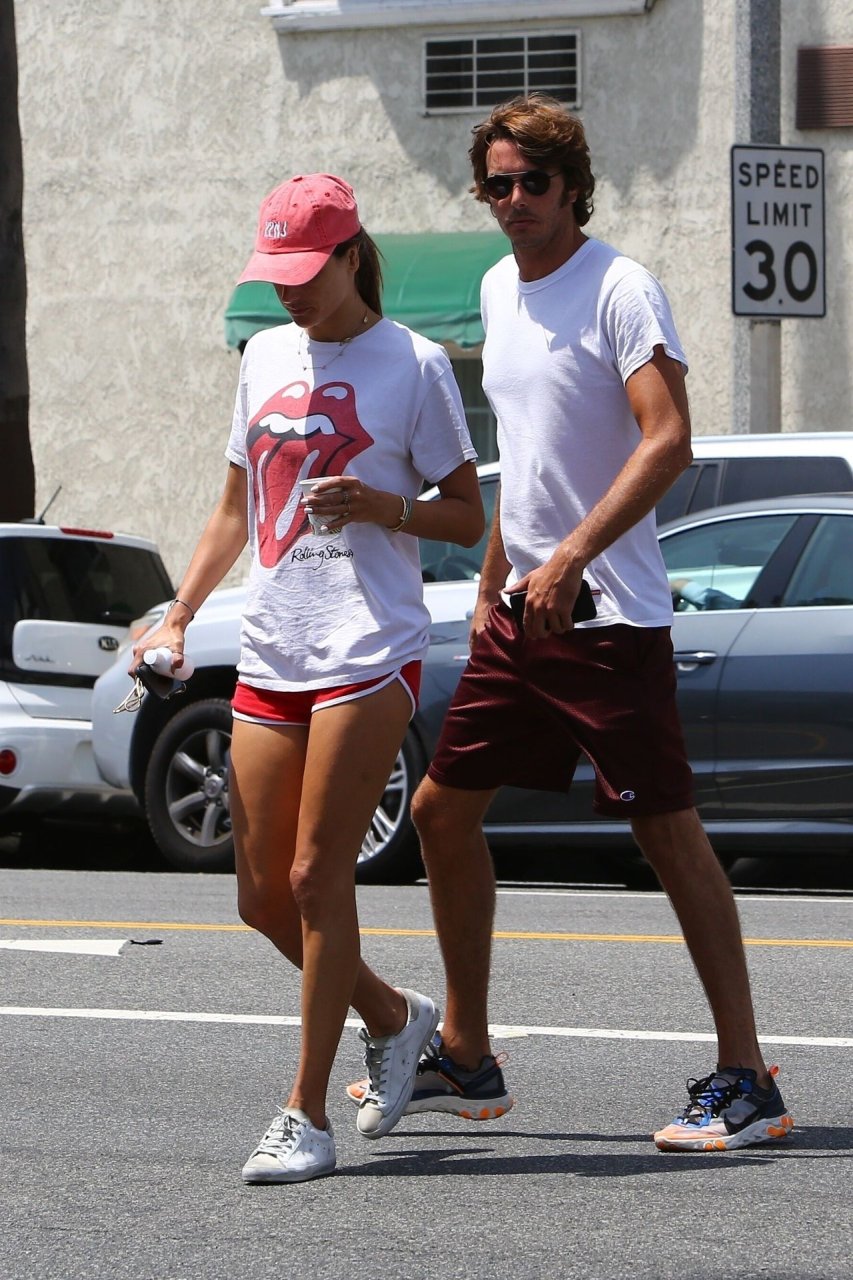 La supermodèle brésilienne Alessandra Ambrosio et son compagnon Nicolo Oddi se rendent déjeuner à Santa Monica chez Tocaya Organica, le 22/08/2019. Alessandra porte un tee-shirt des Rolling Stones avec un short rouge très court et un chapeau rouge pour sa sortie déjeuner.