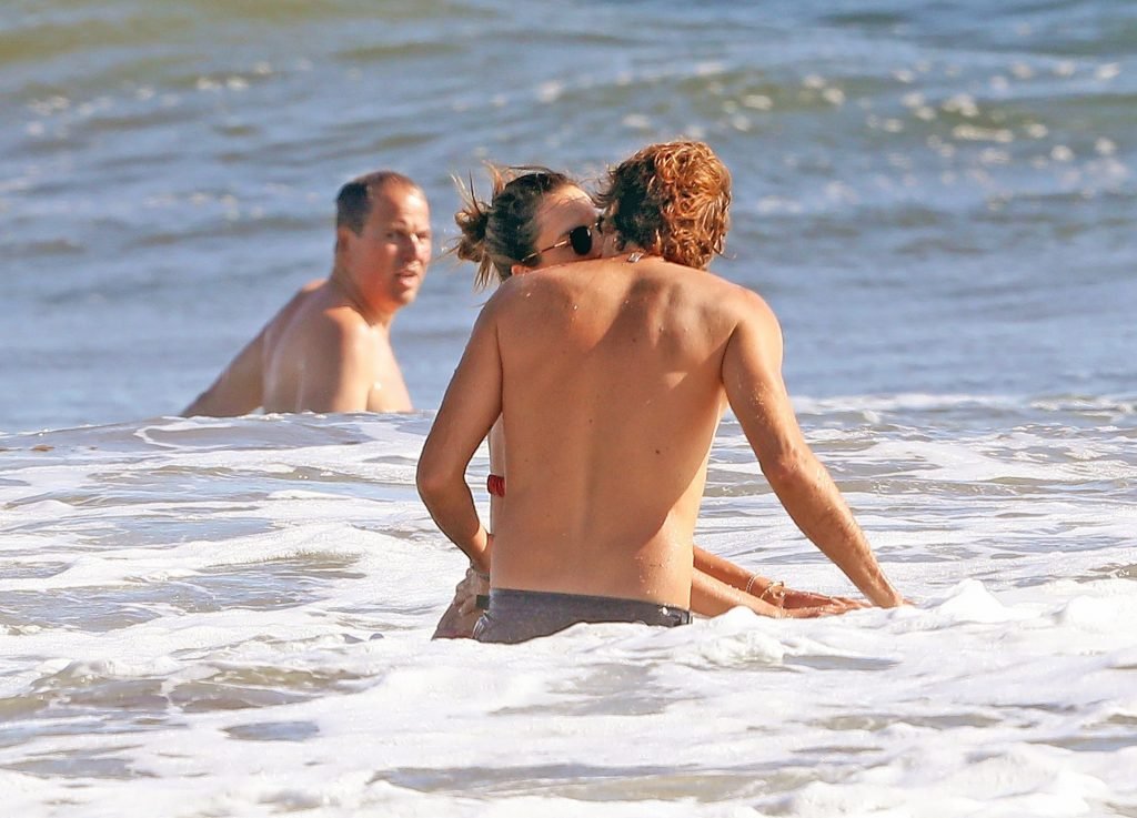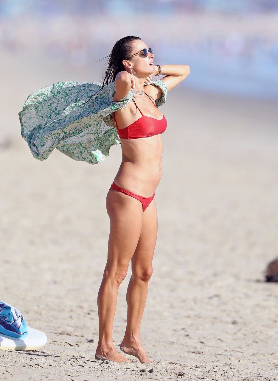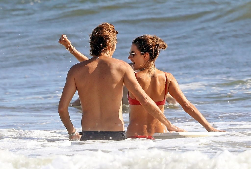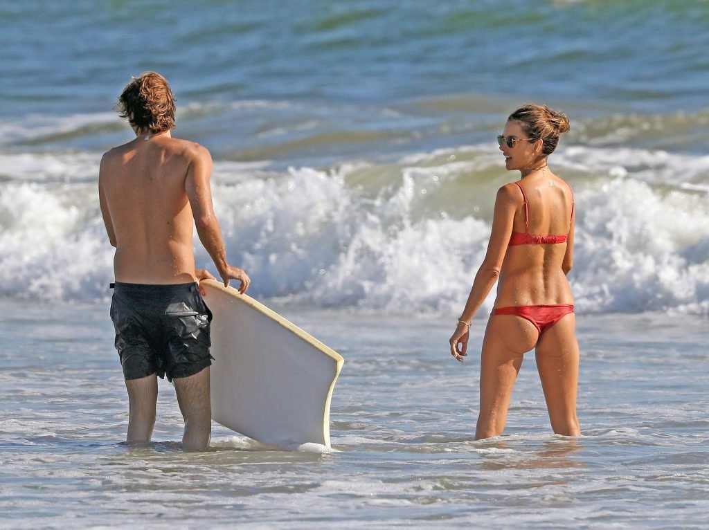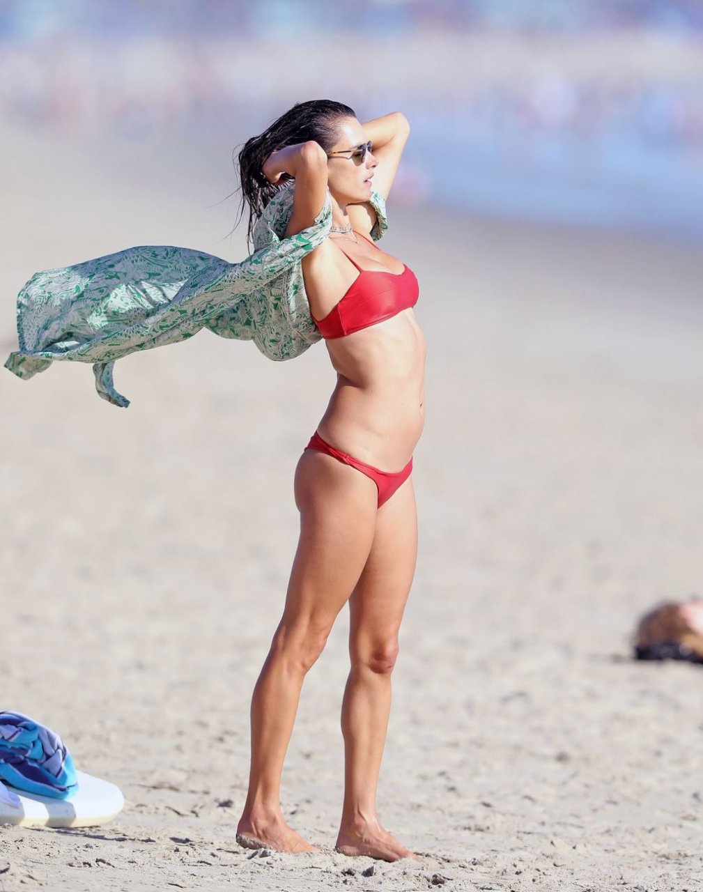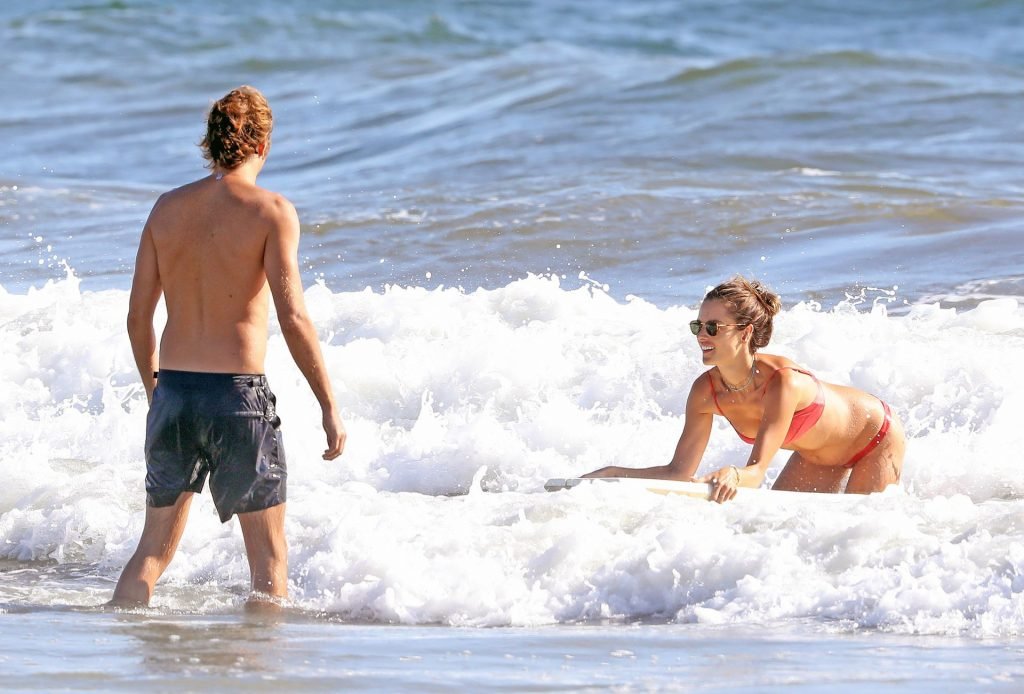 EXCLUSIF : Alessandra Ambrosio fait battre les cœurs dans un bikini rouge alors qu’elle gambade lors d’une chaude journée d’été à Malibu avec son petit ami Nicolo Oddi, 31/08/2019. Le mannequin Victoria’s Secret de 38 ans affichait un large sourire en jouant avec une planche de bodyboard sur la plage.