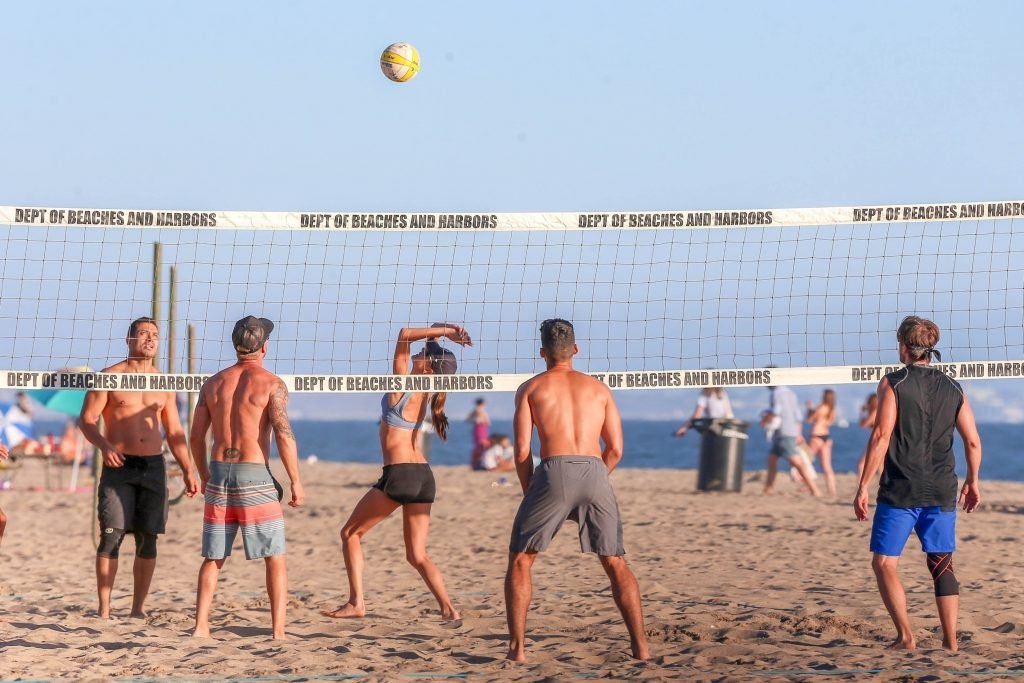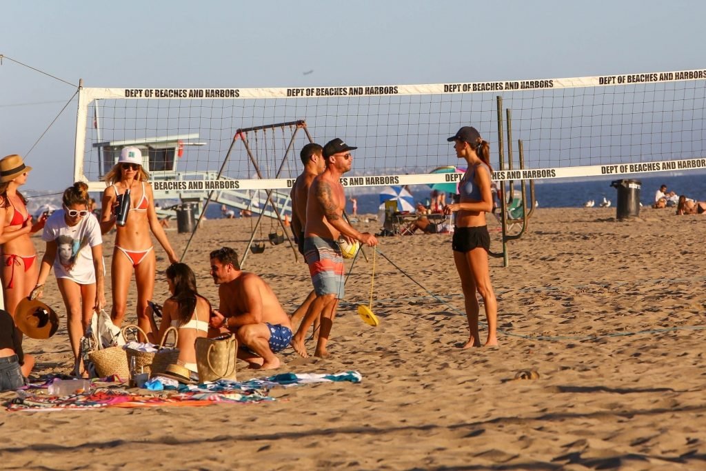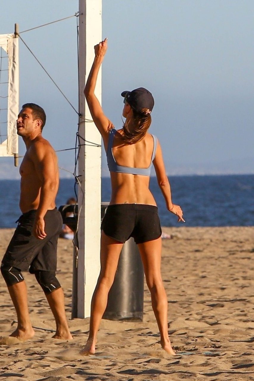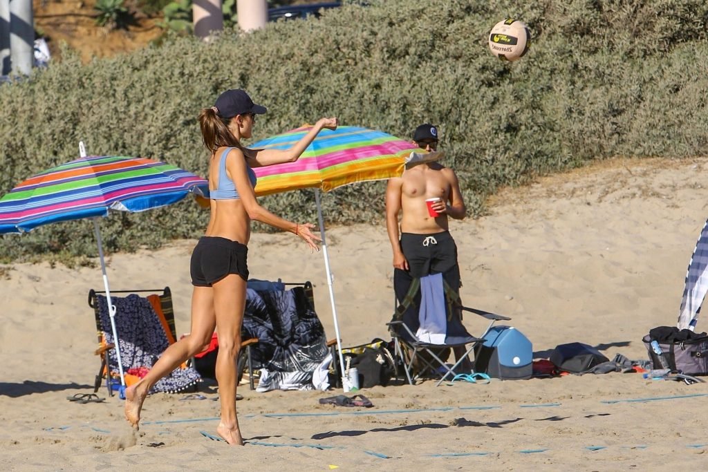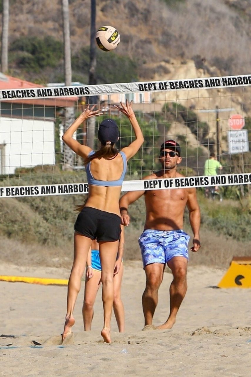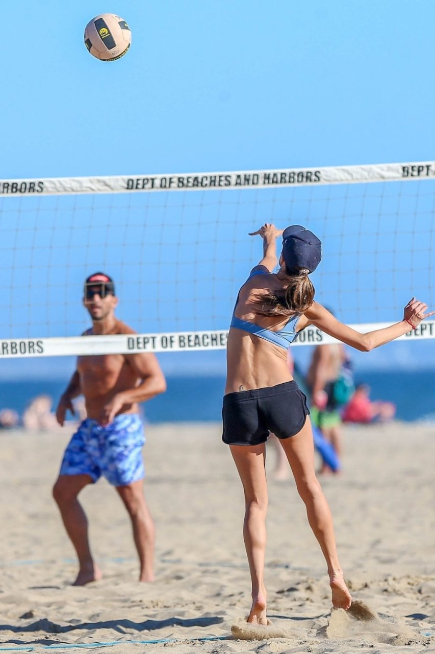 Le mannequin Alessandra Ambrosio et ses amis jouaient au volley-ball sur la plage samedi après-midi à Santa Monica, le 16/09/2018. Le mannequin opte pour un short de sport avec son haut de bikini lorsqu’il est temps de jouer sérieusement au volley-ball.