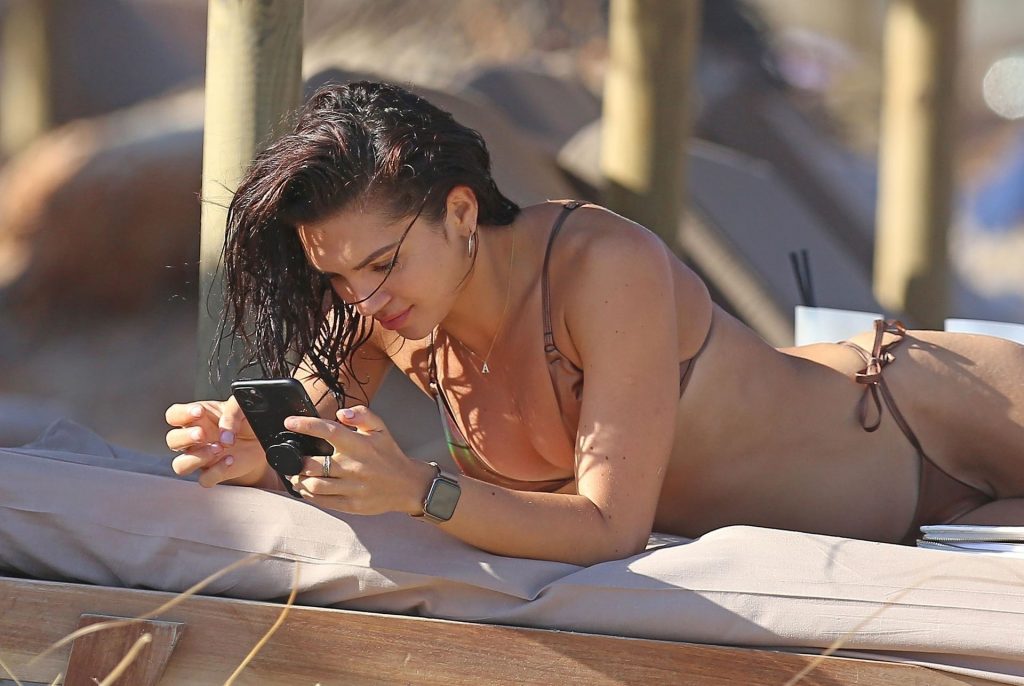 La star sexy et sensuelle offre un spectacle brûlant en portant un petit bikini révélant son décolleté alors qu’elle posait pour quelques selfies, profitant du soleil espagnol avec son mystérieux compagnon torse nu qui se détendait avec elle sur le transat.