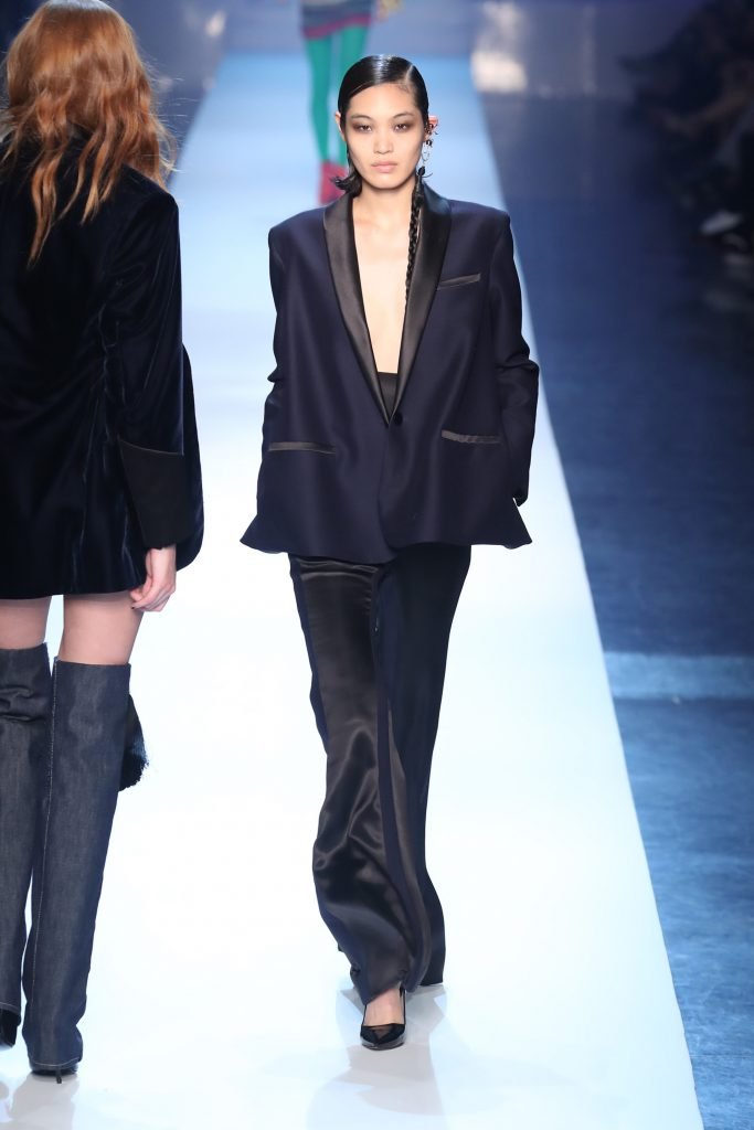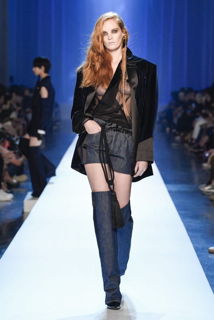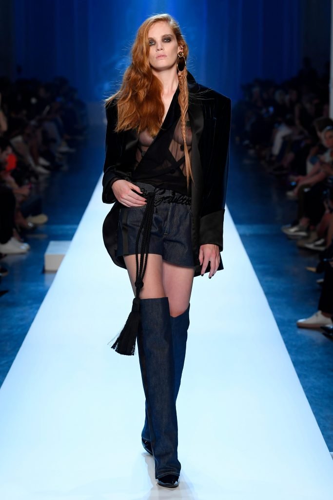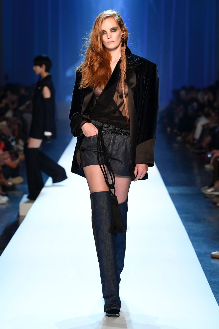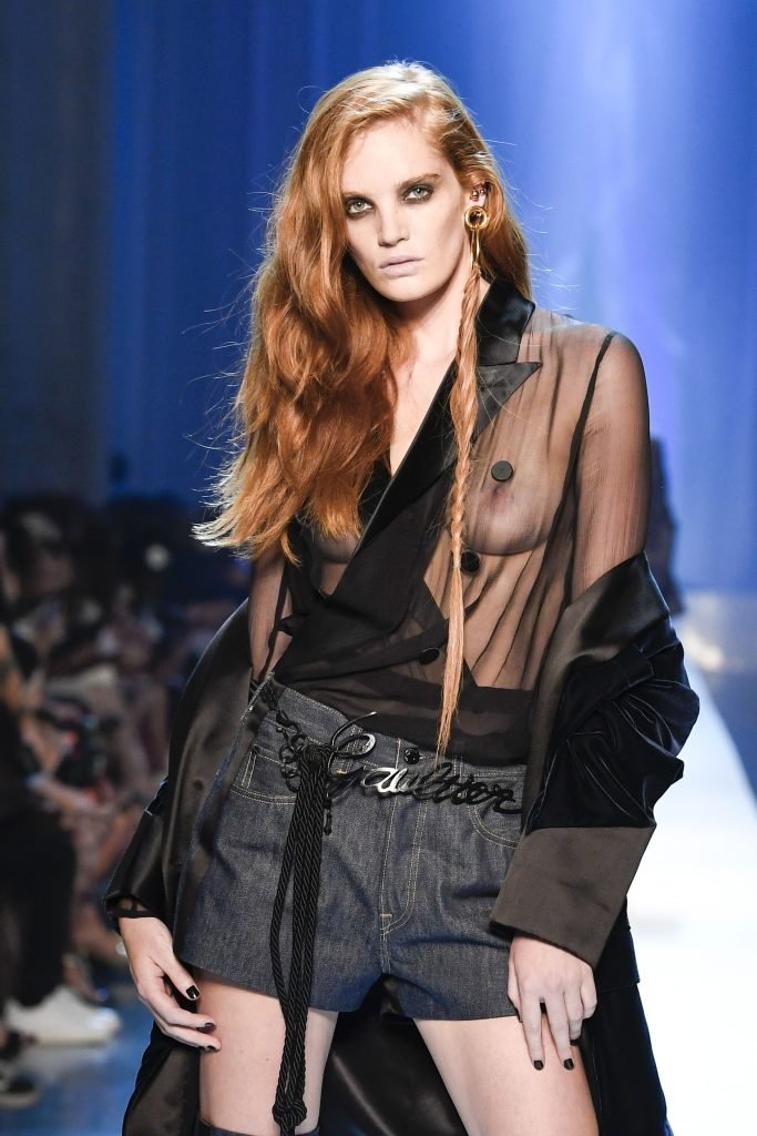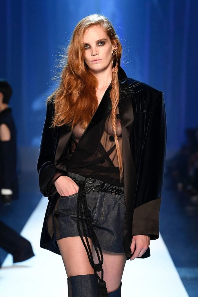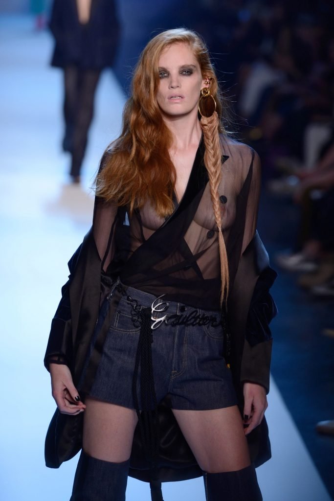Le mannequin Alexina Graham défile sans soutien-gorge lors de la Semaine de la Mode Haute Couture Automne/Hiver 2018/19 de Jean-Paul Gaultier à Paris, France, le 07/04/2018.