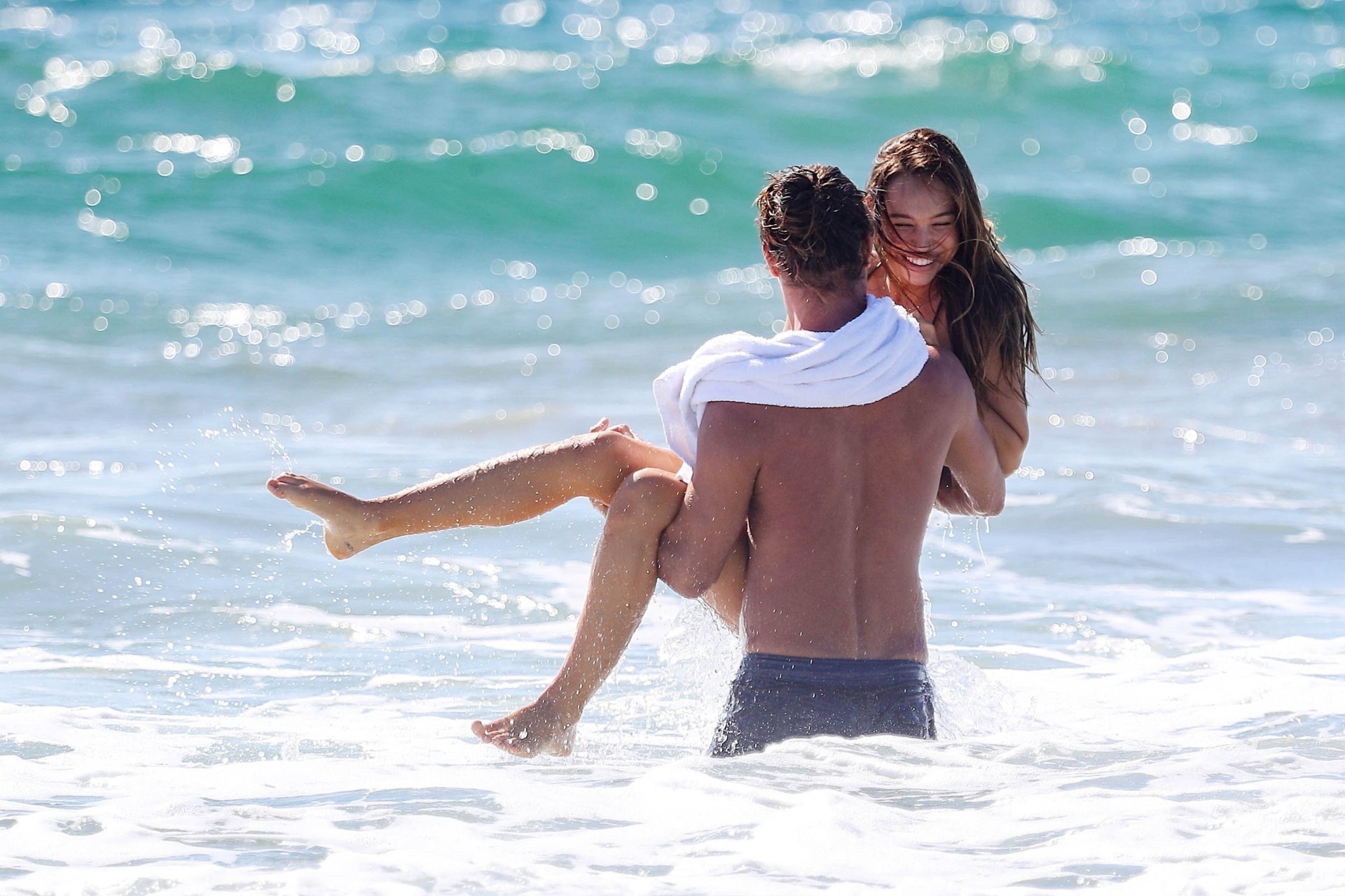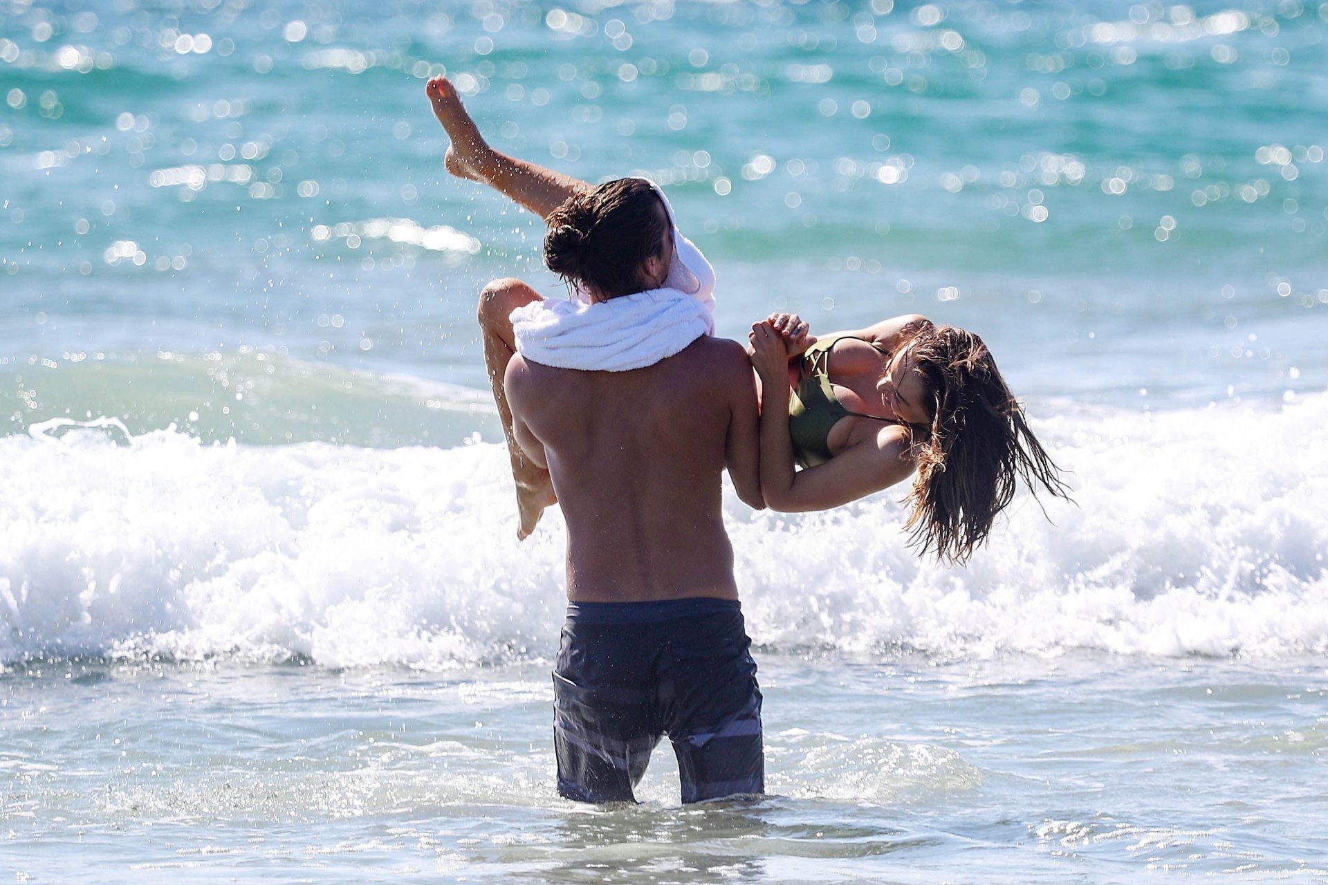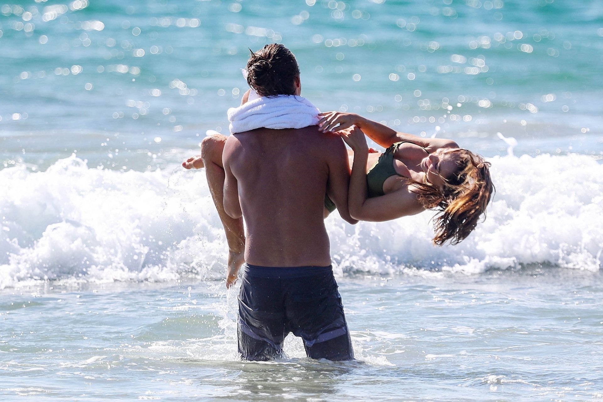 Le candidat de “Dancing With The Stars” Alexis Ren passe une journée très heureuse à la plage avec un homme mystérieux à Santa Monica, le 30/09/2018. Le mannequin de 21 ans montre son physique tonique en portant un bikini vert.