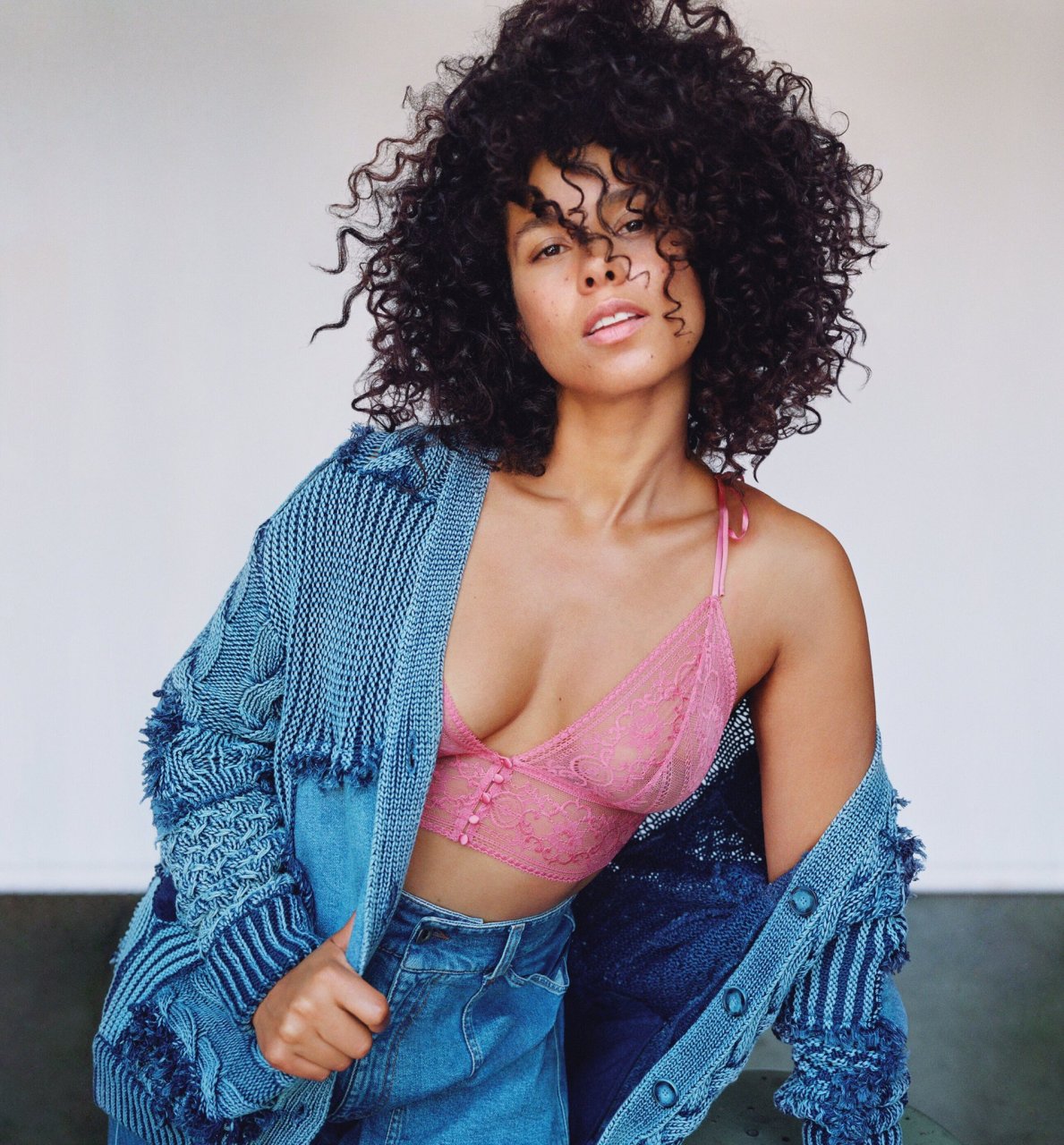 Alicia Keys pose en lingerie rose en dentelle pour la séance photo Stella McCartney Ophelia Whistling, 25/09/2017. Alicia Augello Cook est une chanteuse, auteure-compositrice, productrice de disques, pianiste et actrice américaine. Âge : 36 ans.