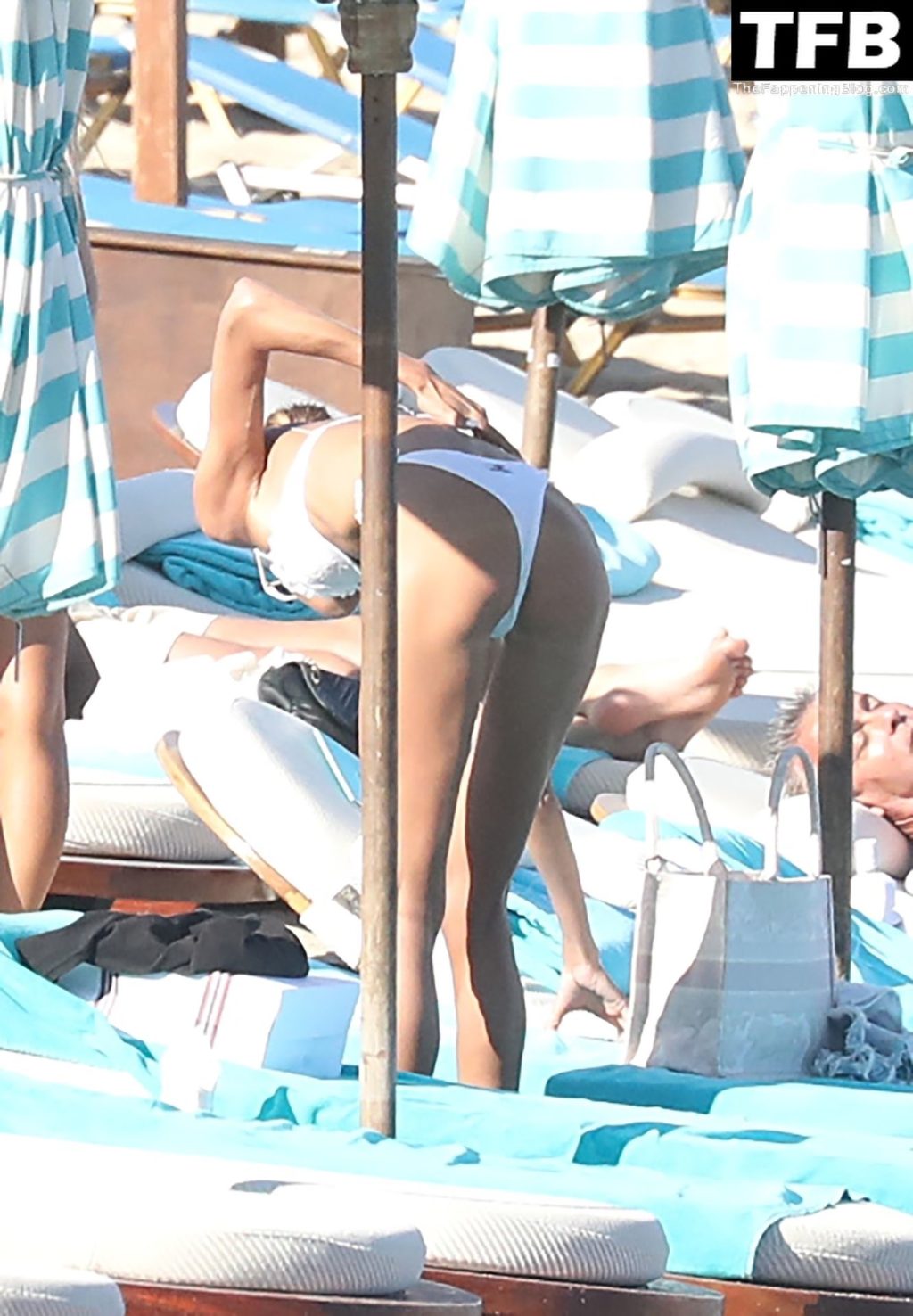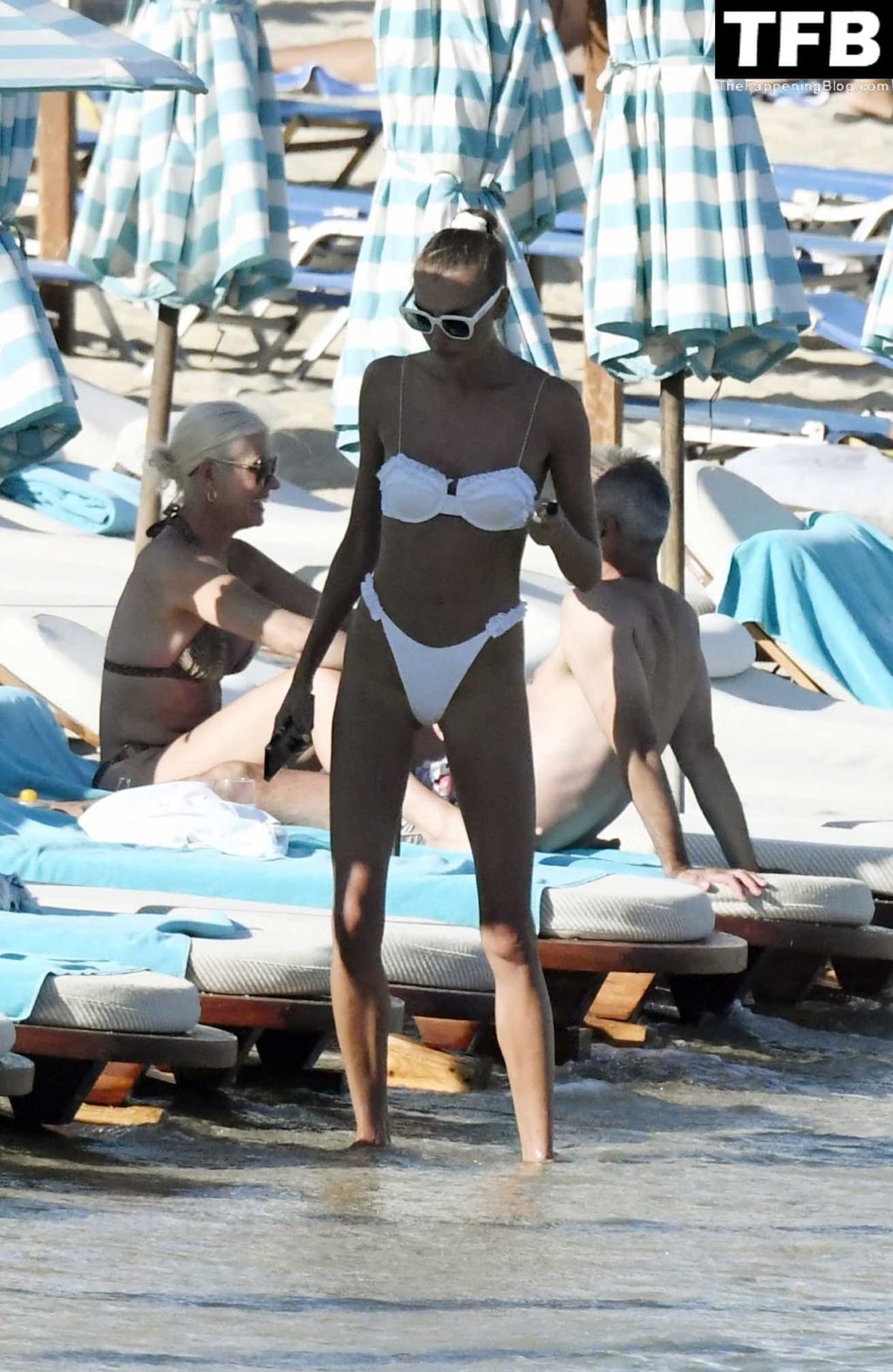 Malgré les difficultés dans son pays natal en Ukraine, le top modèle ukrainien Alina Baikova parvient à se détendre sous le soleil grec vêtue d’un tout petit bikini blanc et de lunettes de soleil blanches, mettant en valeur son corps de mannequin sur la plage, 16/06/2022.