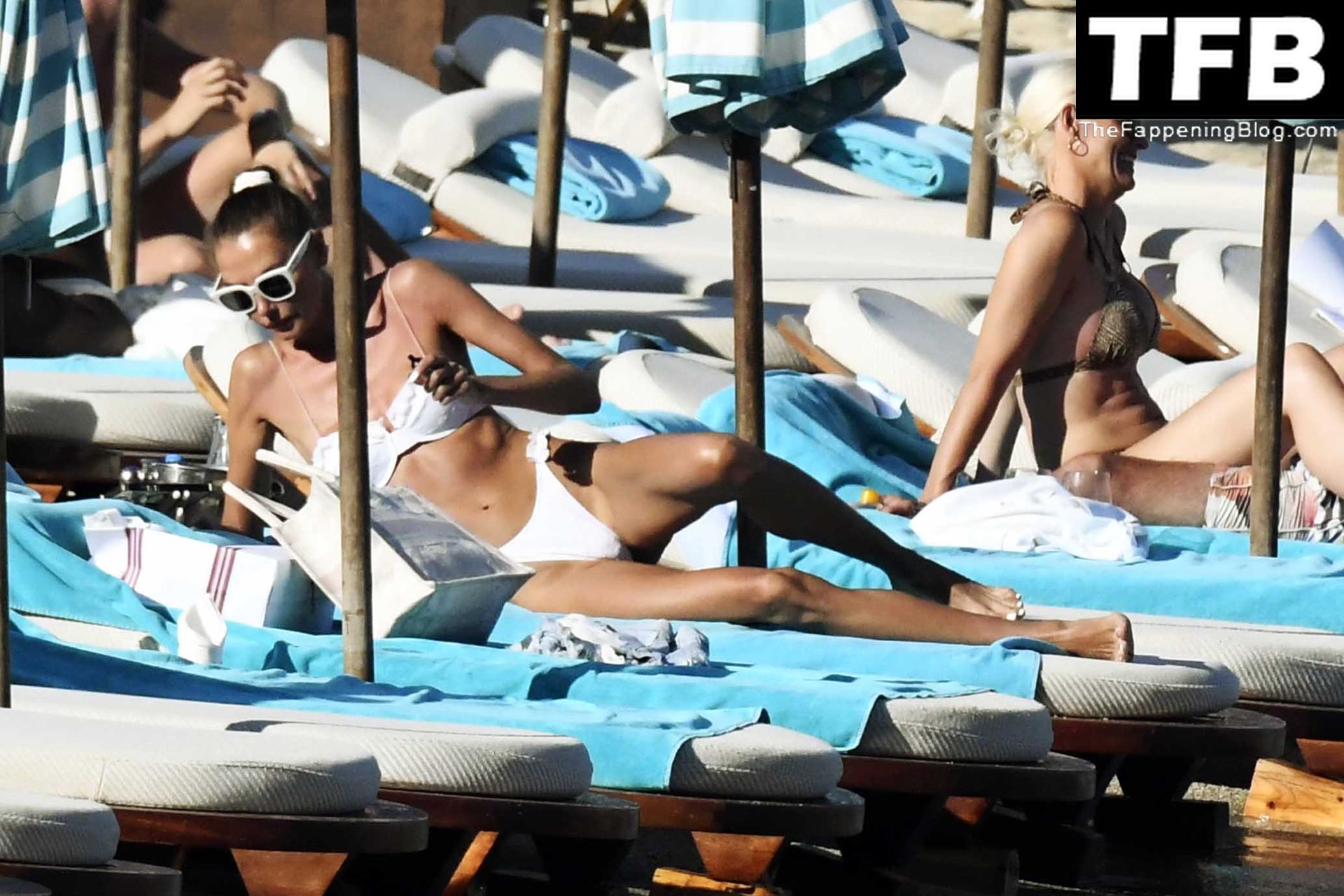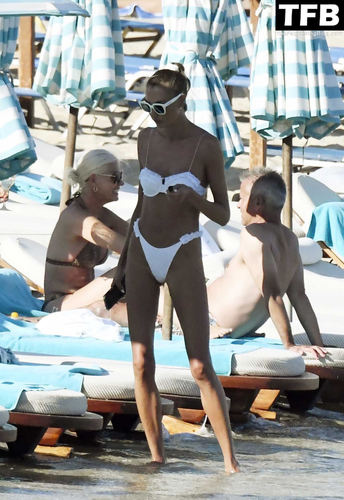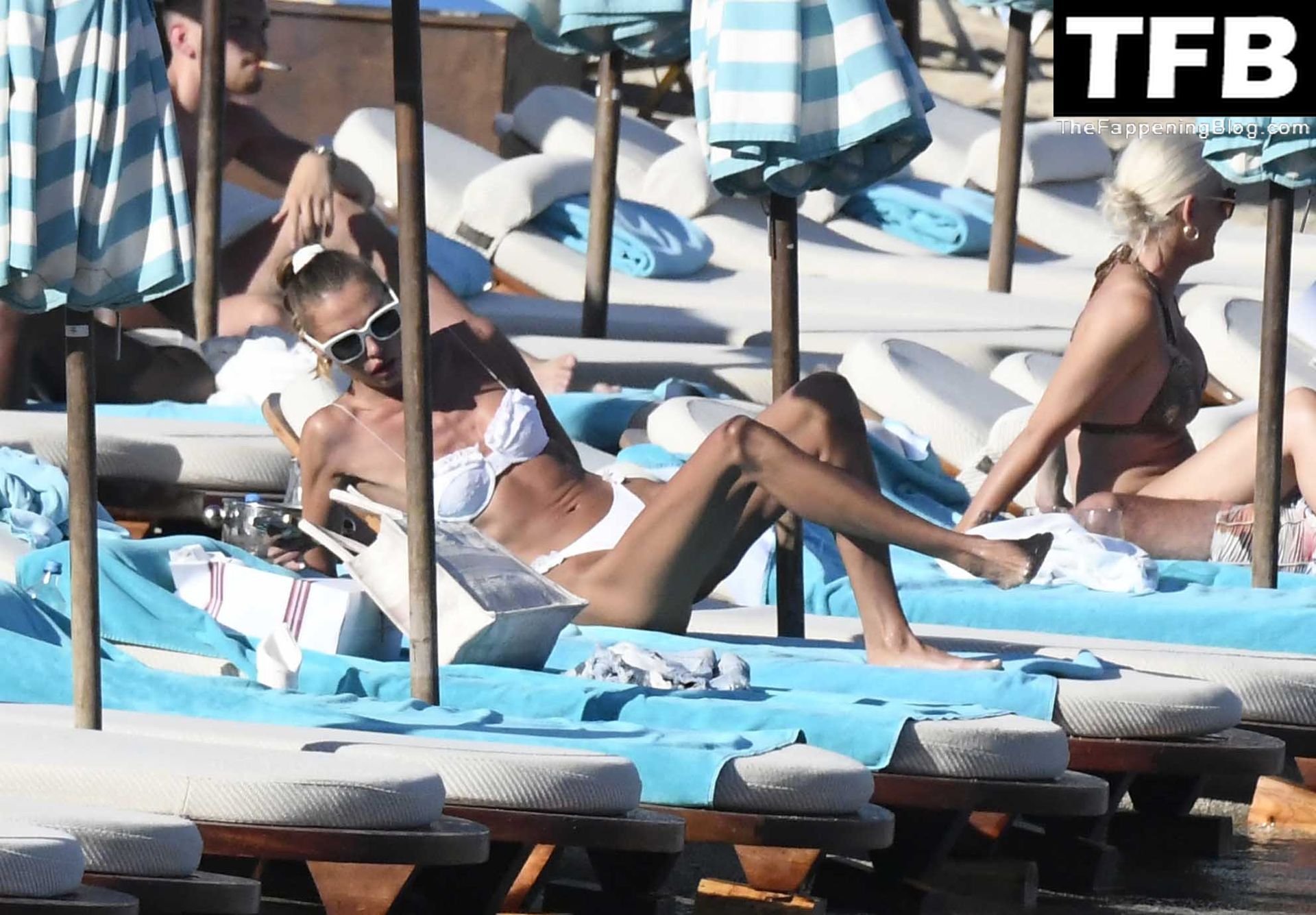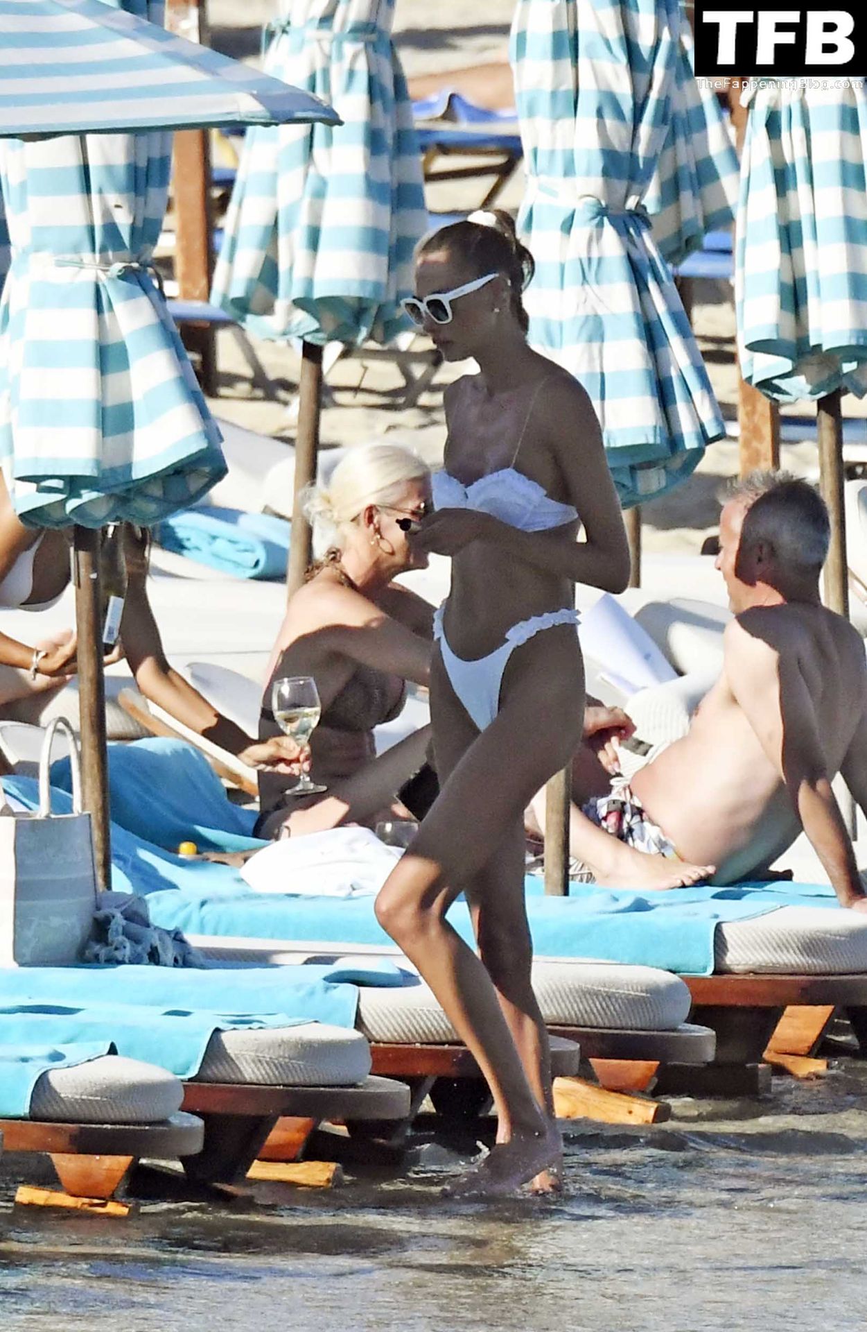 Malgré les difficultés dans son pays natal en Ukraine, le top modèle ukrainien Alina Baikova parvient à se détendre sous le soleil grec vêtue d’un tout petit bikini blanc et de lunettes de soleil blanches, mettant en valeur son corps de mannequin sur la plage, 16/06/2022.