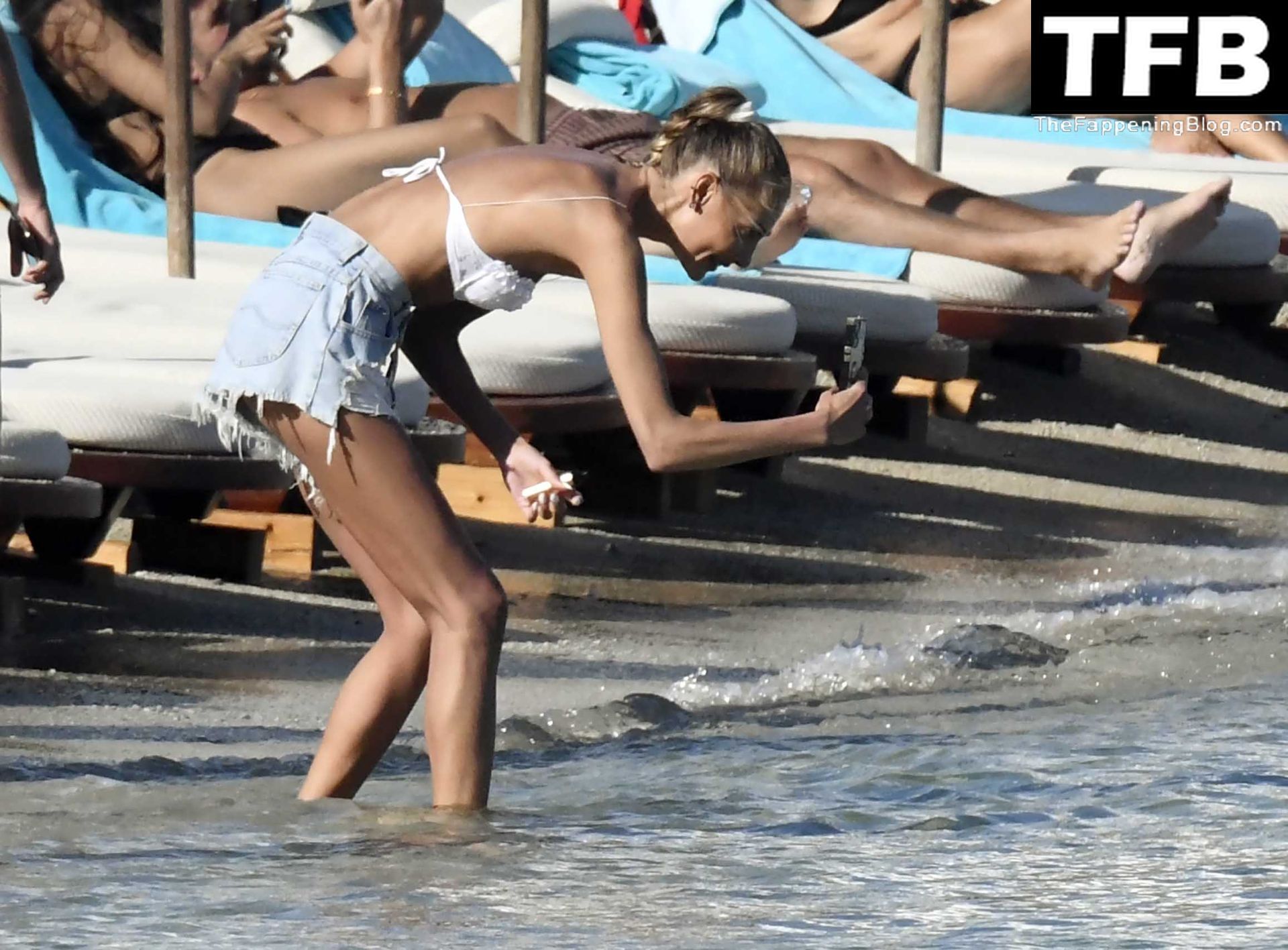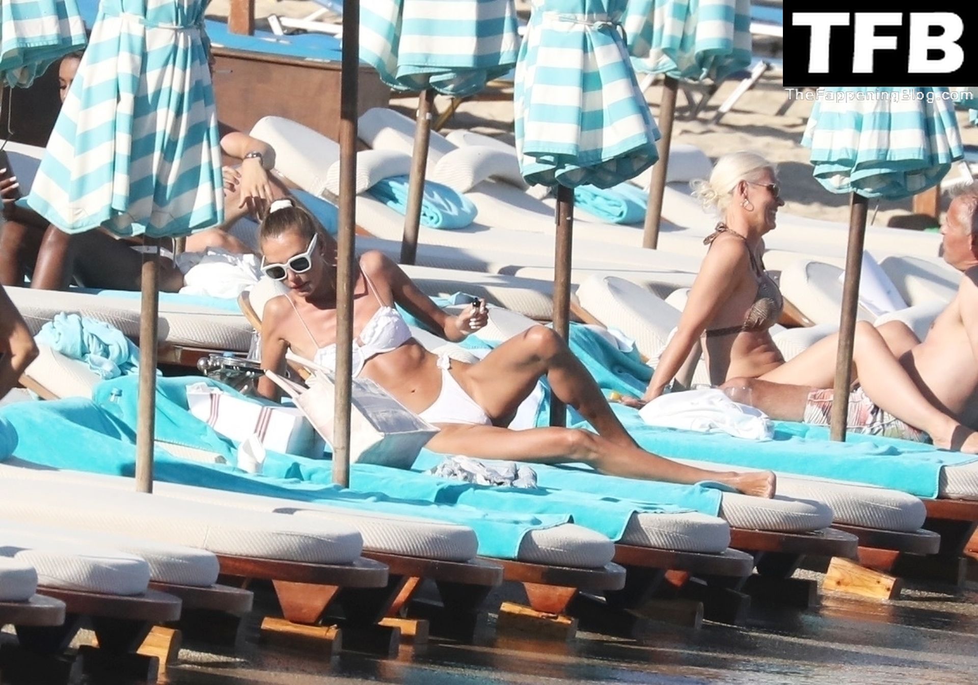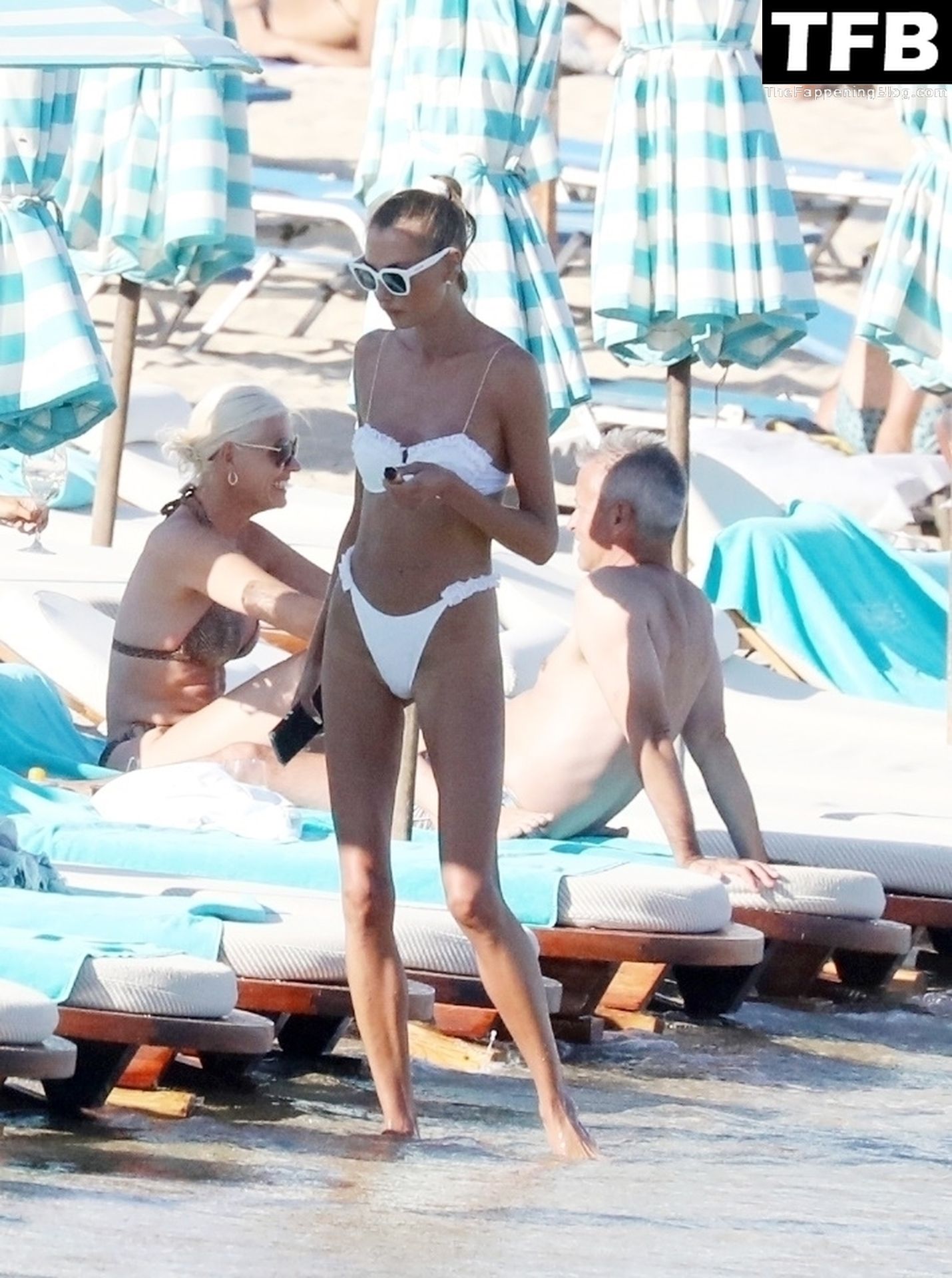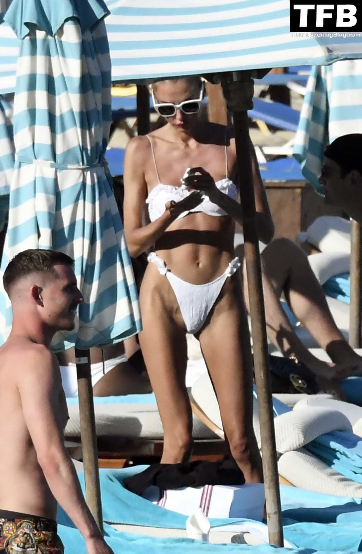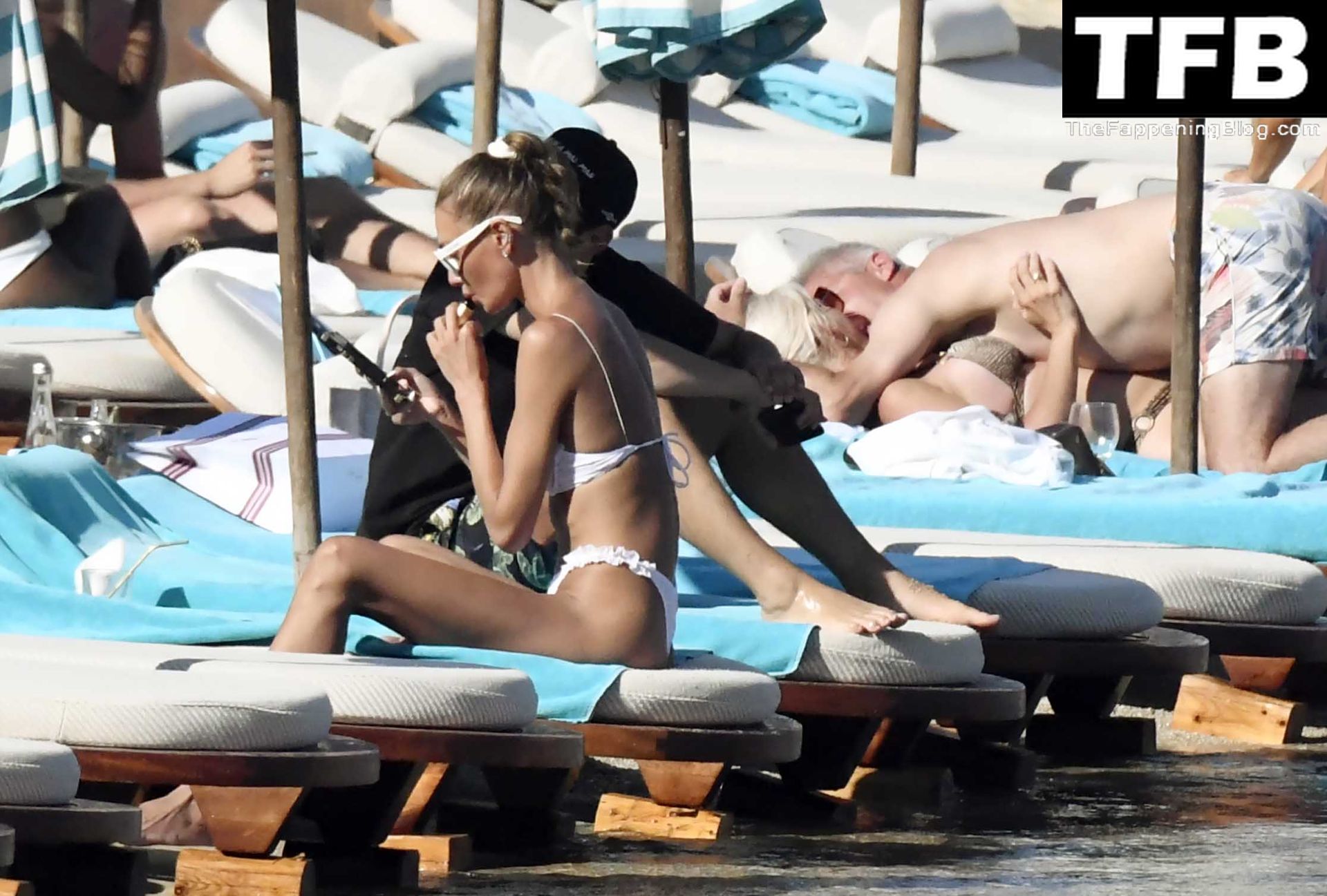 Malgré les difficultés dans son pays natal en Ukraine, le top modèle ukrainien Alina Baikova parvient à se détendre sous le soleil grec vêtue d’un tout petit bikini blanc et de lunettes de soleil blanches, mettant en valeur son corps de mannequin sur la plage, 16/06/2022.