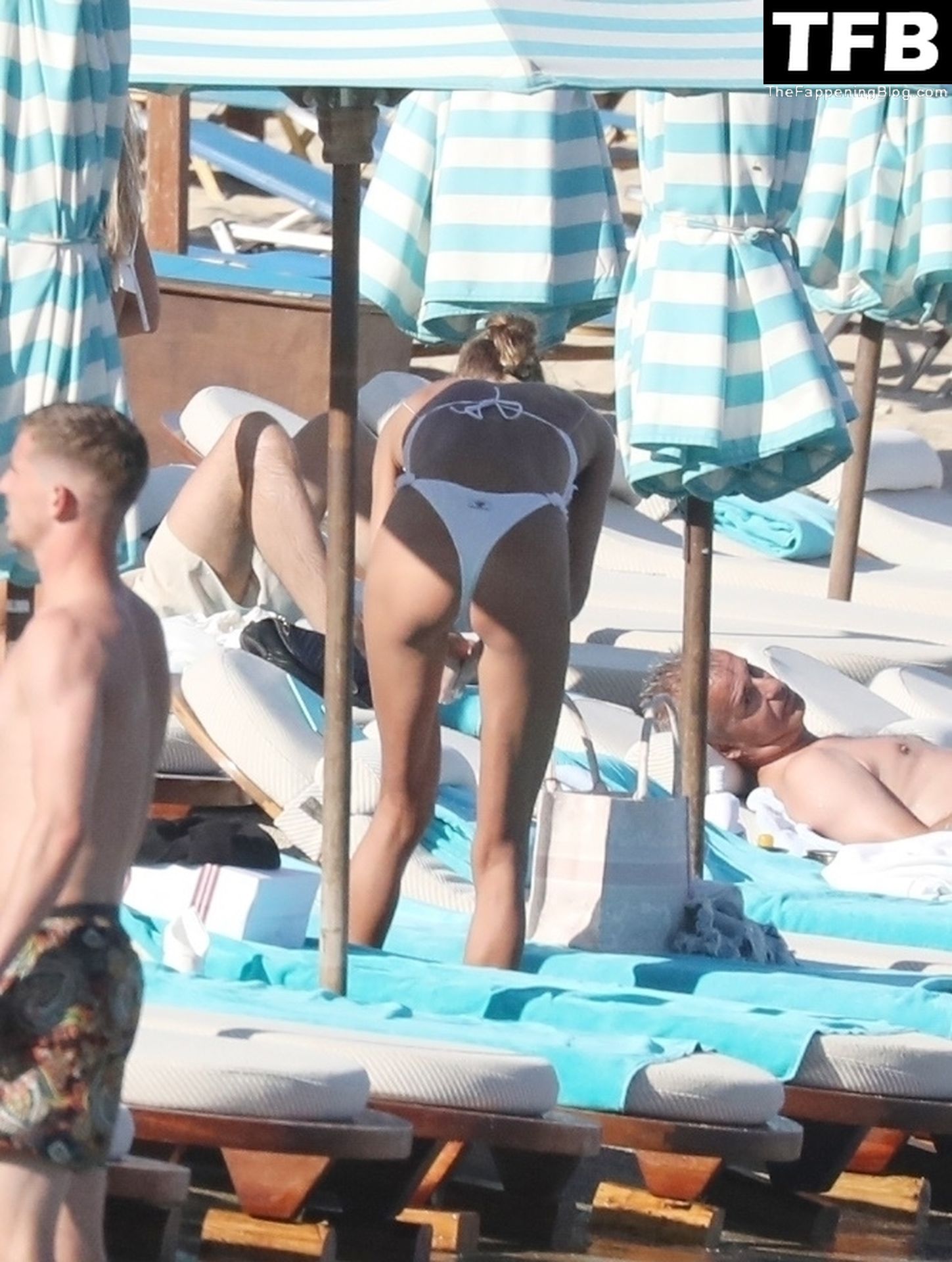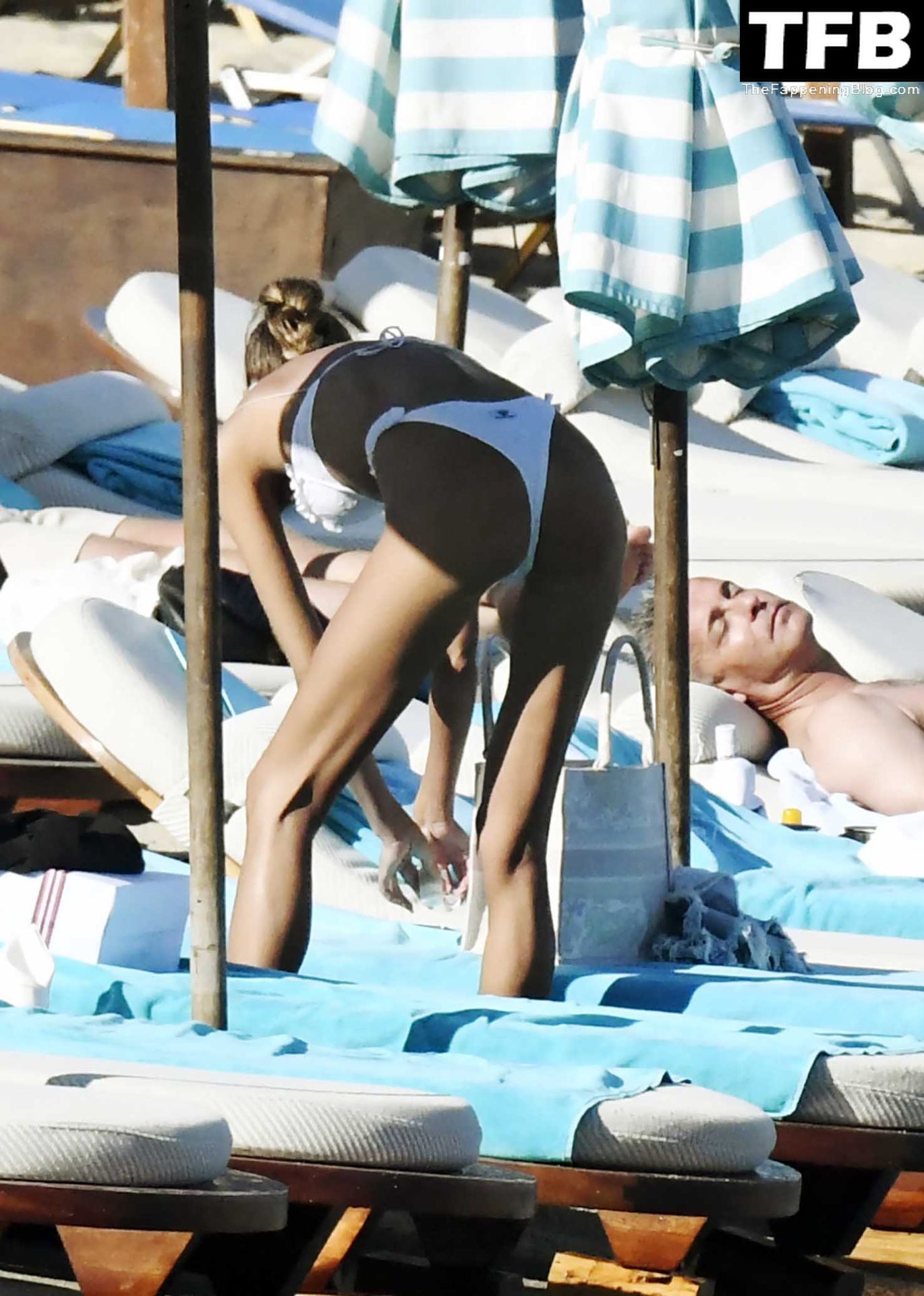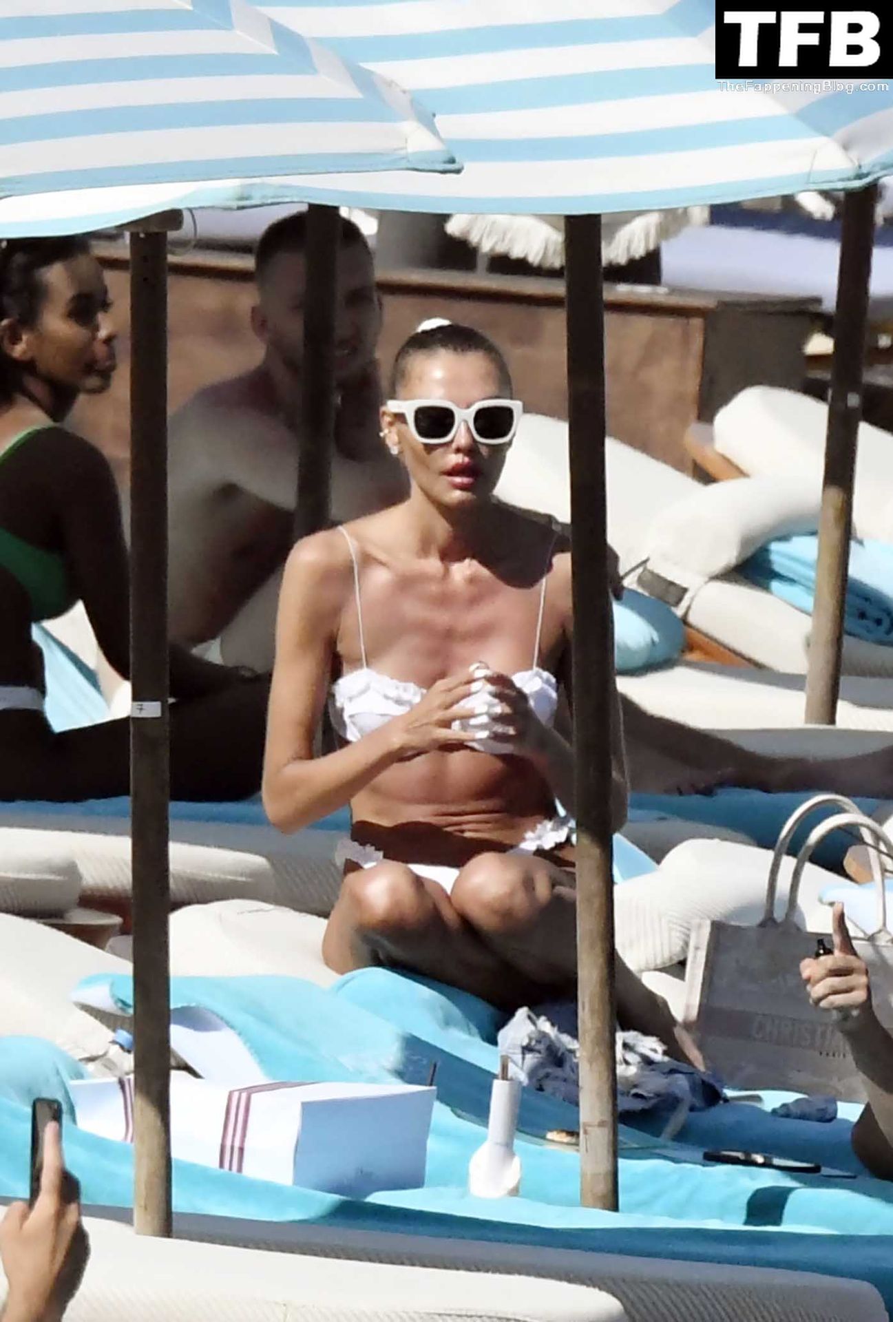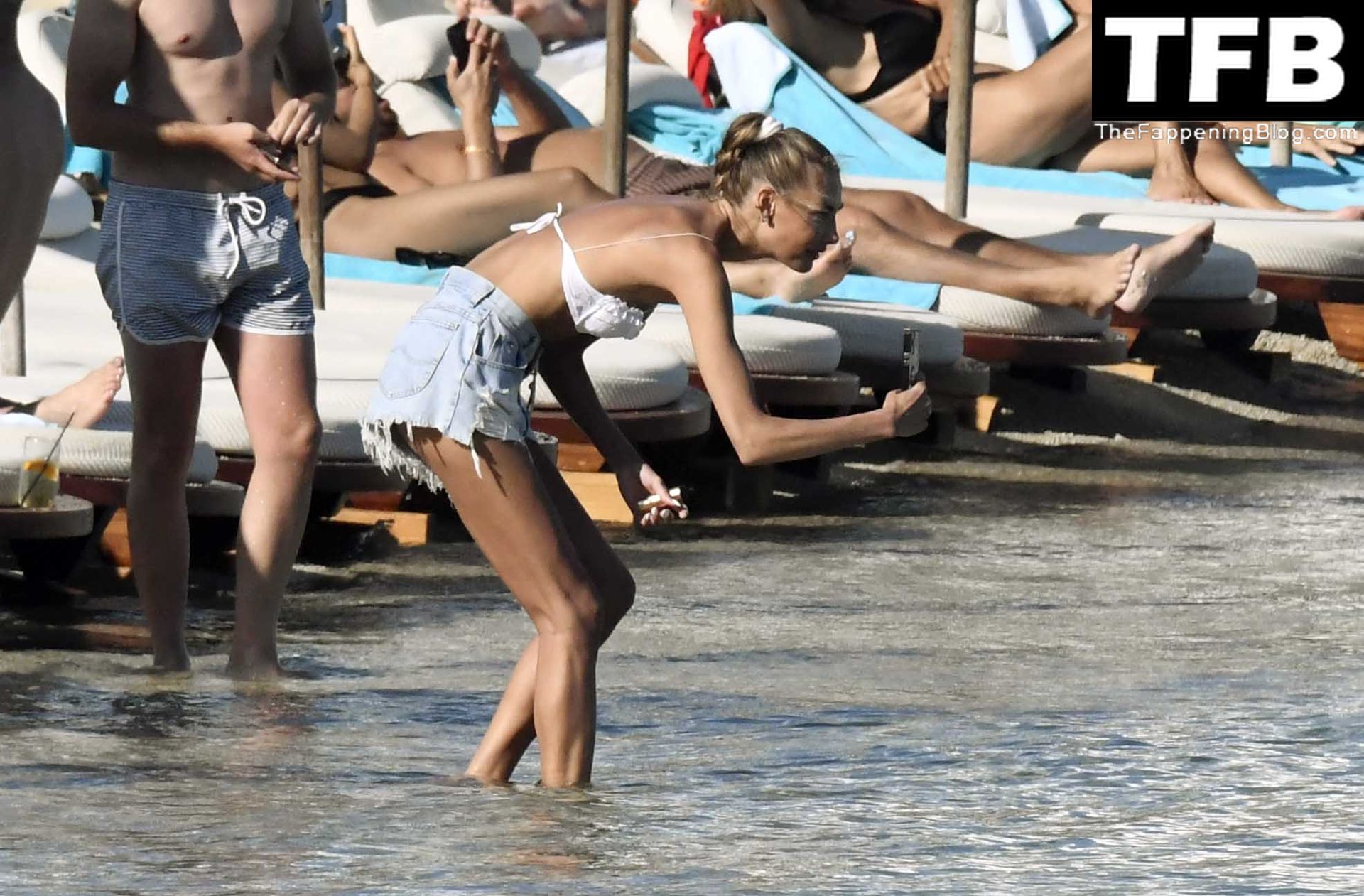 Malgré les difficultés dans son pays natal en Ukraine, le top modèle ukrainien Alina Baikova parvient à se détendre sous le soleil grec vêtue d’un tout petit bikini blanc et de lunettes de soleil blanches, mettant en valeur son corps de mannequin sur la plage, 16/06/2022.