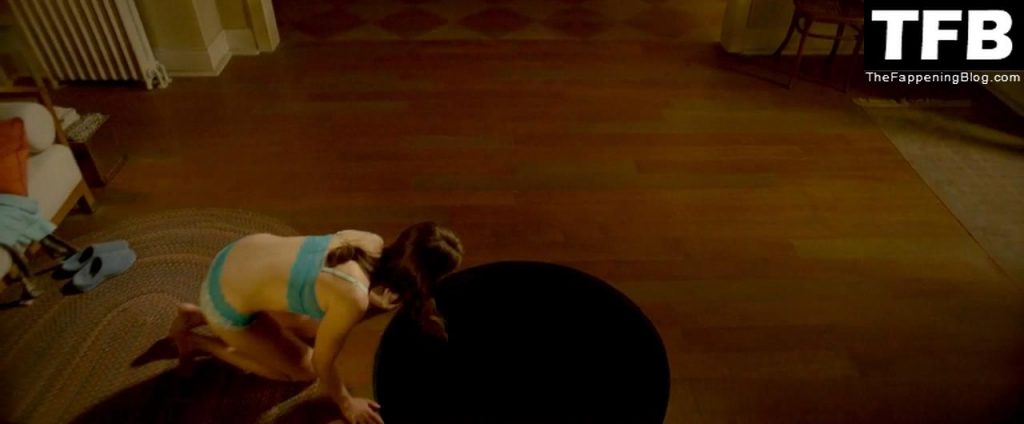 La star du Fappening Alison Brie se tient face à un homme tandis qu’elle se déshabille jusqu’à un soutien-gorge bleu dévoilant son décolleté et un slip assorti. Elle parle un moment avec l’homme en sous-vêtements avant que celui-ci ne disparaisse dans un trou au sol.