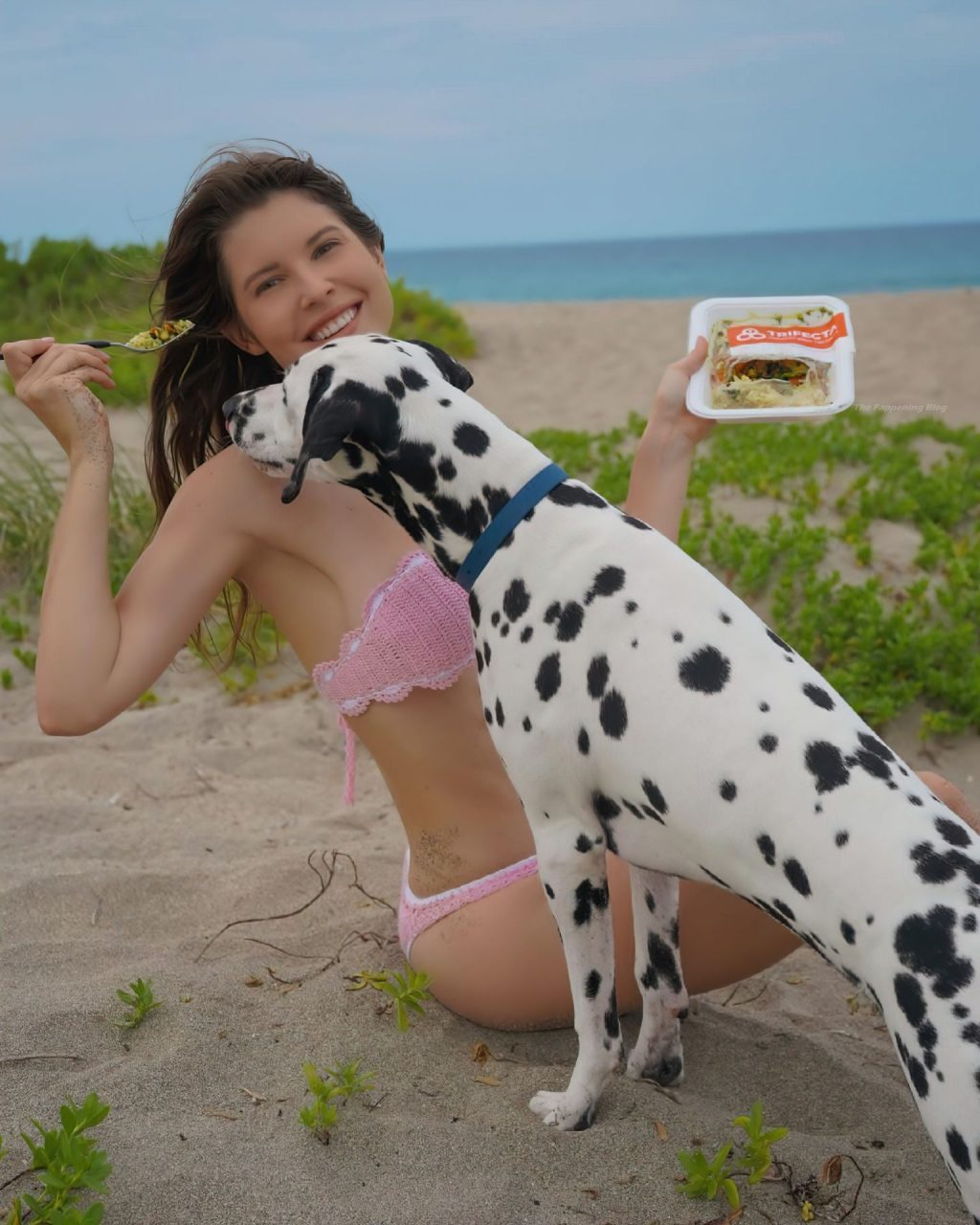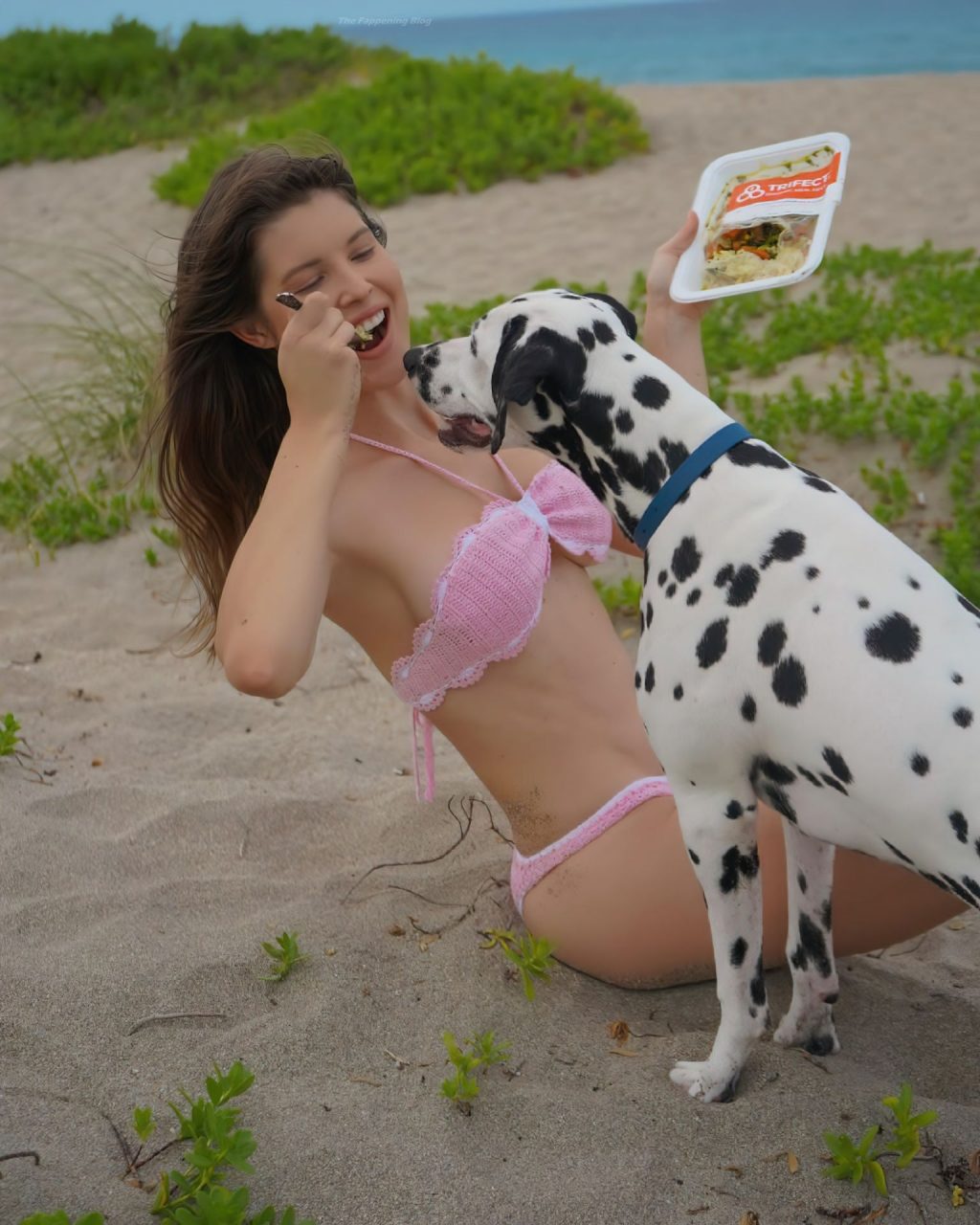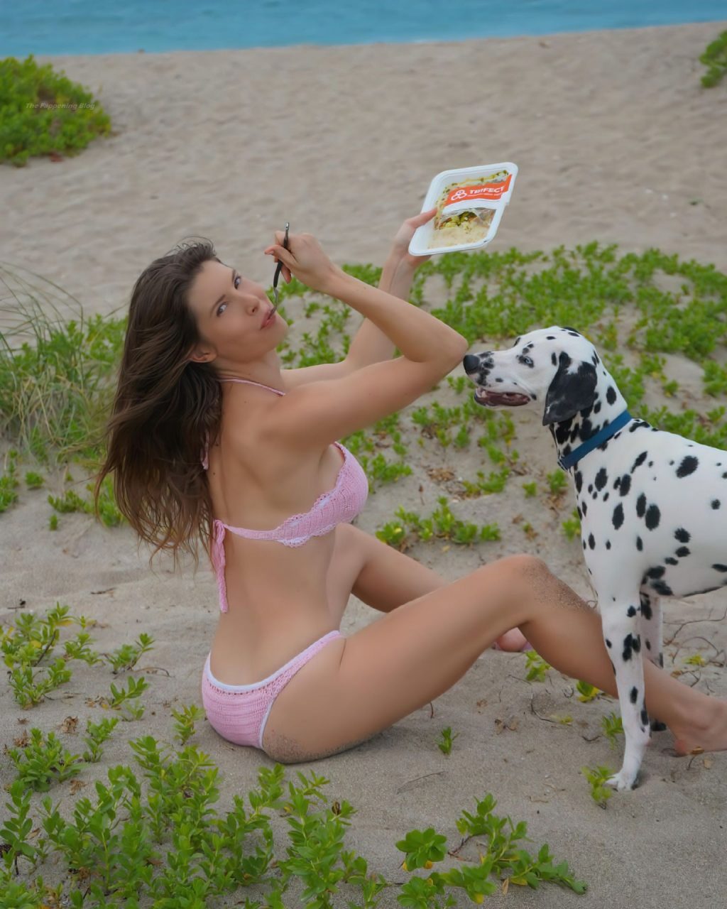 Amanda Cerny profite d’une journée avec son chien sur la plage. Le mannequin affiche son joli fessier et sa taille fine, posant en bikini rose pour une nouvelle photo sur les réseaux sociaux (mai 2021).