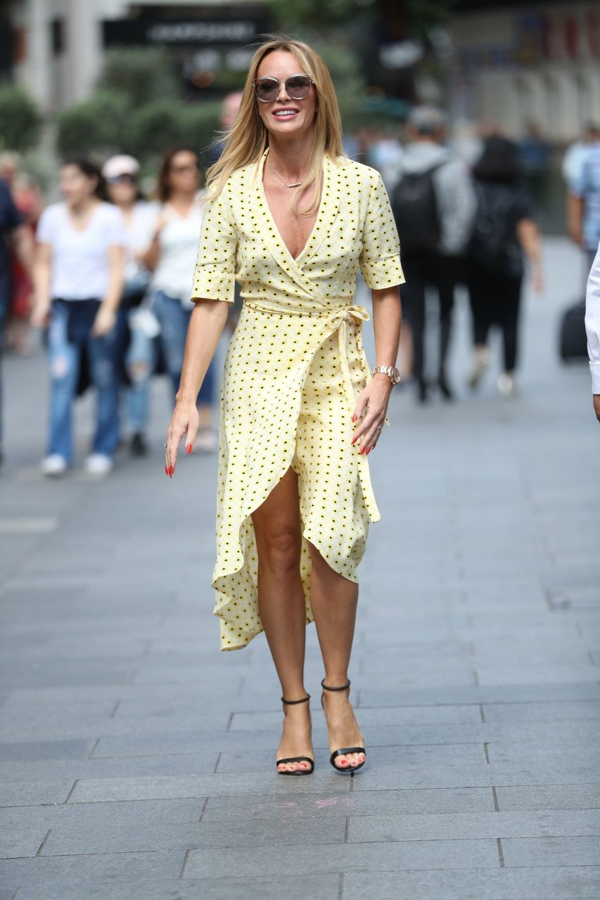 La présentatrice de télévision Amanda Holden dévoile ses longues jambes dans une robe jaune à pois avec une fente haute audacieuse en quittant Heart Radio, Global House à Londres, le 07/08/2019.