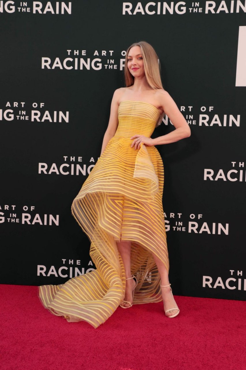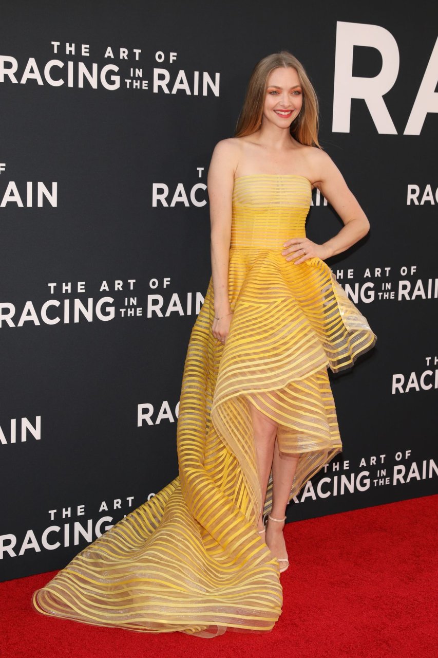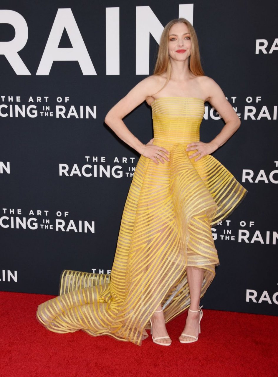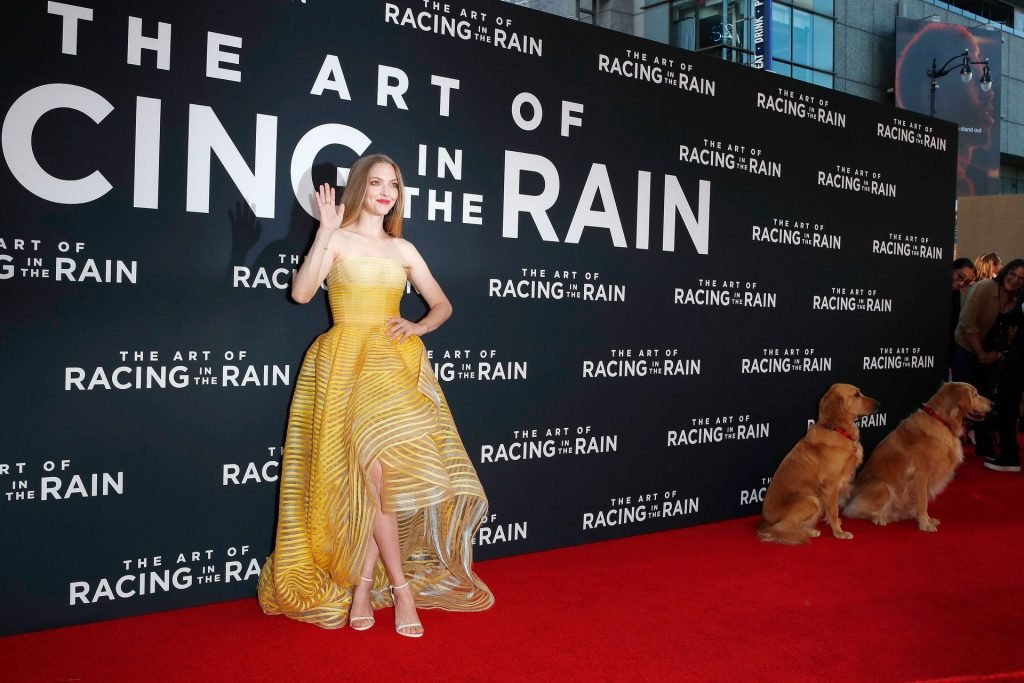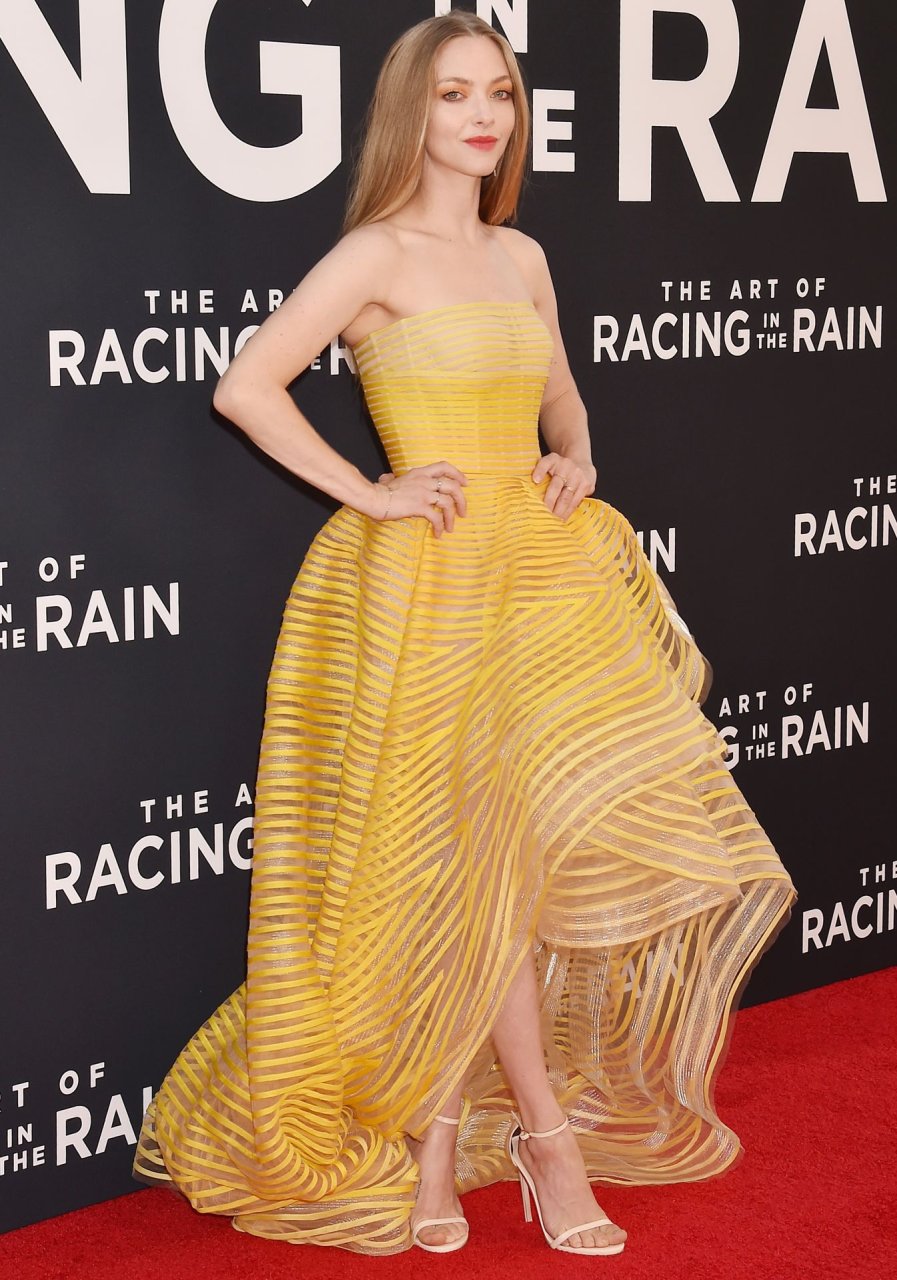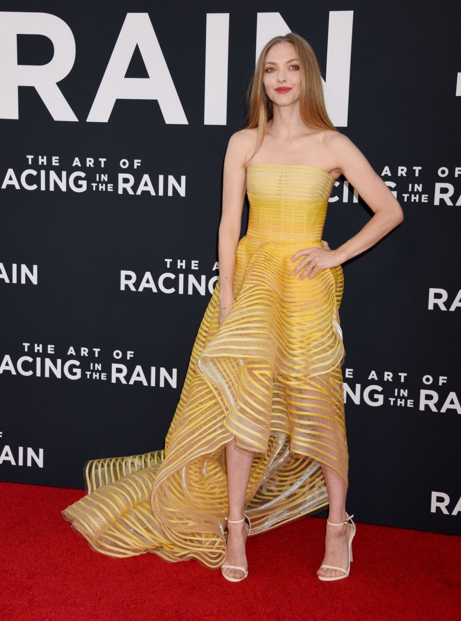 Actrice Amanda Seyfried portant une robe Oscar de la Renta, des talons Stuart Weitzman et des boucles d’oreilles Jennifer Meyer arrive à la première à Los Angeles du film de 20th Century Fox ‘The Art Of Racing In The Rain’ tenue au El Capitan Theatre à Hollywood, Los Angeles, le 01/08/2019.