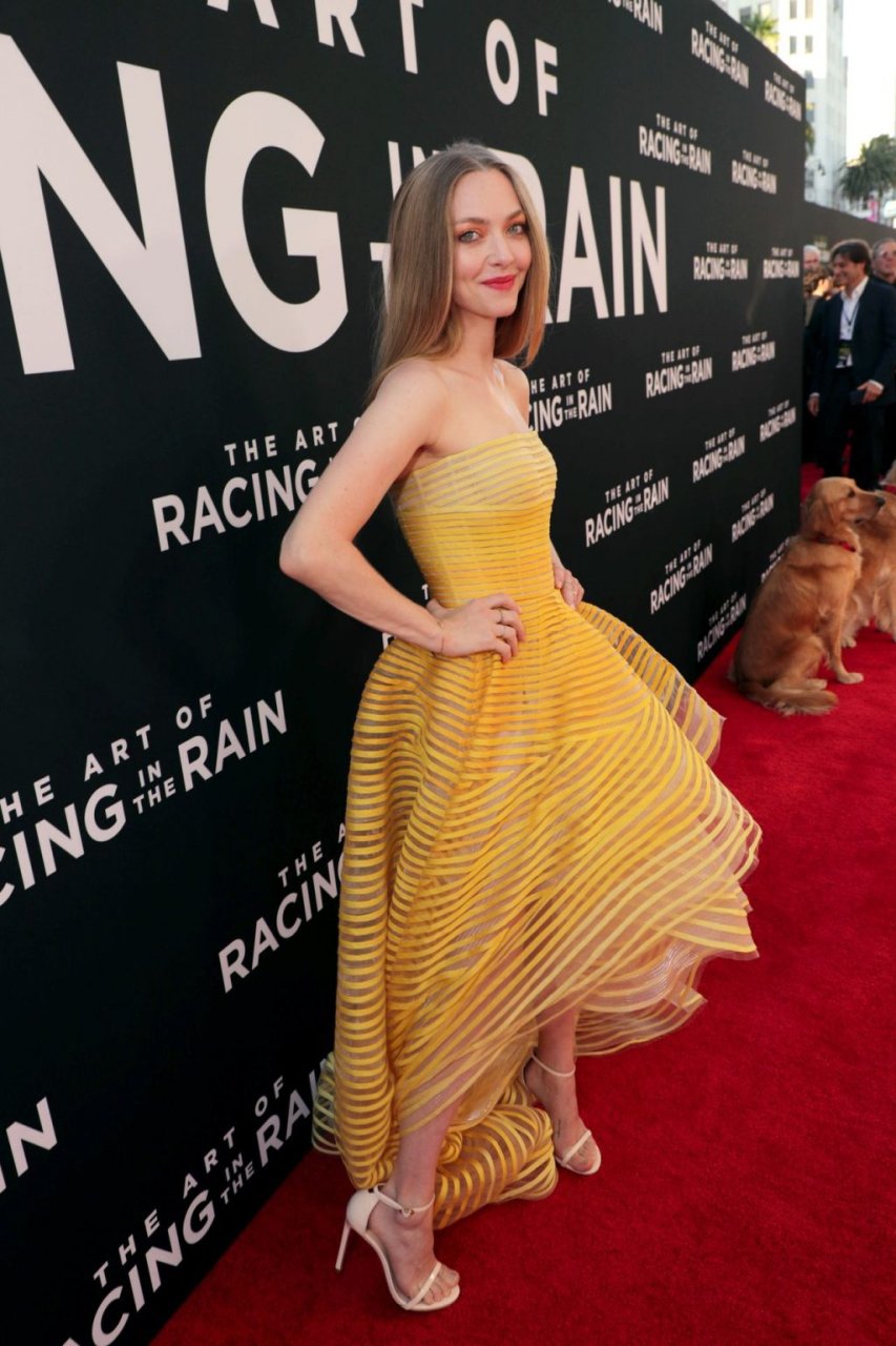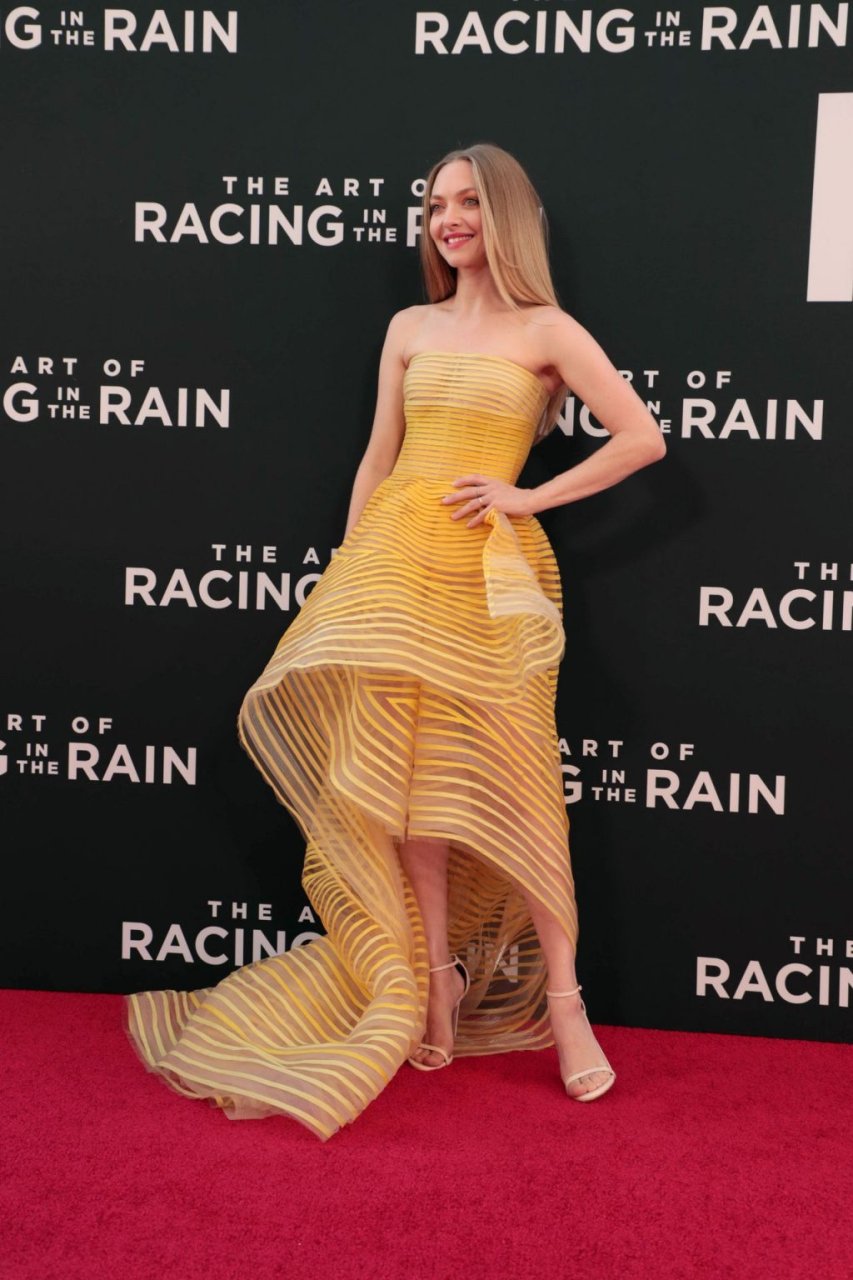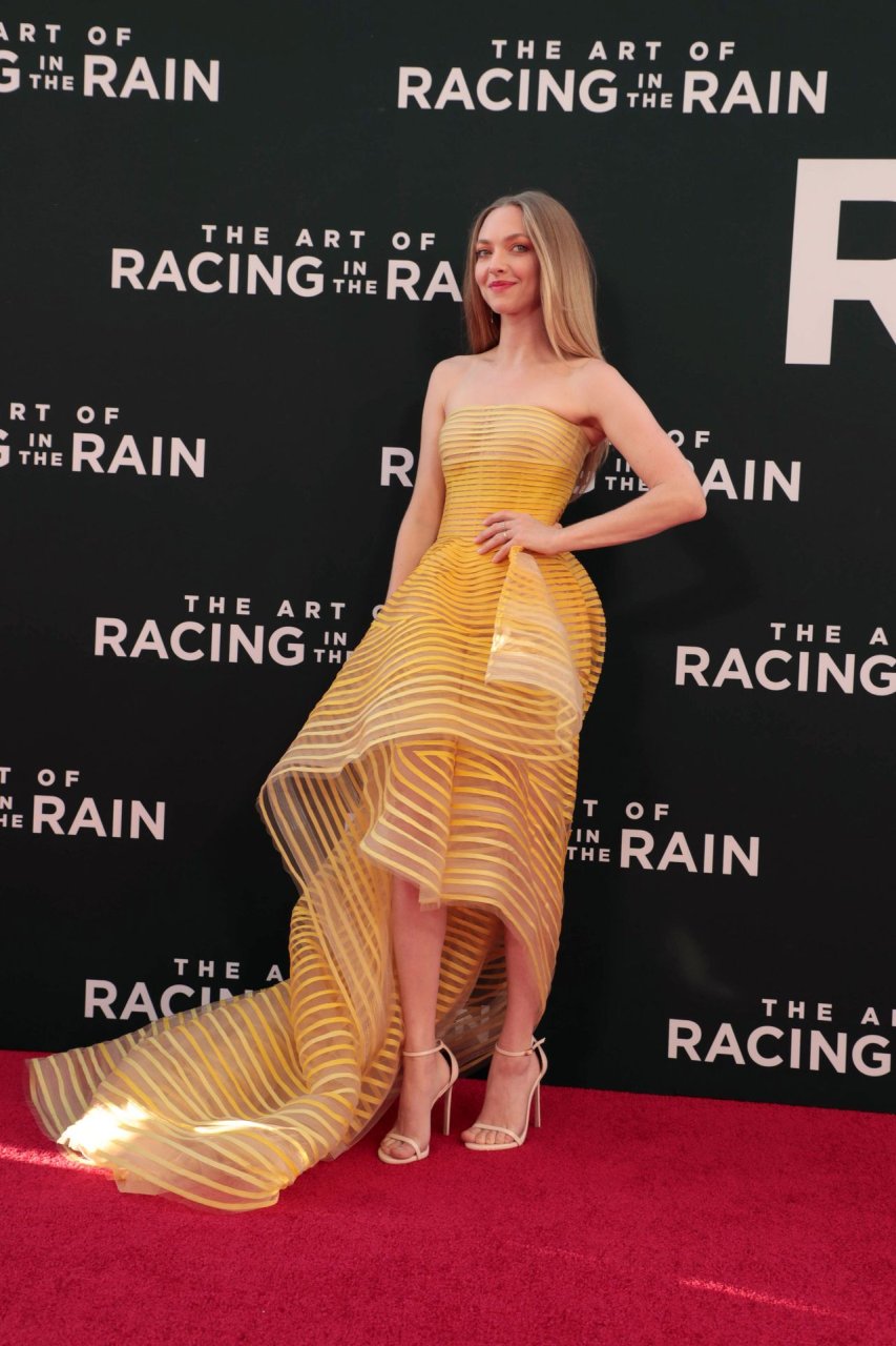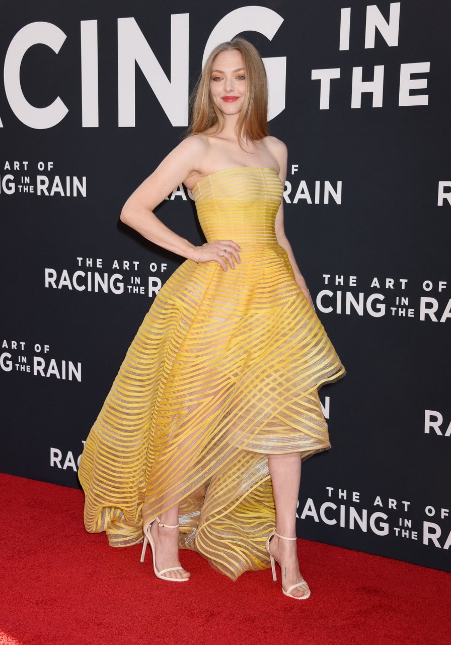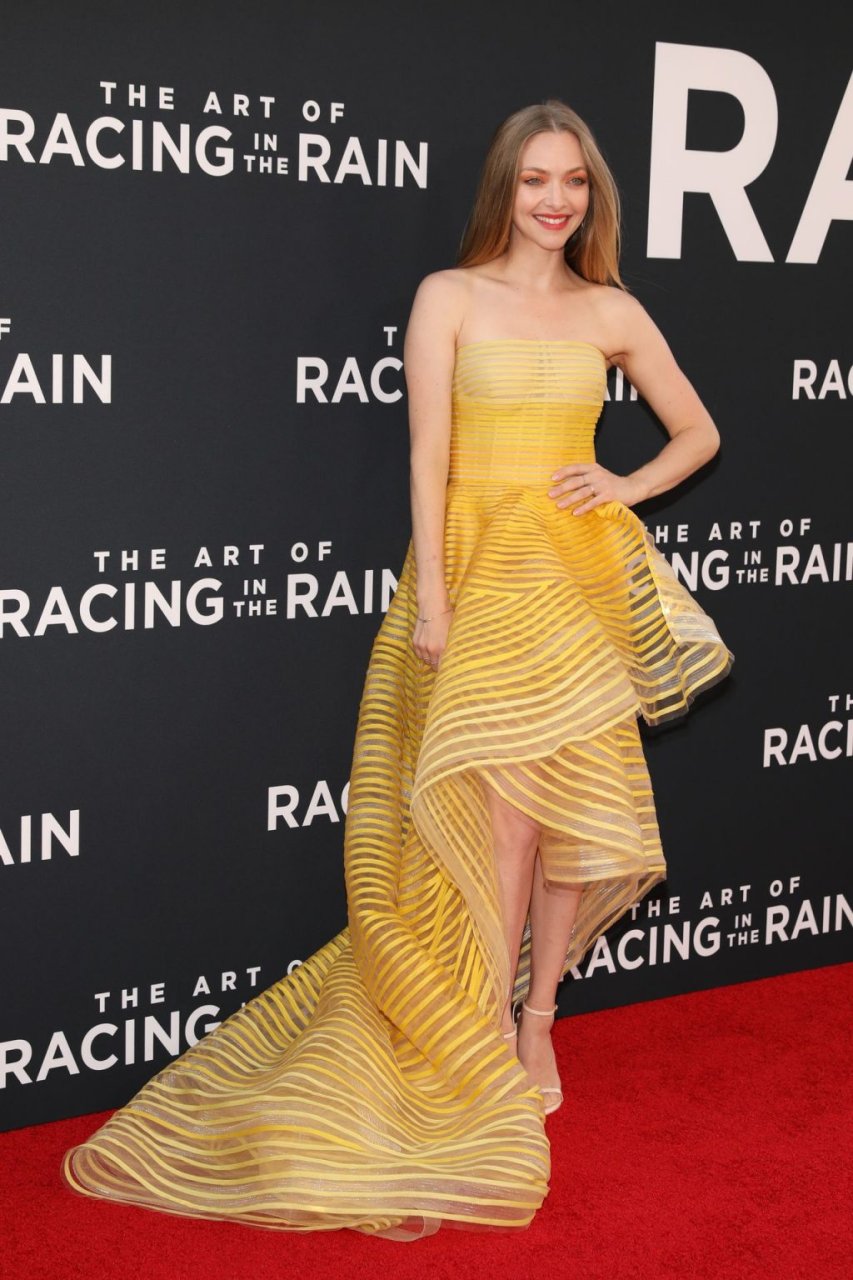 Actrice Amanda Seyfried portant une robe Oscar de la Renta, des talons Stuart Weitzman et des boucles d’oreilles Jennifer Meyer arrive à la première à Los Angeles du film de 20th Century Fox ‘The Art Of Racing In The Rain’ tenue au El Capitan Theatre à Hollywood, Los Angeles, le 01/08/2019.