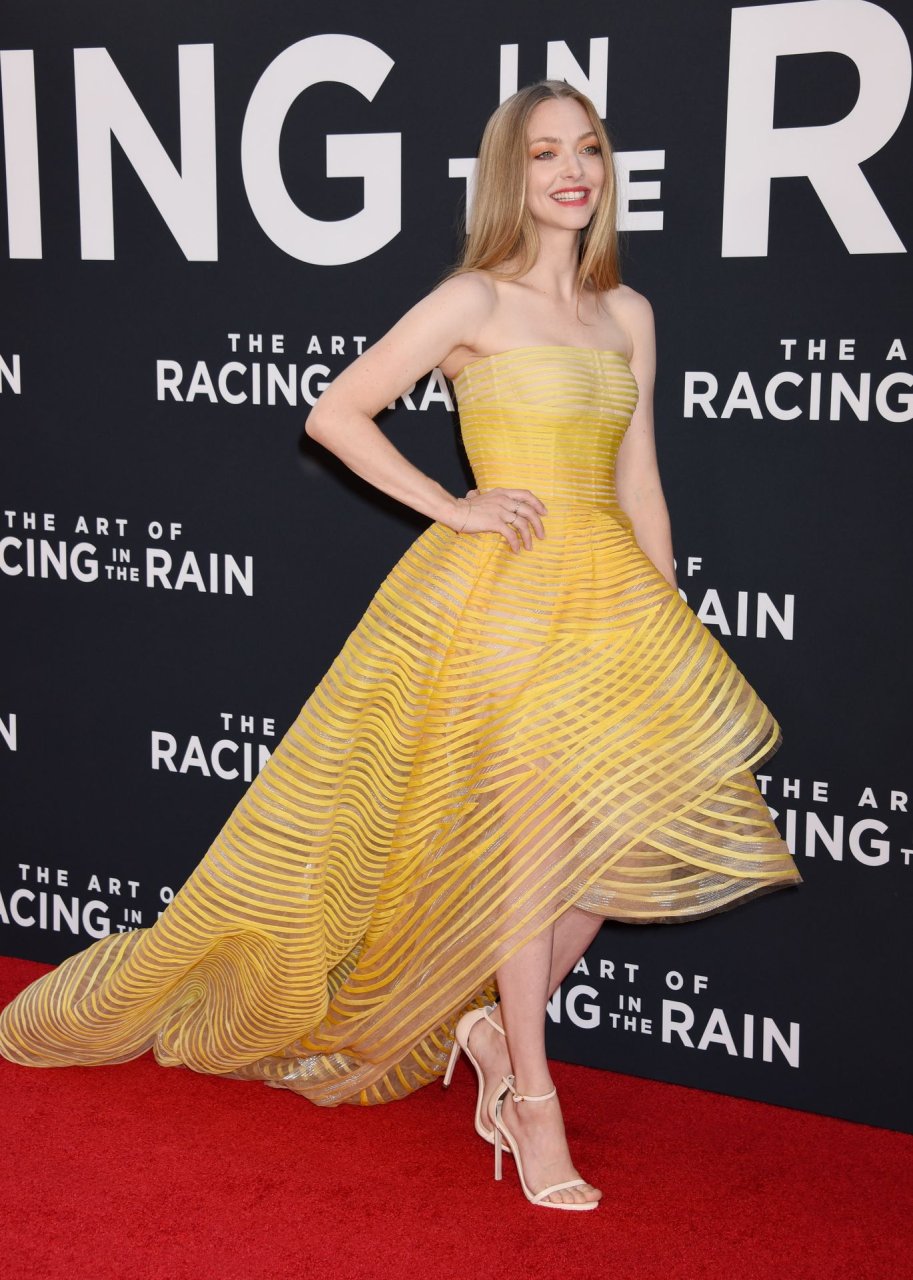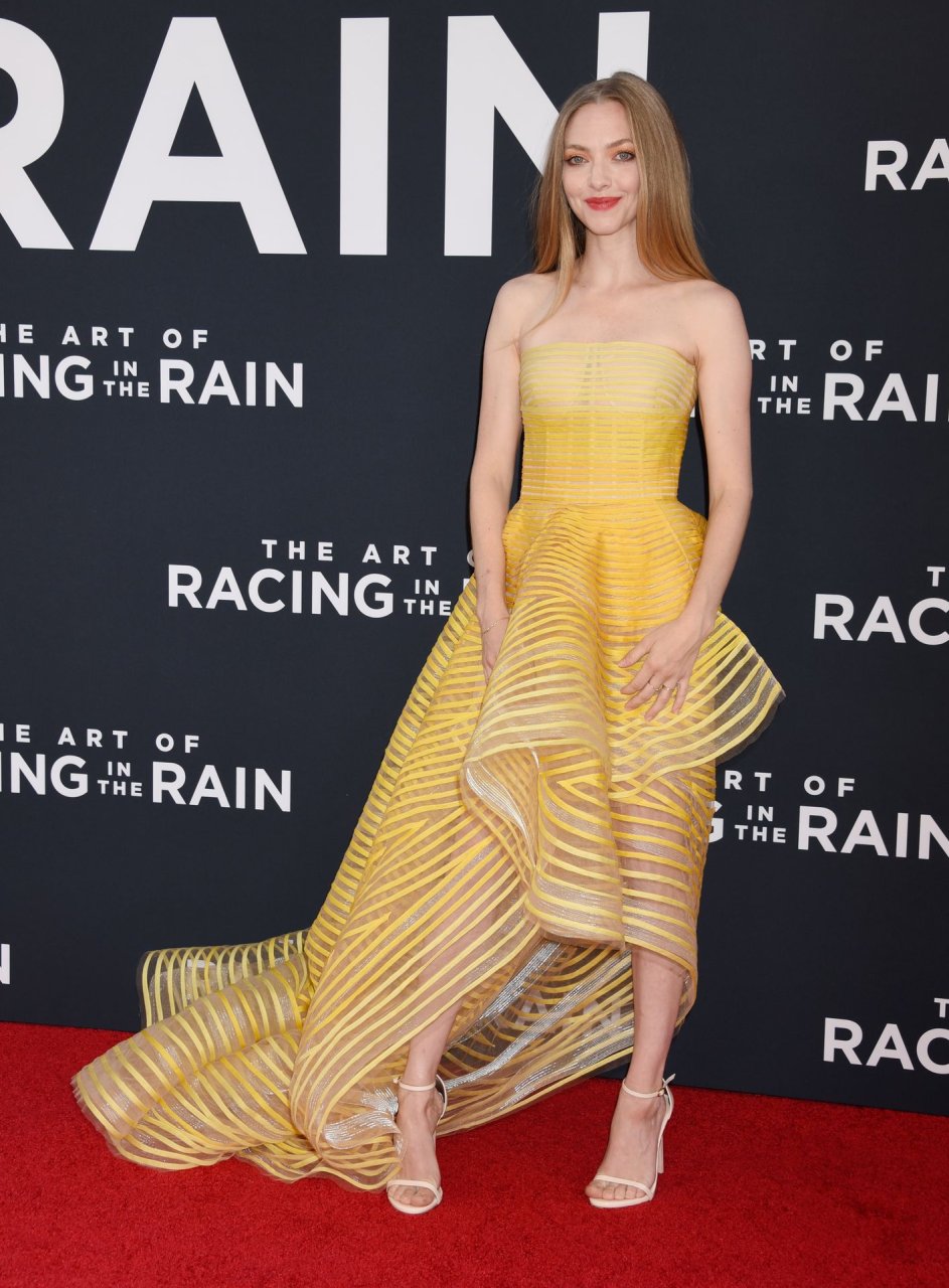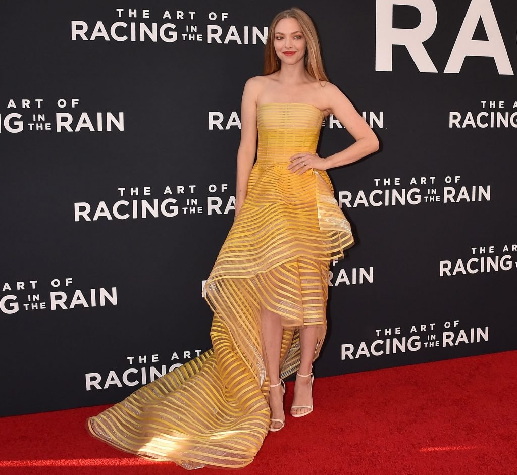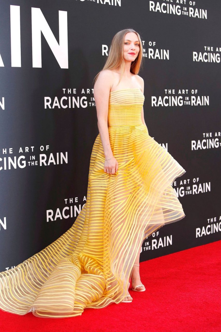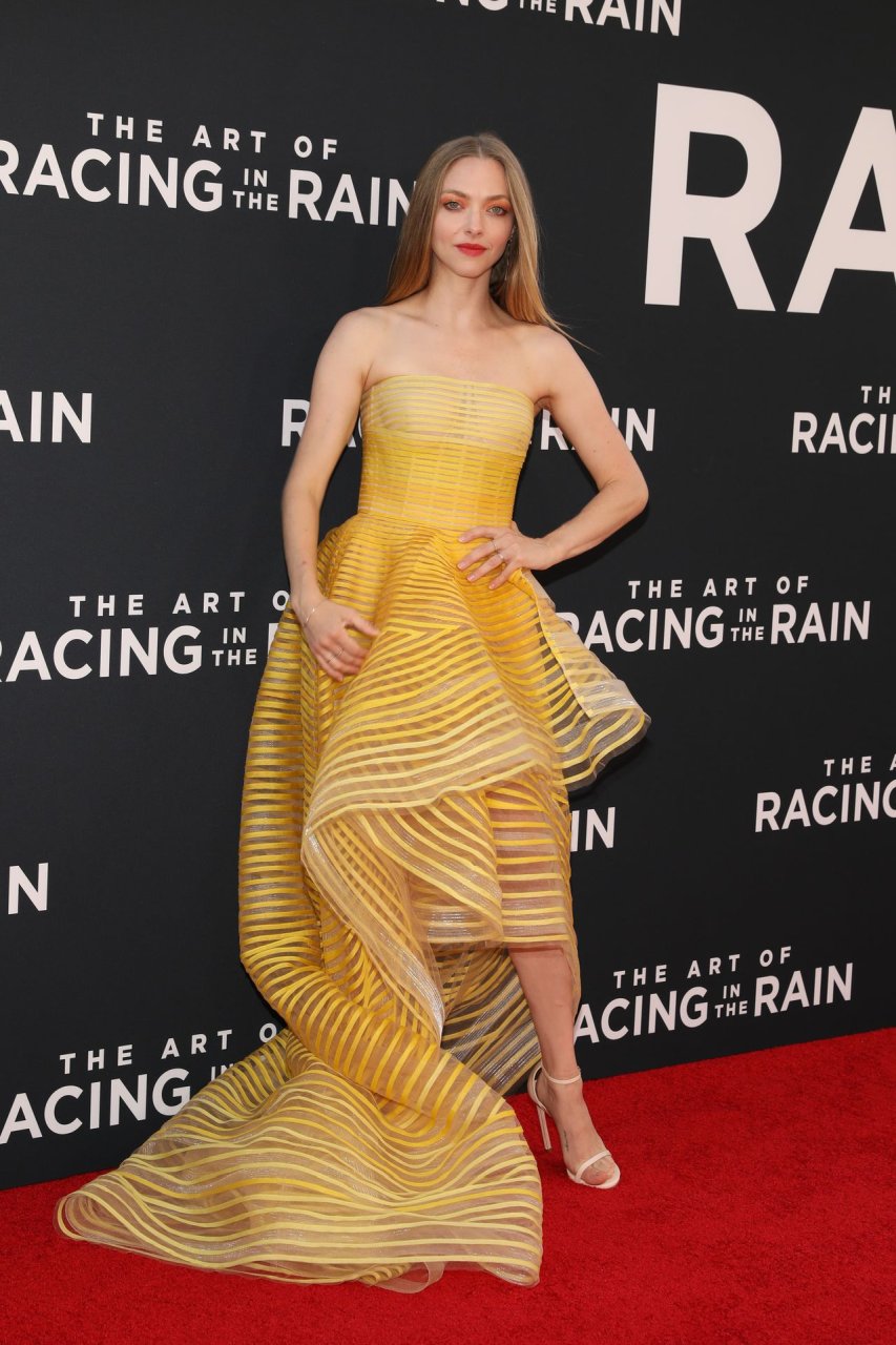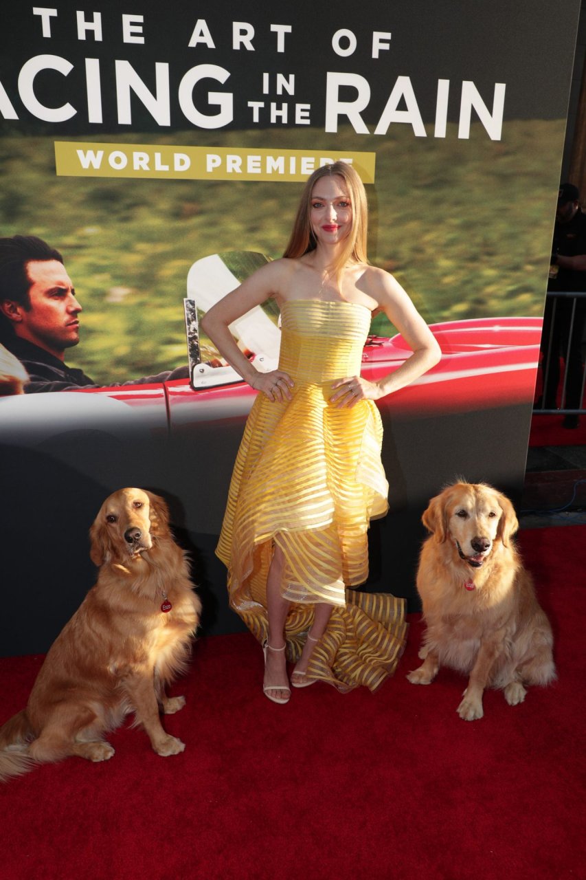 Actrice Amanda Seyfried portant une robe Oscar de la Renta, des talons Stuart Weitzman et des boucles d’oreilles Jennifer Meyer arrive à la première à Los Angeles du film de 20th Century Fox ‘The Art Of Racing In The Rain’ tenue au El Capitan Theatre à Hollywood, Los Angeles, le 01/08/2019.