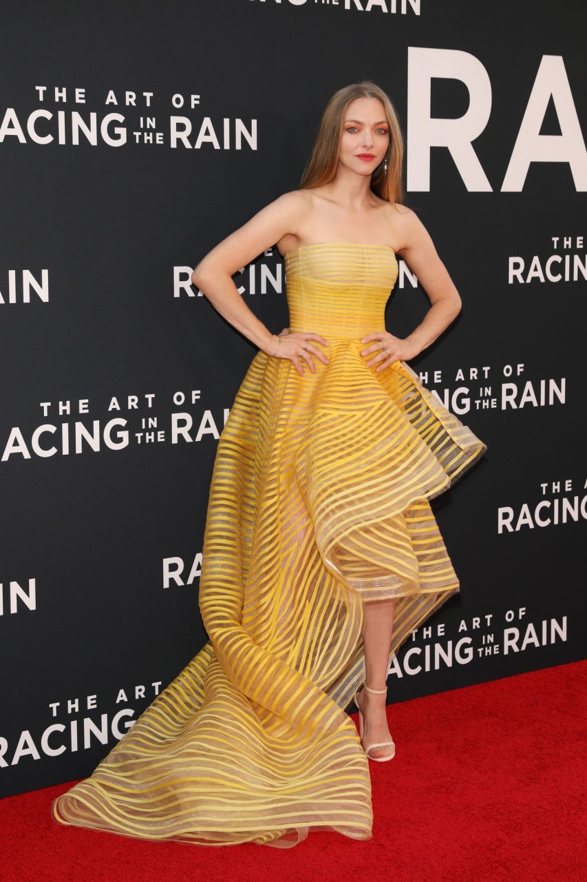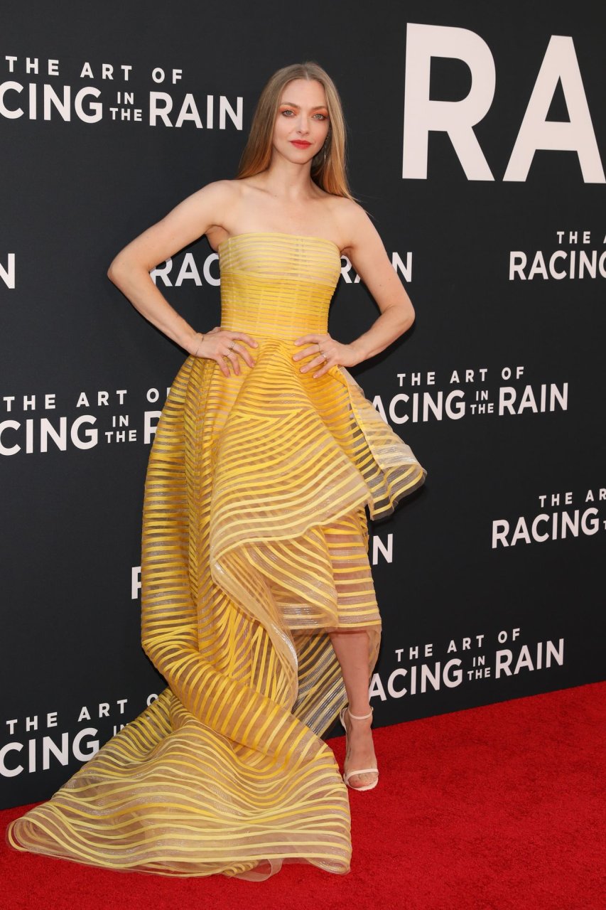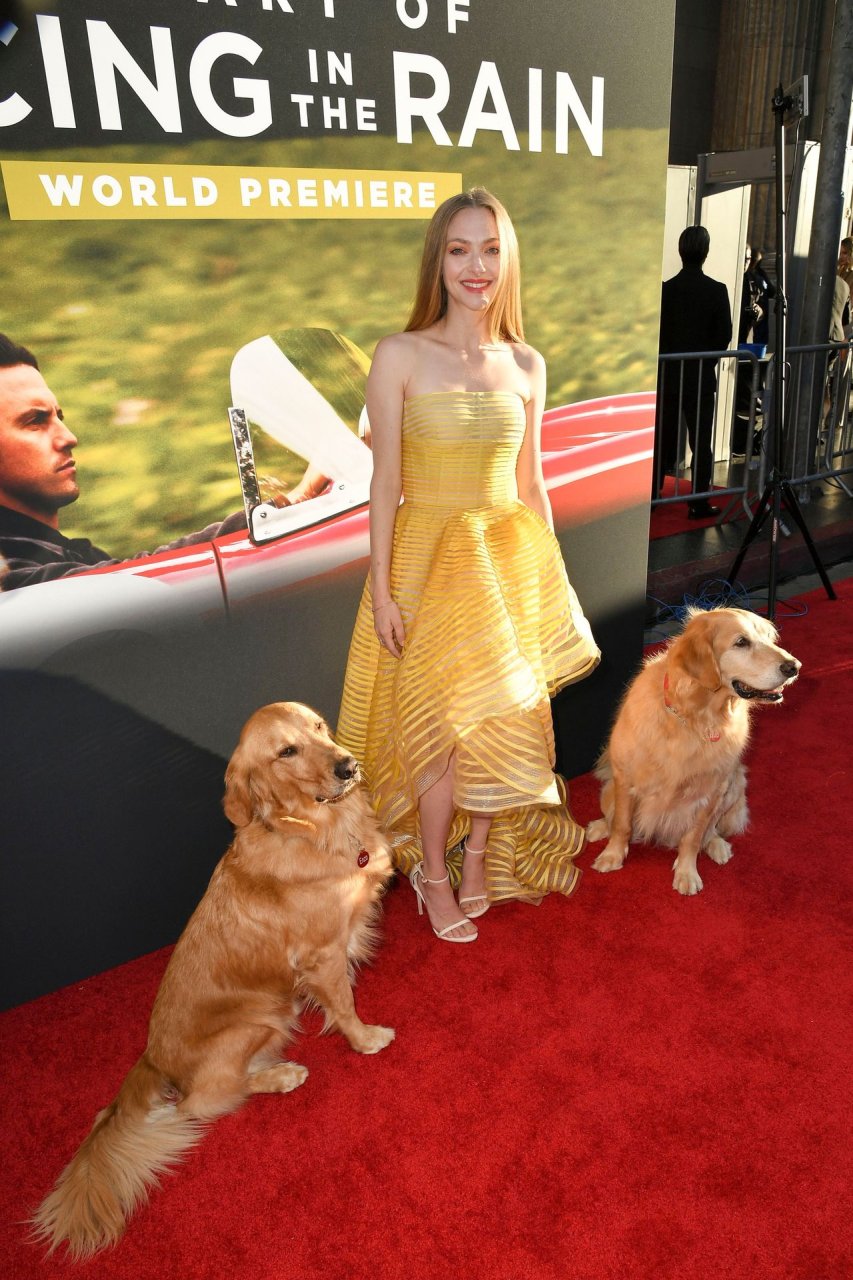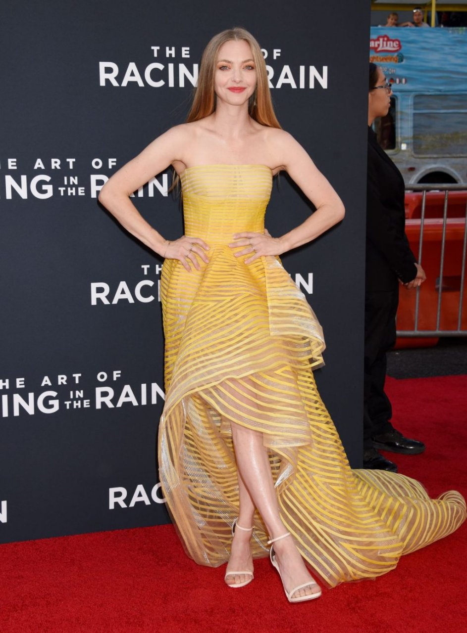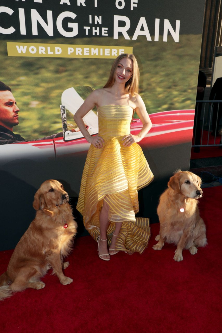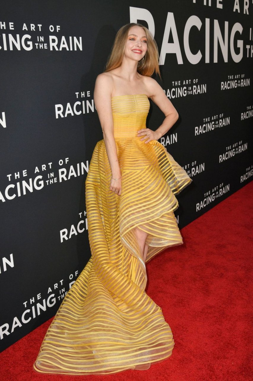Actrice Amanda Seyfried portant une robe Oscar de la Renta, des talons Stuart Weitzman et des boucles d’oreilles Jennifer Meyer arrive à la première à Los Angeles du film de 20th Century Fox ‘The Art Of Racing In The Rain’ tenue au El Capitan Theatre à Hollywood, Los Angeles, le 01/08/2019.