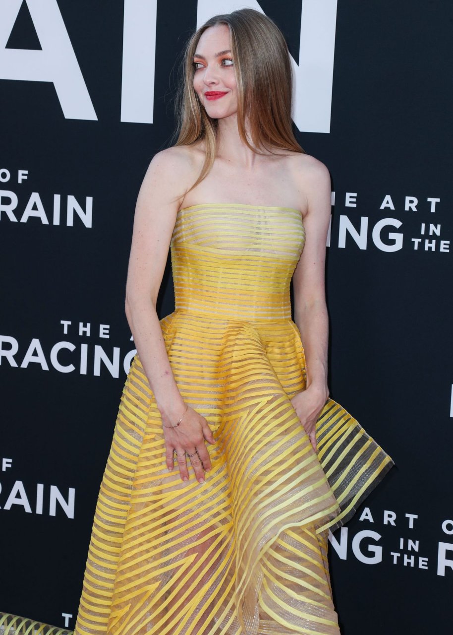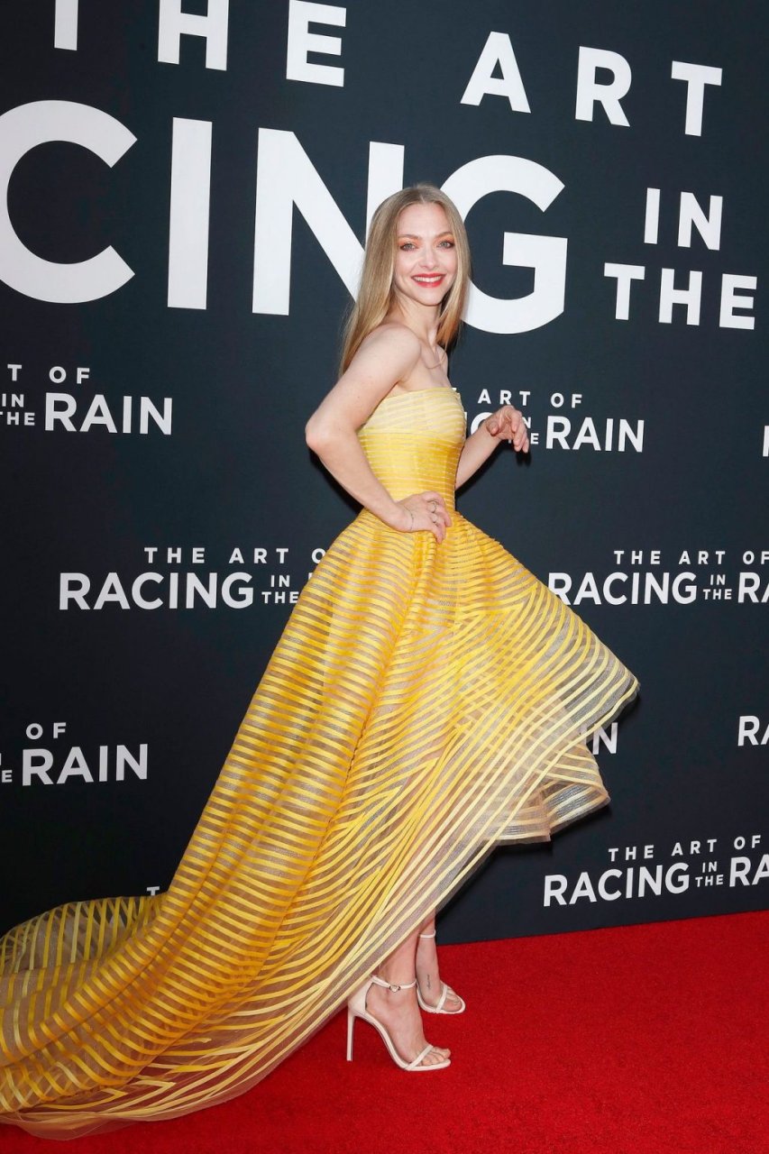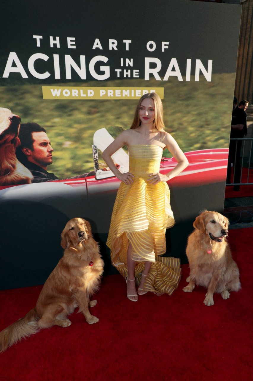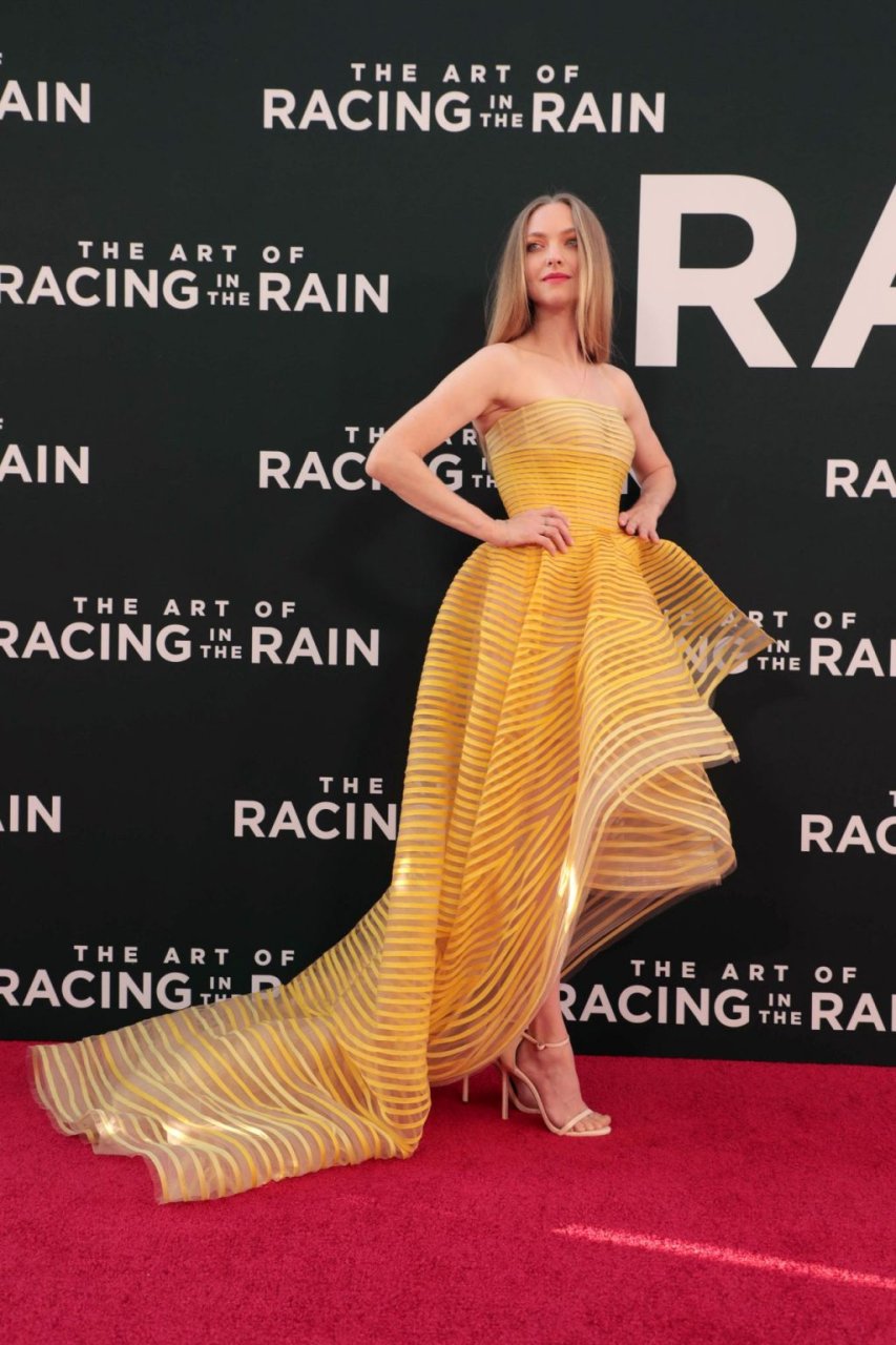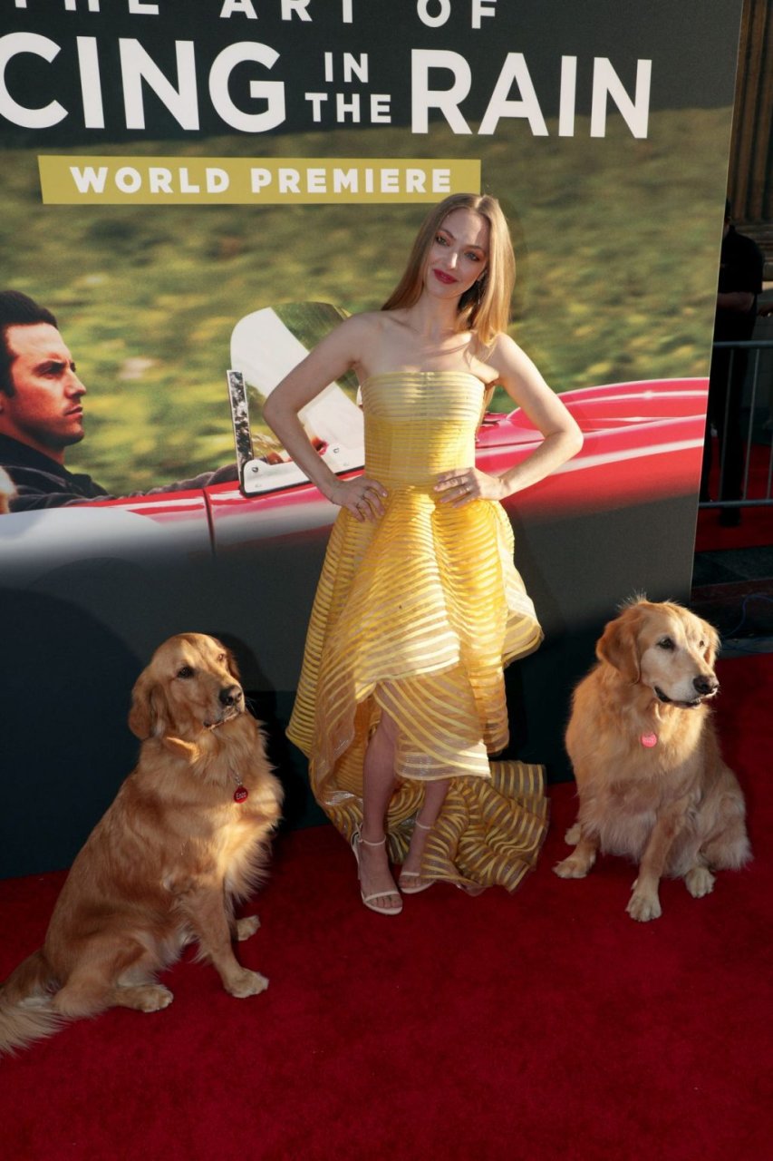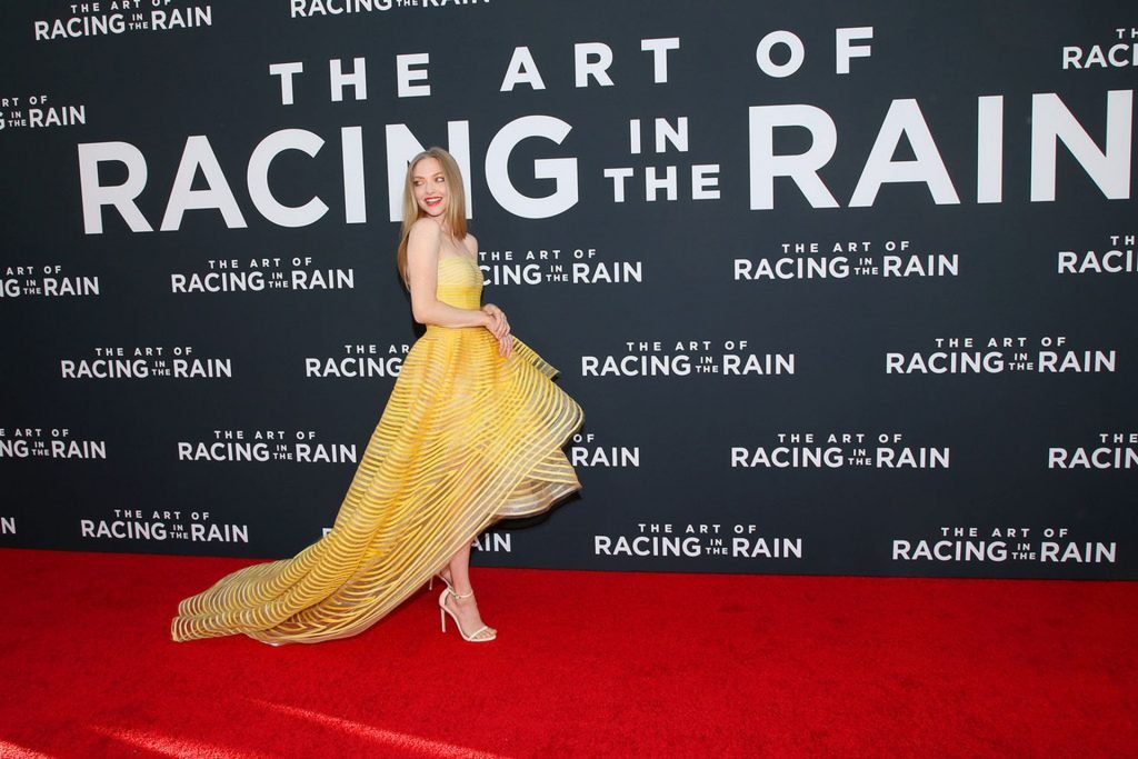 Actrice Amanda Seyfried portant une robe Oscar de la Renta, des talons Stuart Weitzman et des boucles d’oreilles Jennifer Meyer arrive à la première à Los Angeles du film de 20th Century Fox ‘The Art Of Racing In The Rain’ tenue au El Capitan Theatre à Hollywood, Los Angeles, le 01/08/2019.
