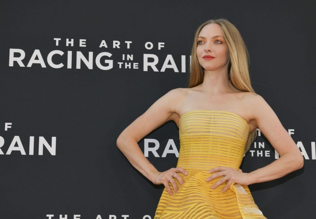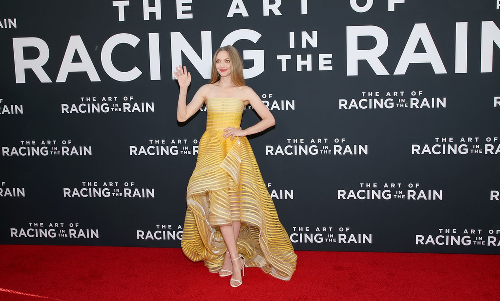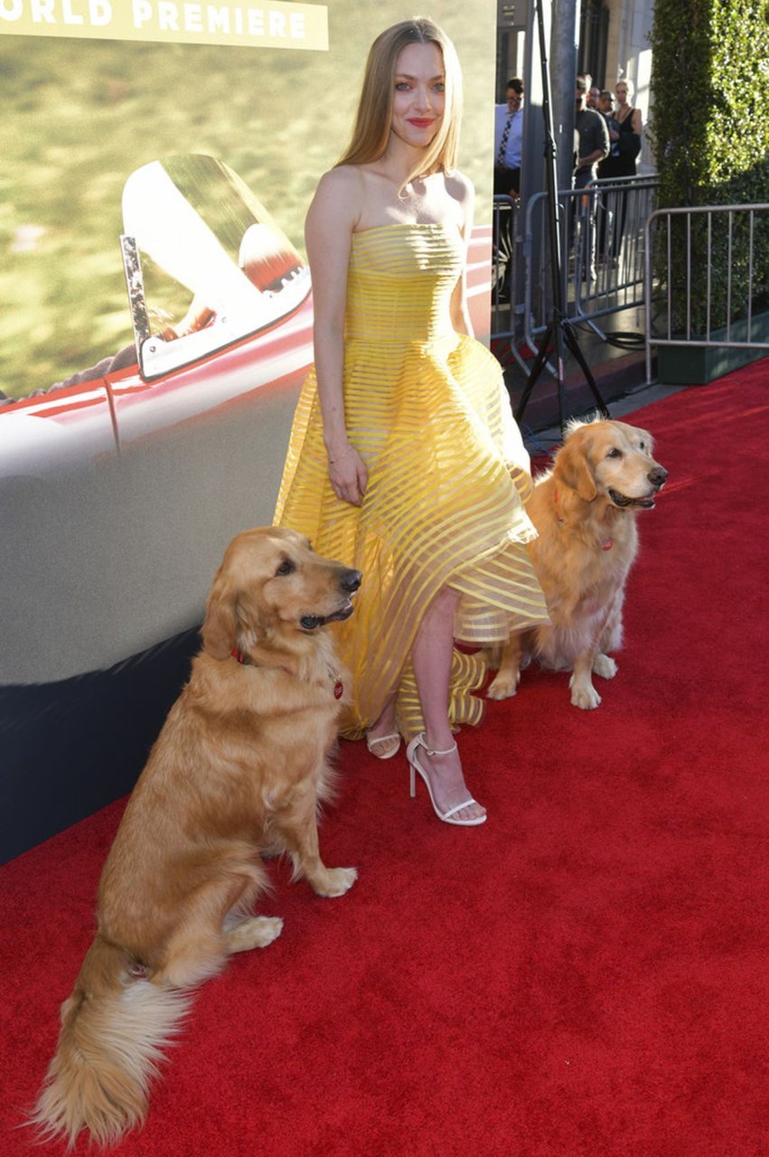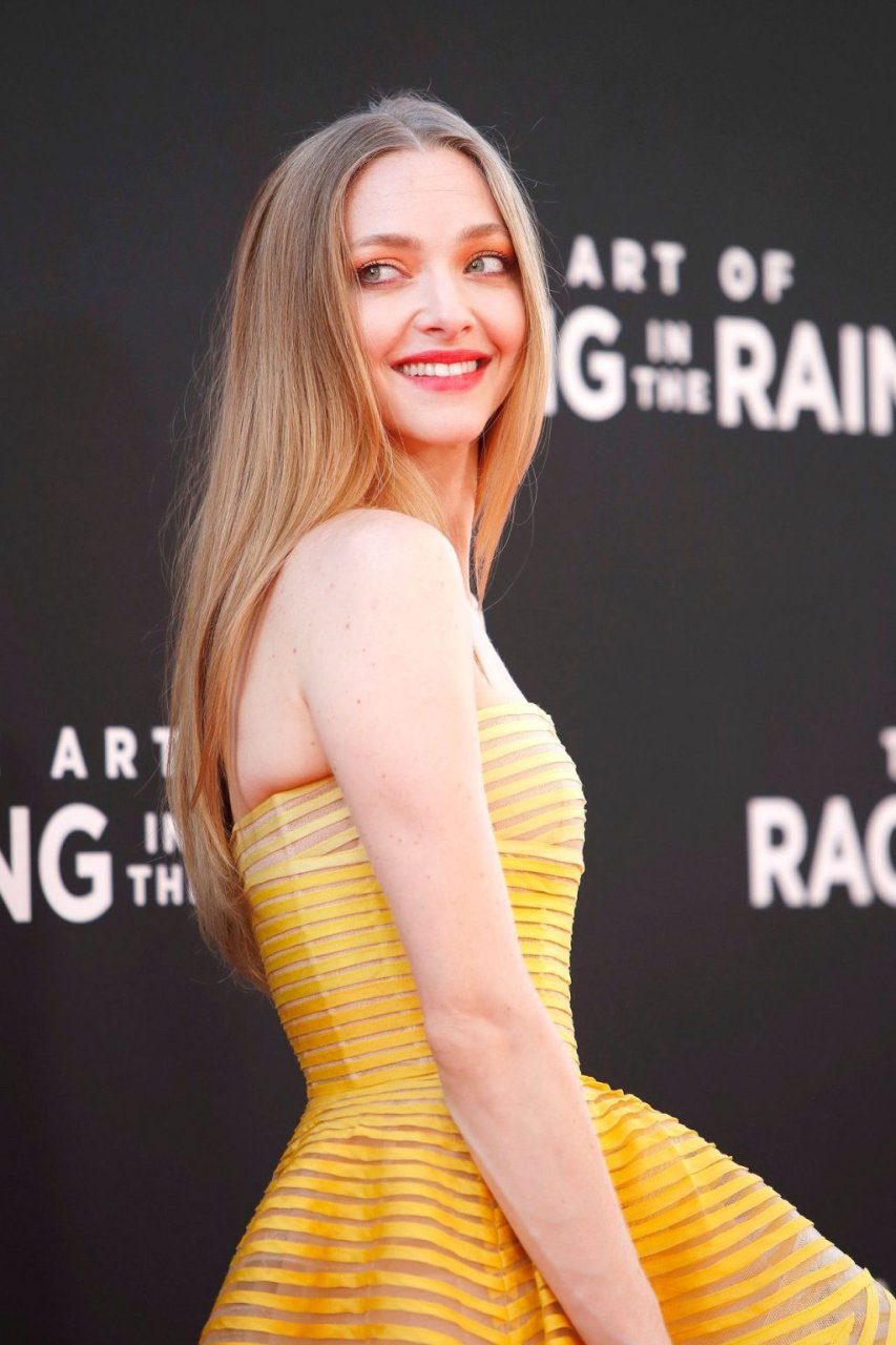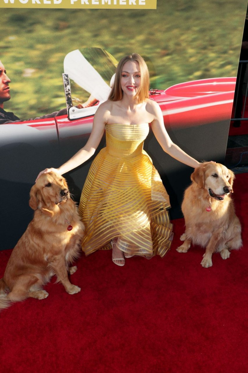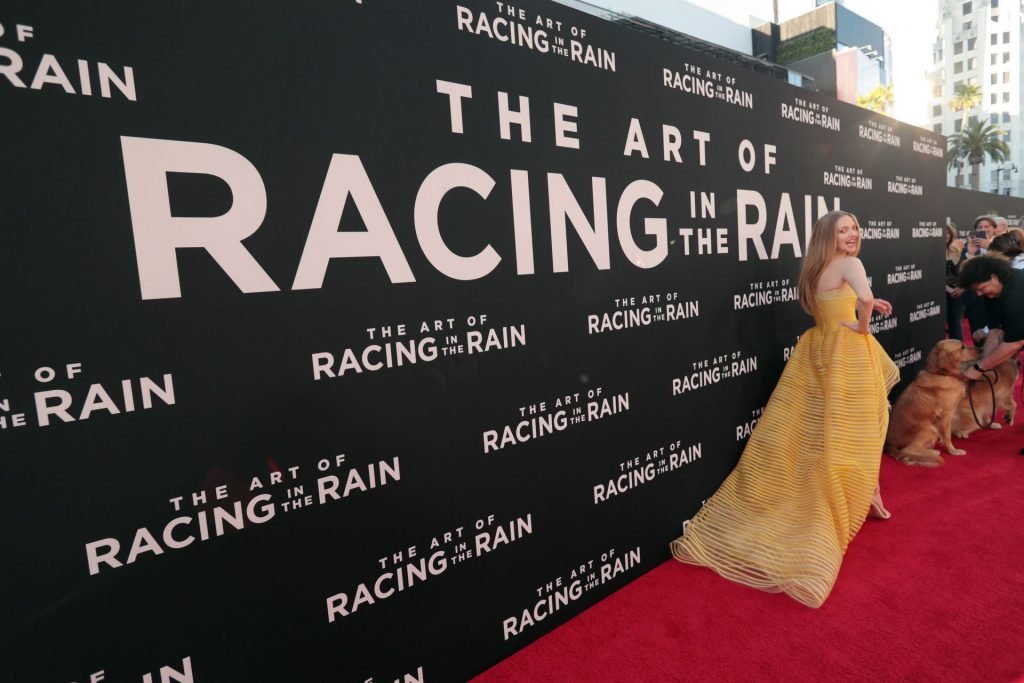 Actrice Amanda Seyfried portant une robe Oscar de la Renta, des talons Stuart Weitzman et des boucles d’oreilles Jennifer Meyer arrive à la première à Los Angeles du film de 20th Century Fox ‘The Art Of Racing In The Rain’ tenue au El Capitan Theatre à Hollywood, Los Angeles, le 01/08/2019.