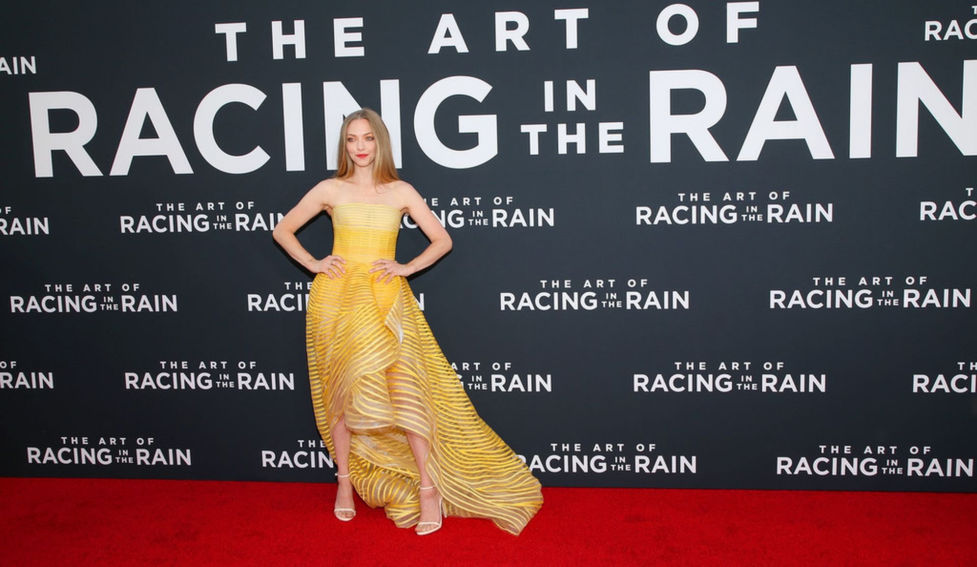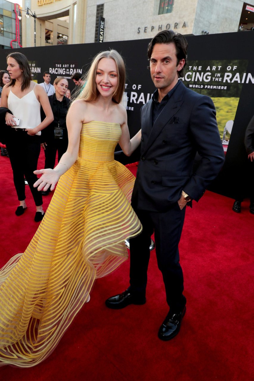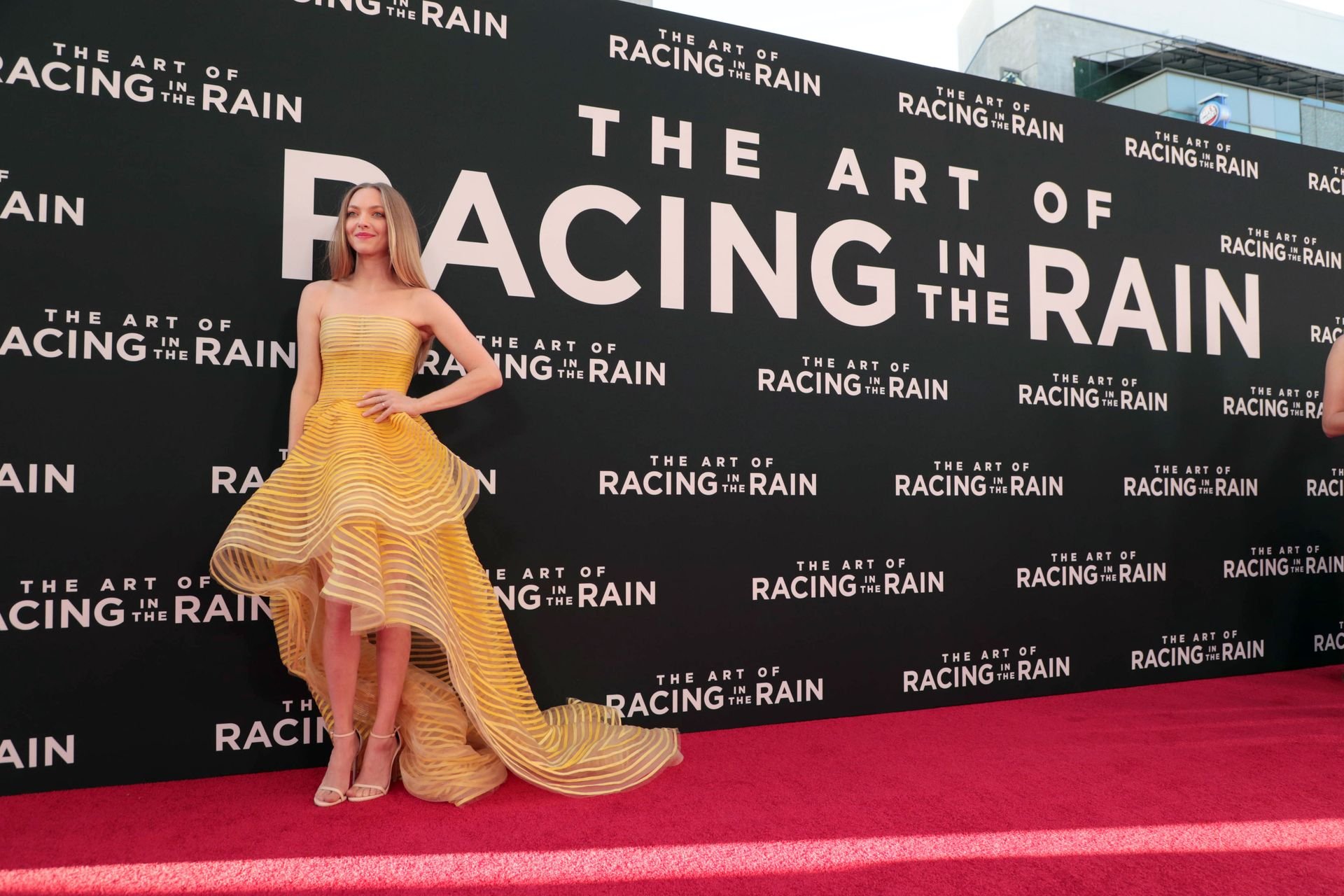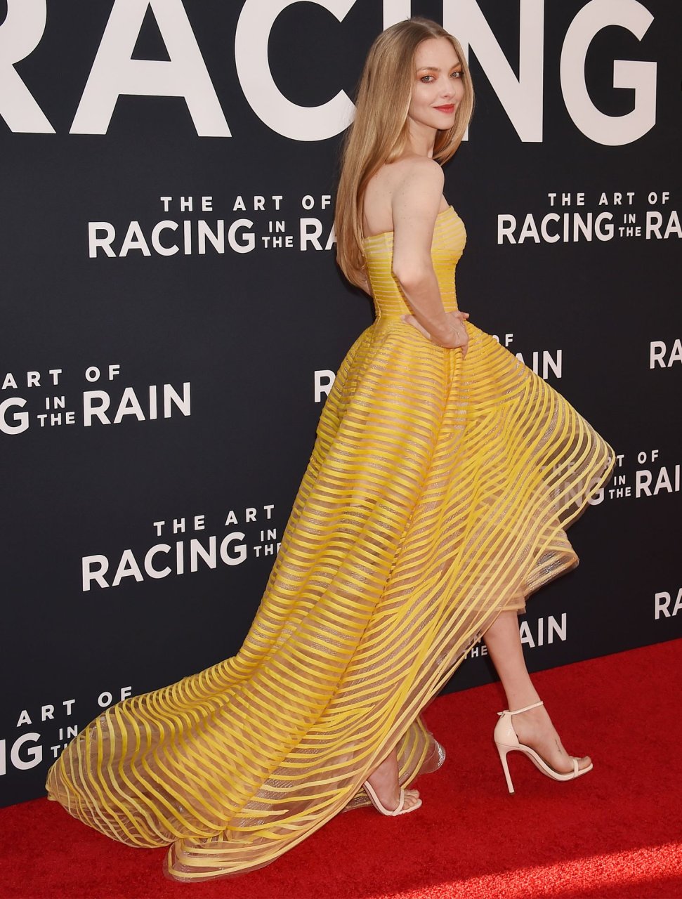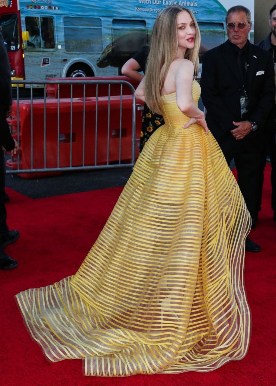 Actrice Amanda Seyfried portant une robe Oscar de la Renta, des talons Stuart Weitzman et des boucles d’oreilles Jennifer Meyer arrive à la première à Los Angeles du film de 20th Century Fox ‘The Art Of Racing In The Rain’ tenue au El Capitan Theatre à Hollywood, Los Angeles, le 01/08/2019.