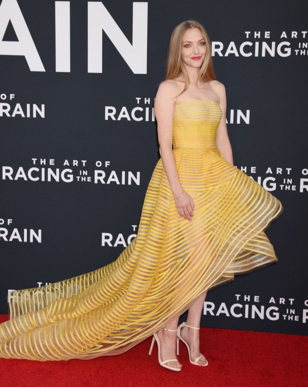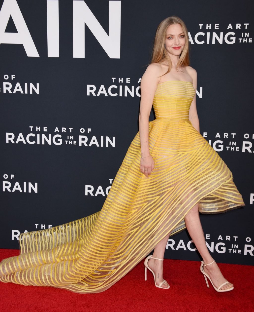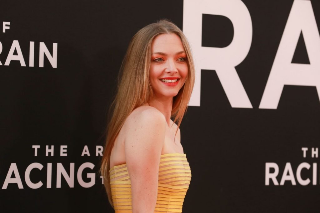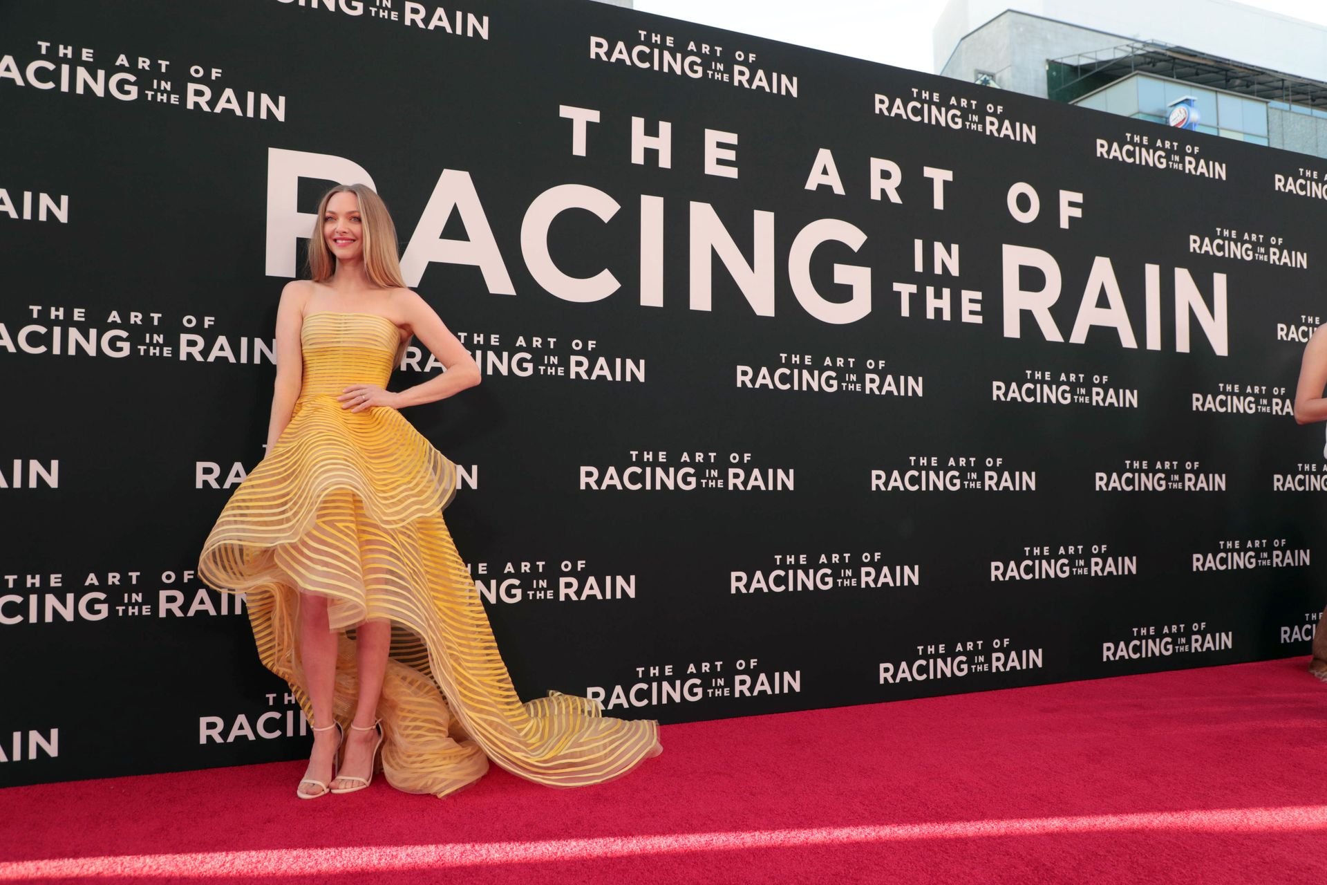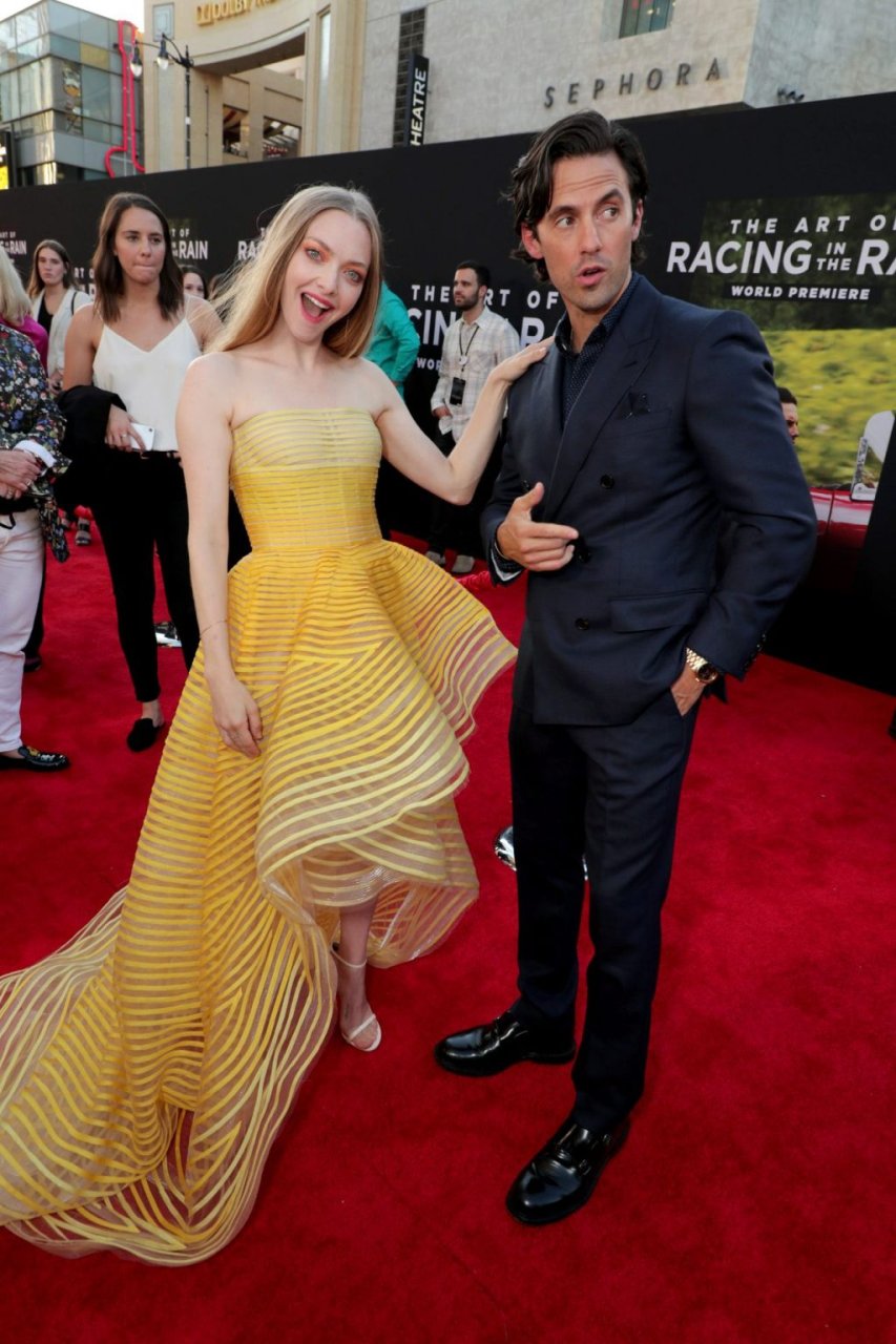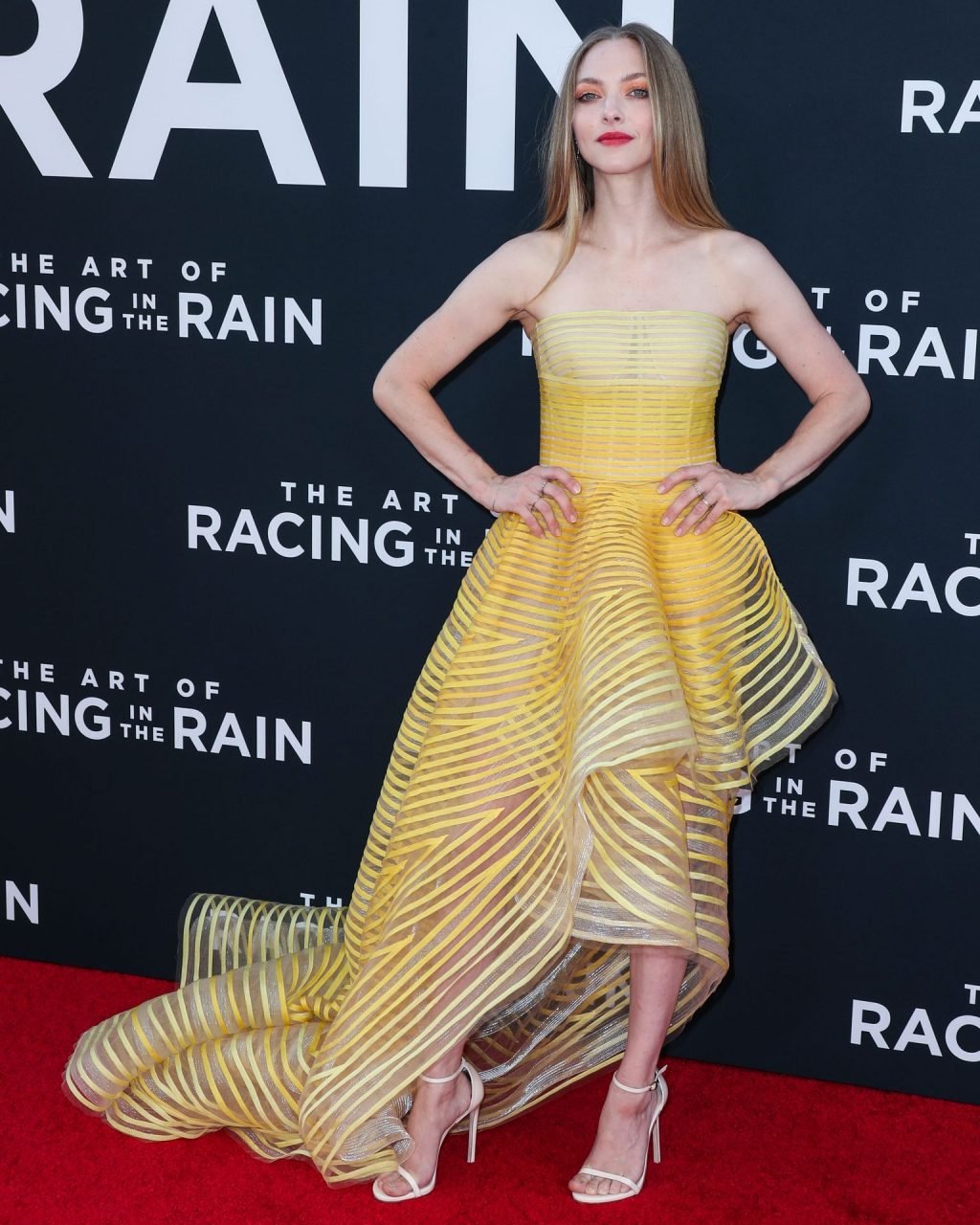 Actrice Amanda Seyfried portant une robe Oscar de la Renta, des talons Stuart Weitzman et des boucles d’oreilles Jennifer Meyer arrive à la première à Los Angeles du film de 20th Century Fox ‘The Art Of Racing In The Rain’ tenue au El Capitan Theatre à Hollywood, Los Angeles, le 01/08/2019.