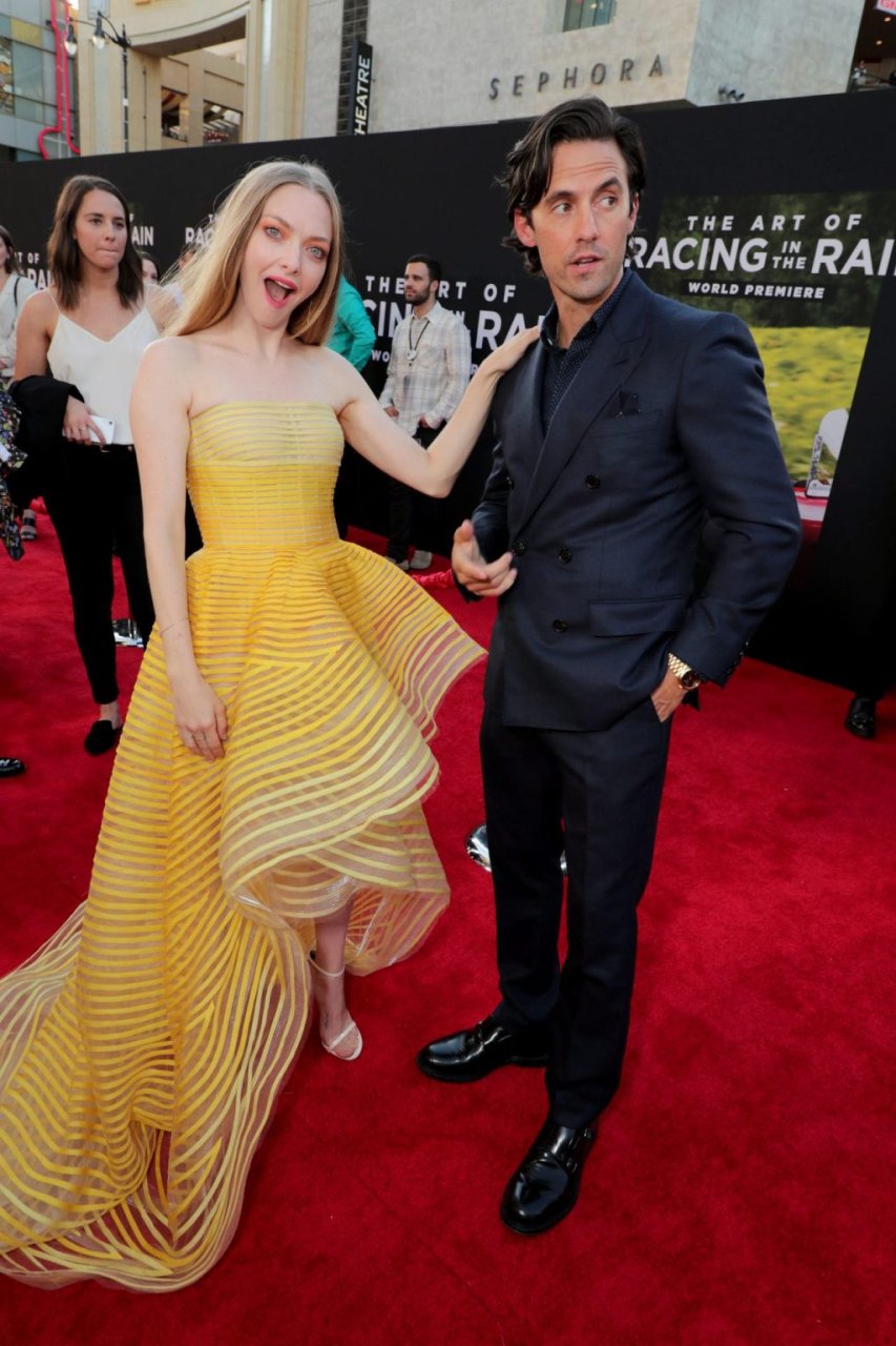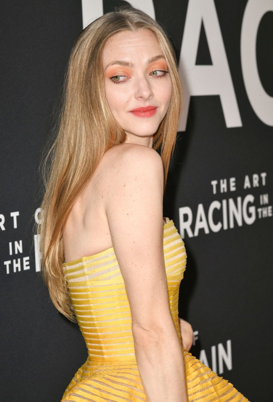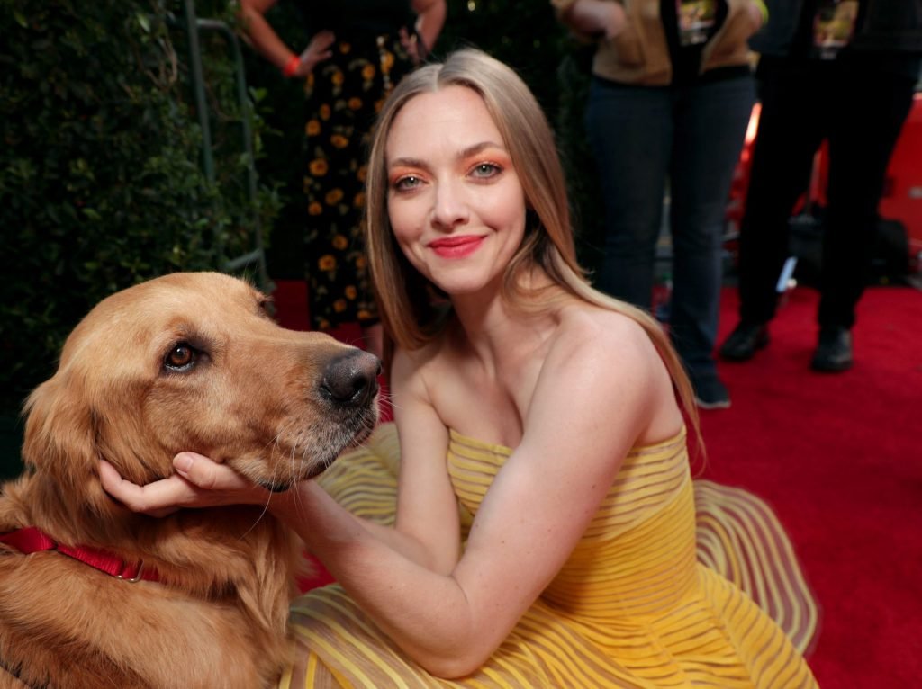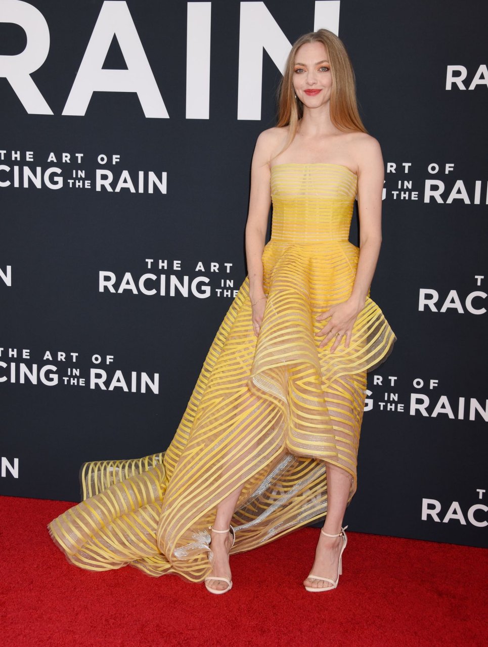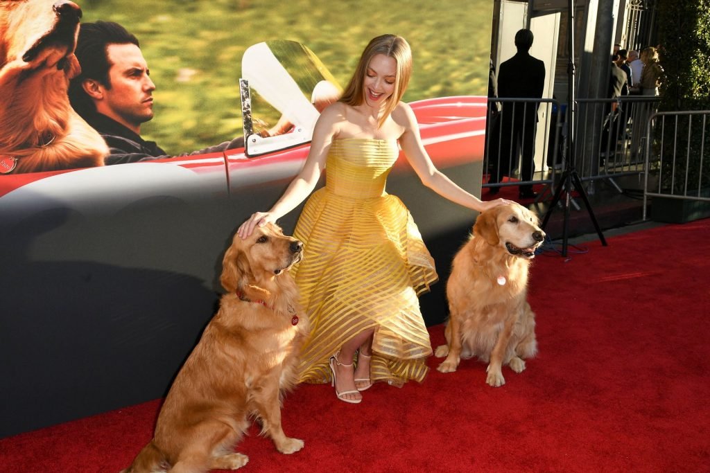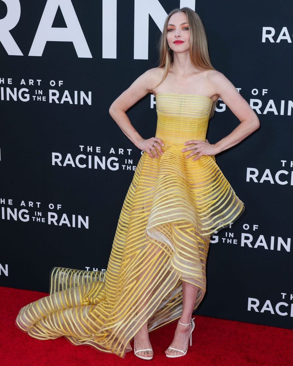 Actrice Amanda Seyfried portant une robe Oscar de la Renta, des talons Stuart Weitzman et des boucles d’oreilles Jennifer Meyer arrive à la première à Los Angeles du film de 20th Century Fox ‘The Art Of Racing In The Rain’ tenue au El Capitan Theatre à Hollywood, Los Angeles, le 01/08/2019.