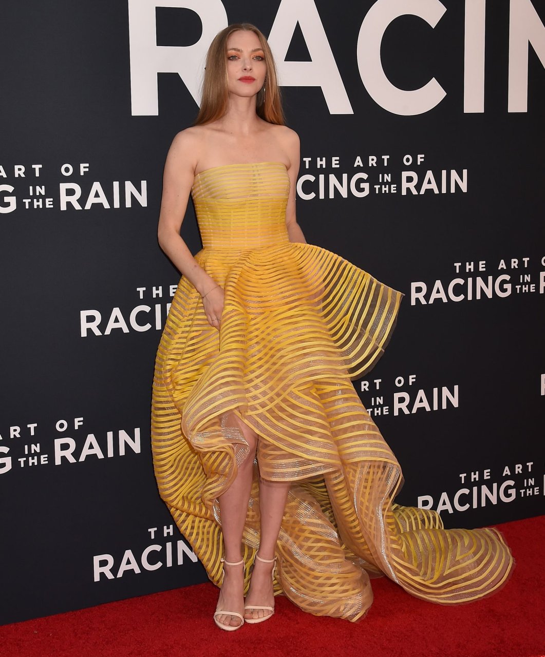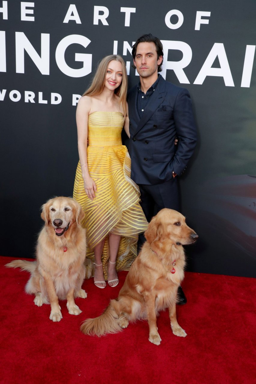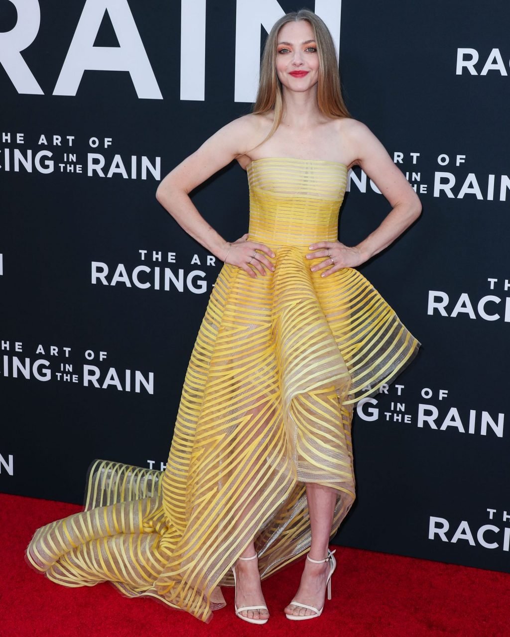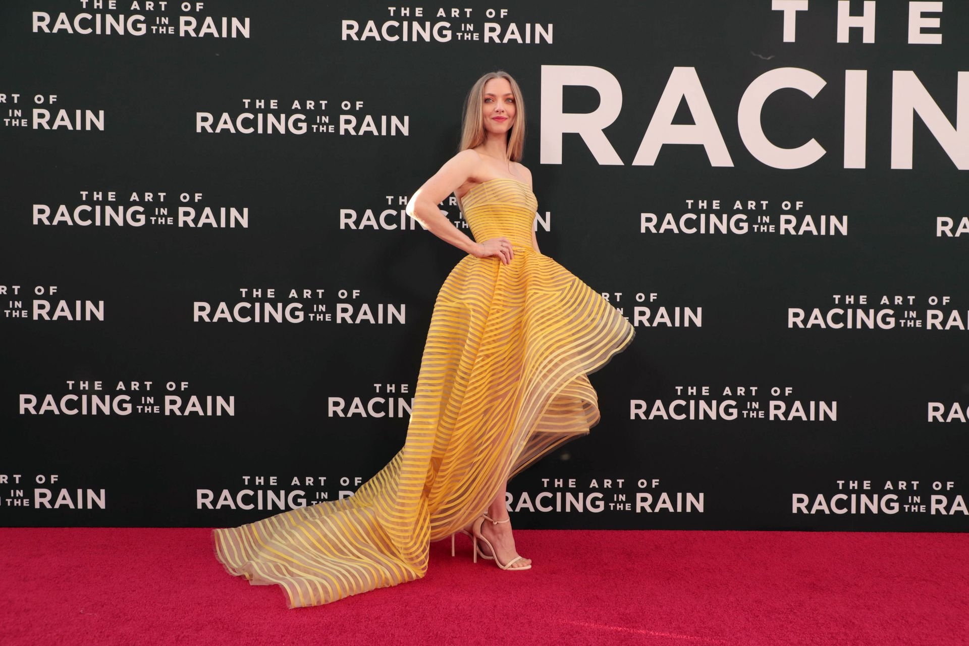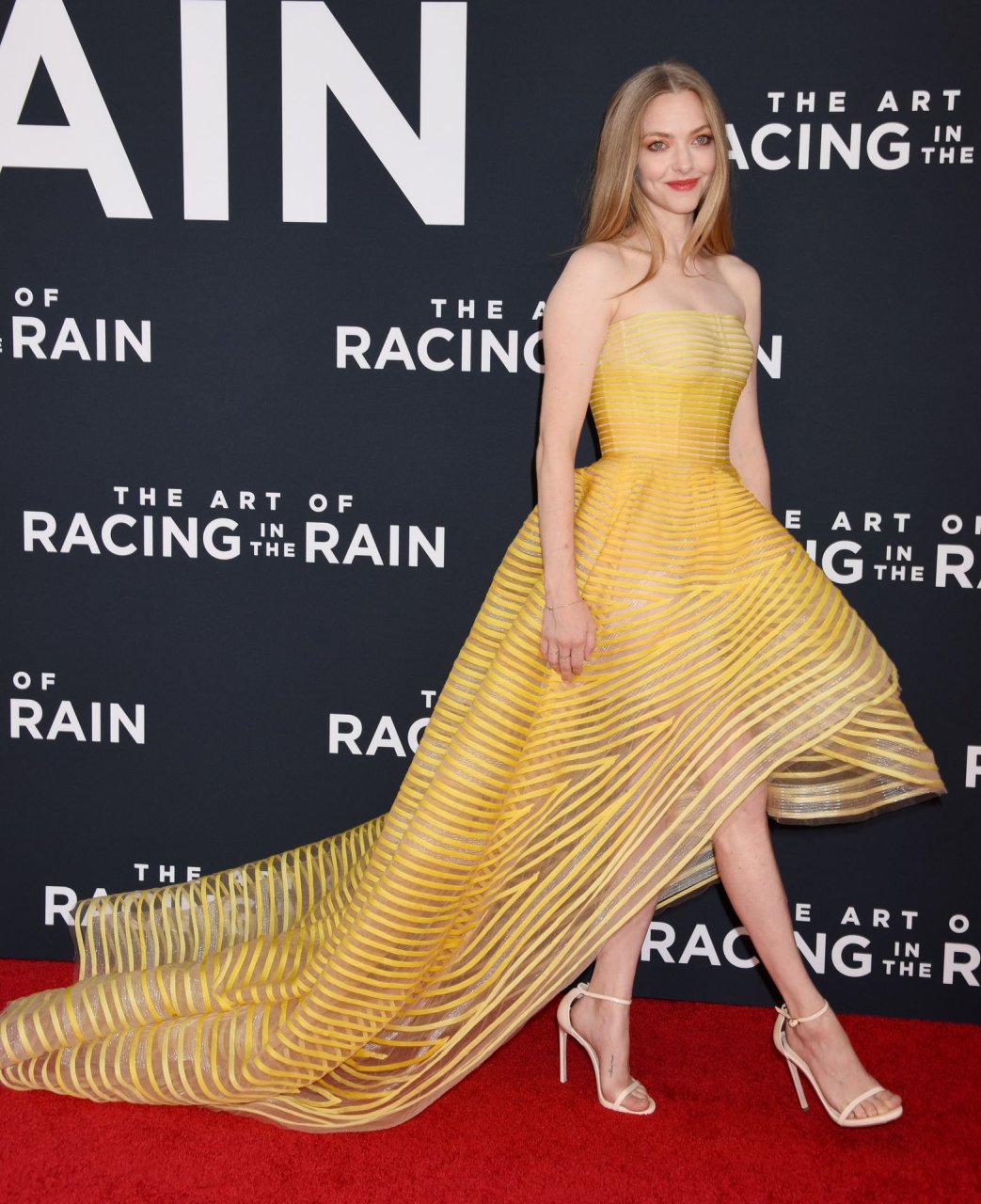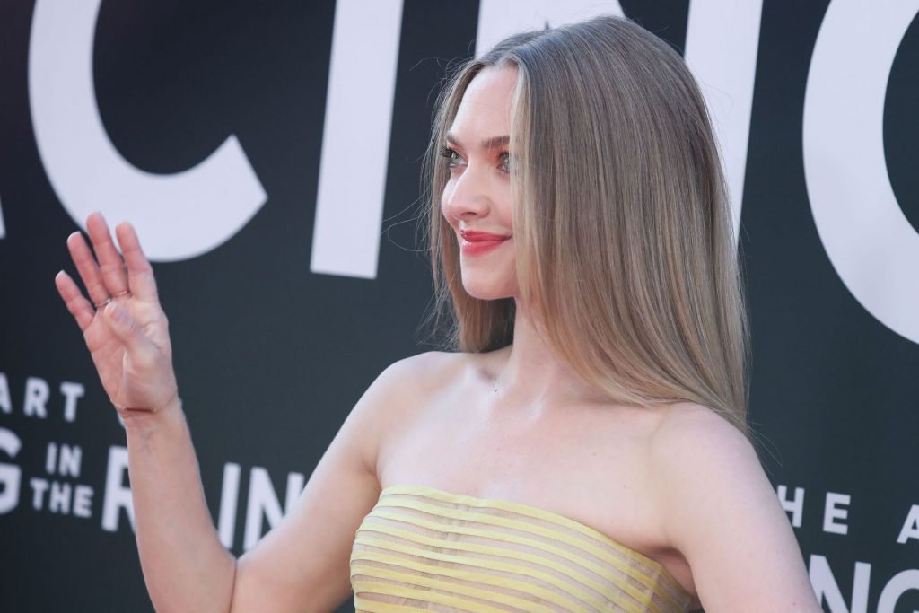 Actrice Amanda Seyfried portant une robe Oscar de la Renta, des talons Stuart Weitzman et des boucles d’oreilles Jennifer Meyer arrive à la première à Los Angeles du film de 20th Century Fox ‘The Art Of Racing In The Rain’ tenue au El Capitan Theatre à Hollywood, Los Angeles, le 01/08/2019.