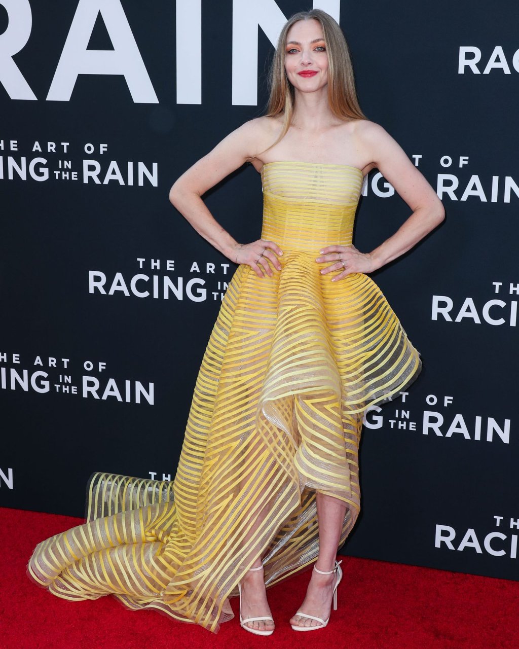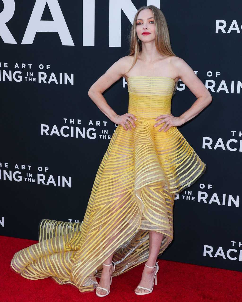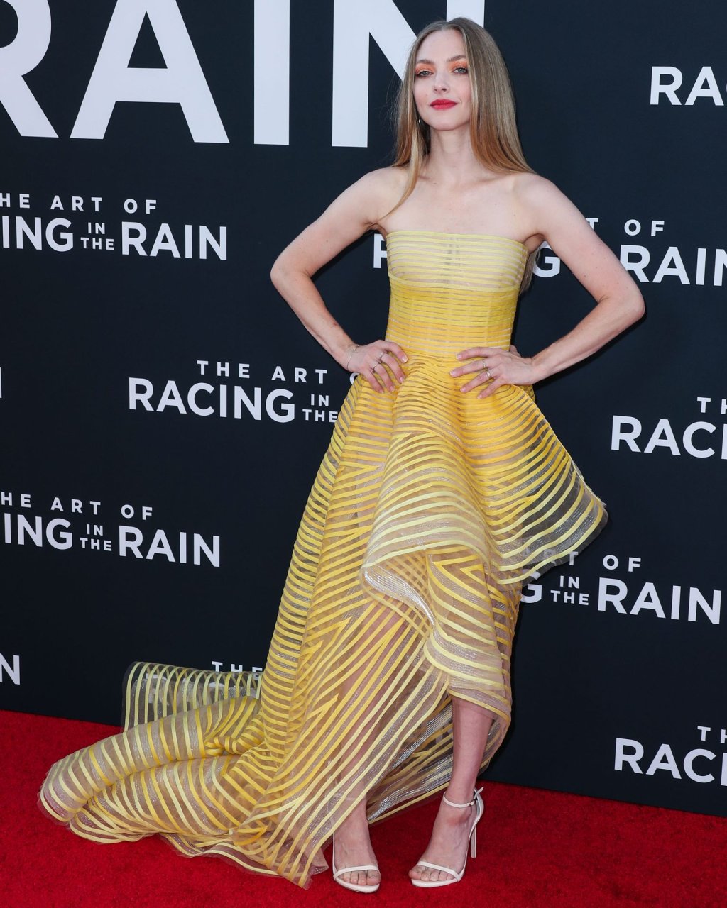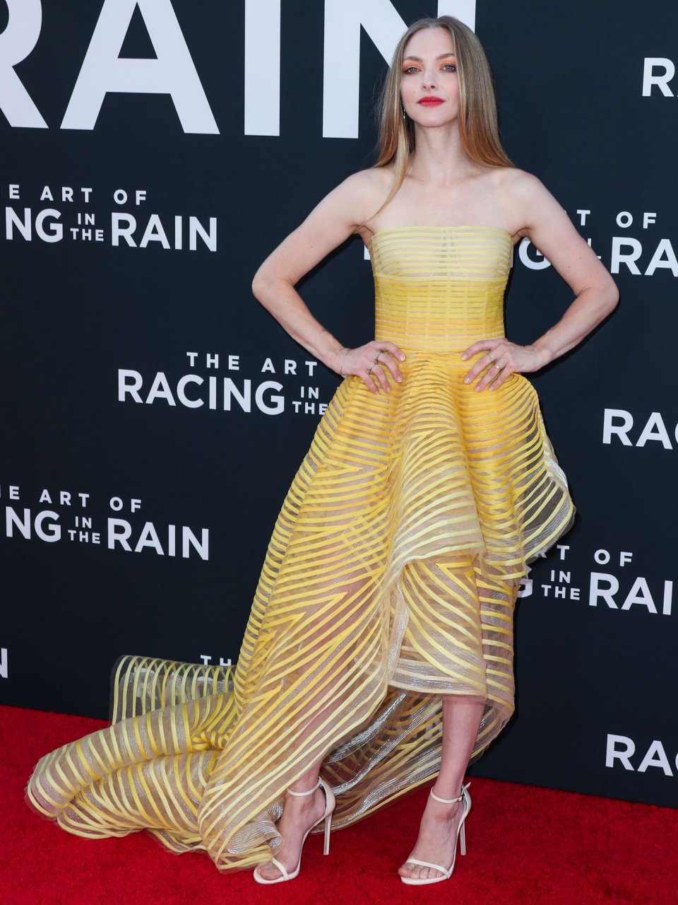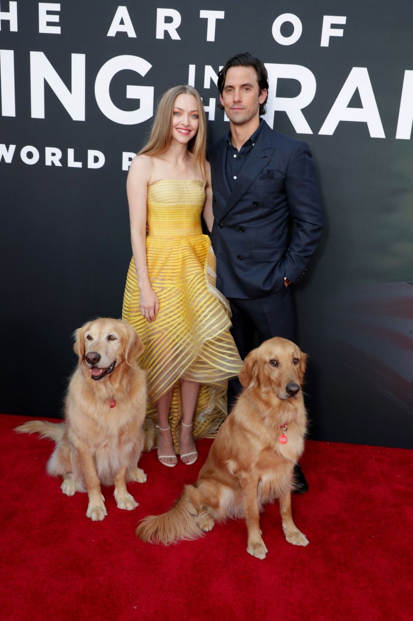 Actrice Amanda Seyfried portant une robe Oscar de la Renta, des talons Stuart Weitzman et des boucles d’oreilles Jennifer Meyer arrive à la première à Los Angeles du film de 20th Century Fox ‘The Art Of Racing In The Rain’ tenue au El Capitan Theatre à Hollywood, Los Angeles, le 01/08/2019.