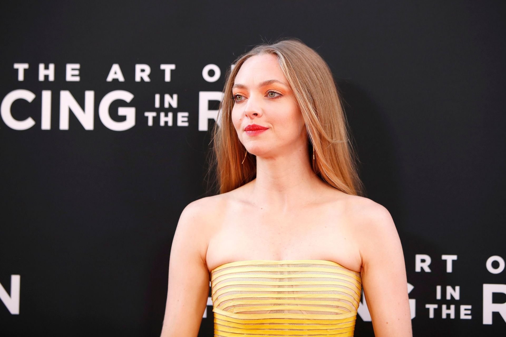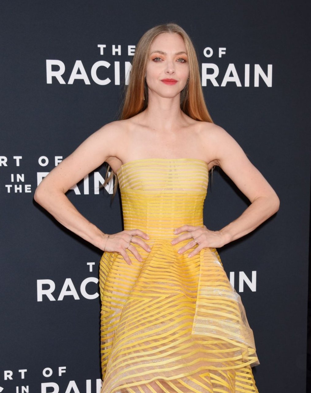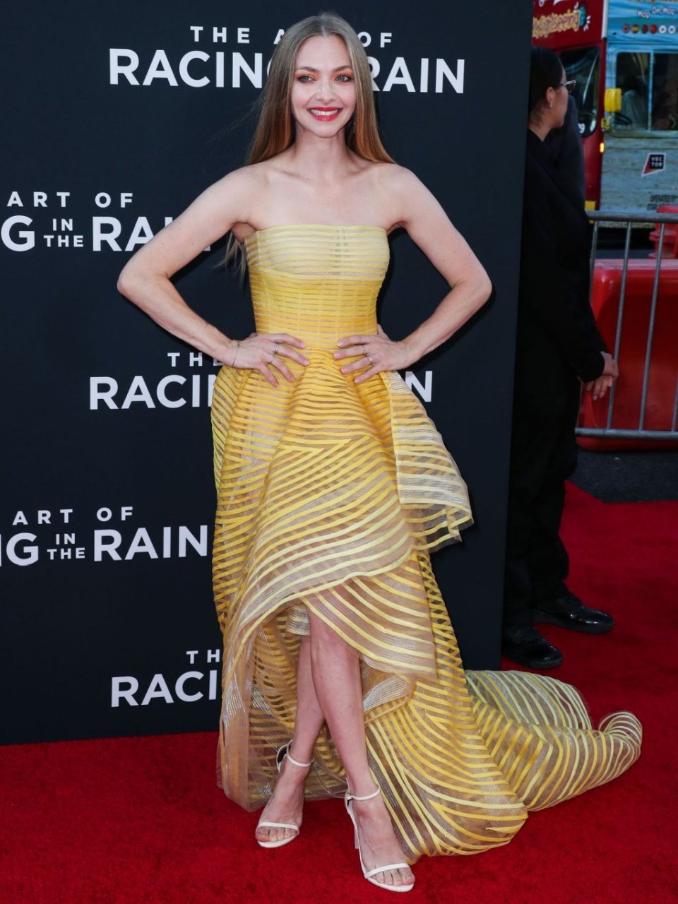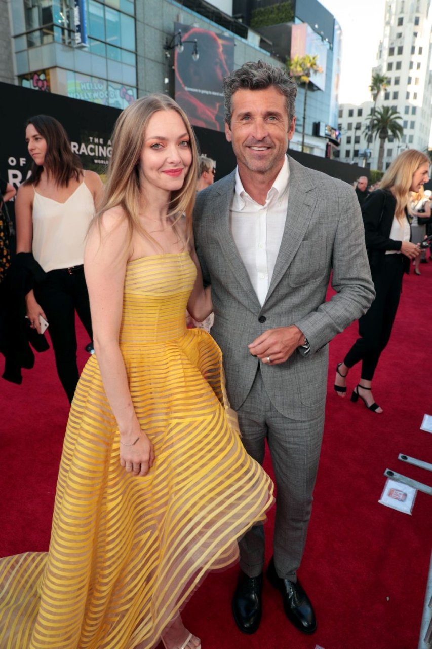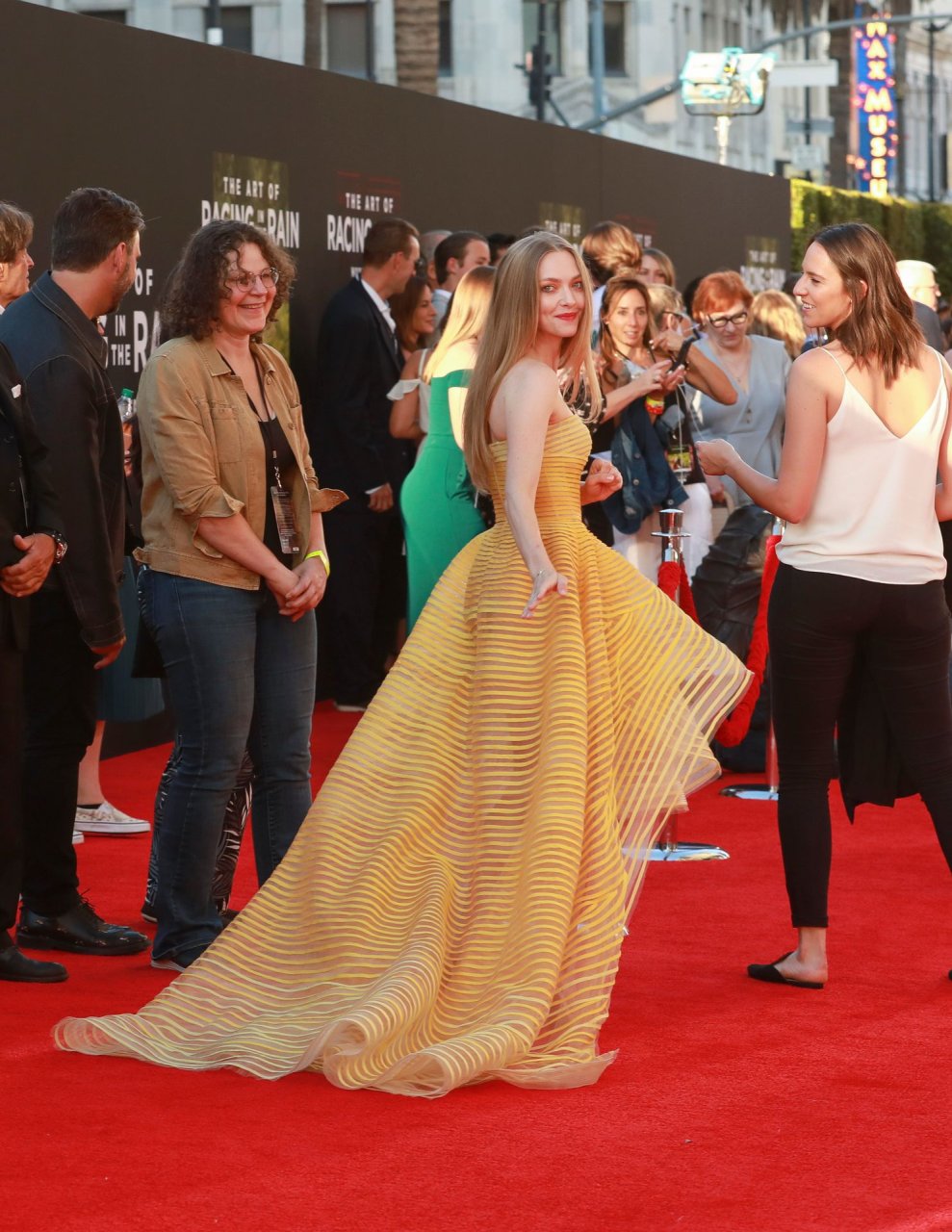 Actrice Amanda Seyfried portant une robe Oscar de la Renta, des talons Stuart Weitzman et des boucles d’oreilles Jennifer Meyer arrive à la première à Los Angeles du film de 20th Century Fox ‘The Art Of Racing In The Rain’ tenue au El Capitan Theatre à Hollywood, Los Angeles, le 01/08/2019.