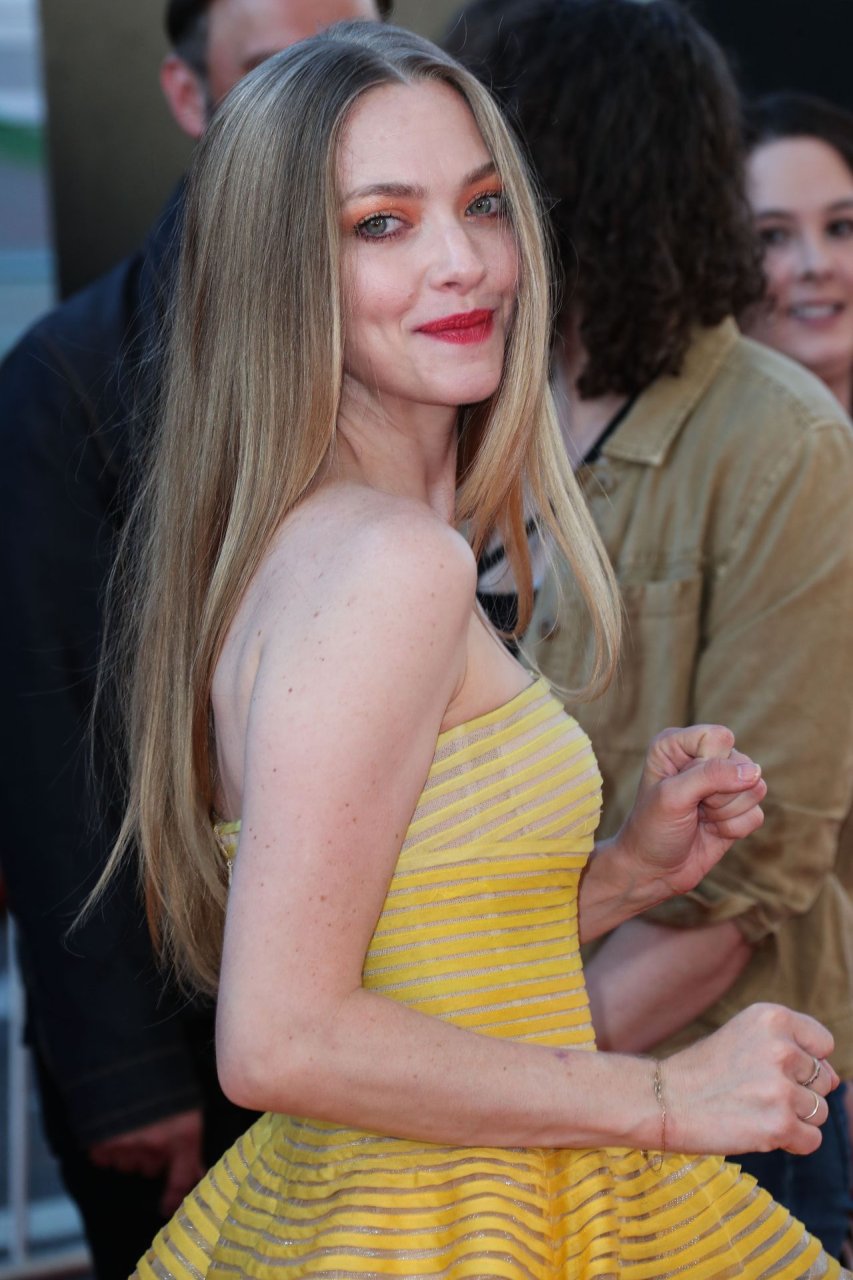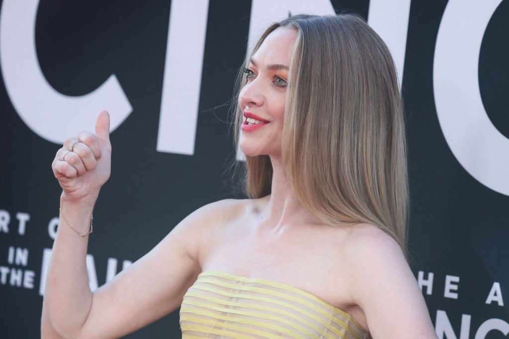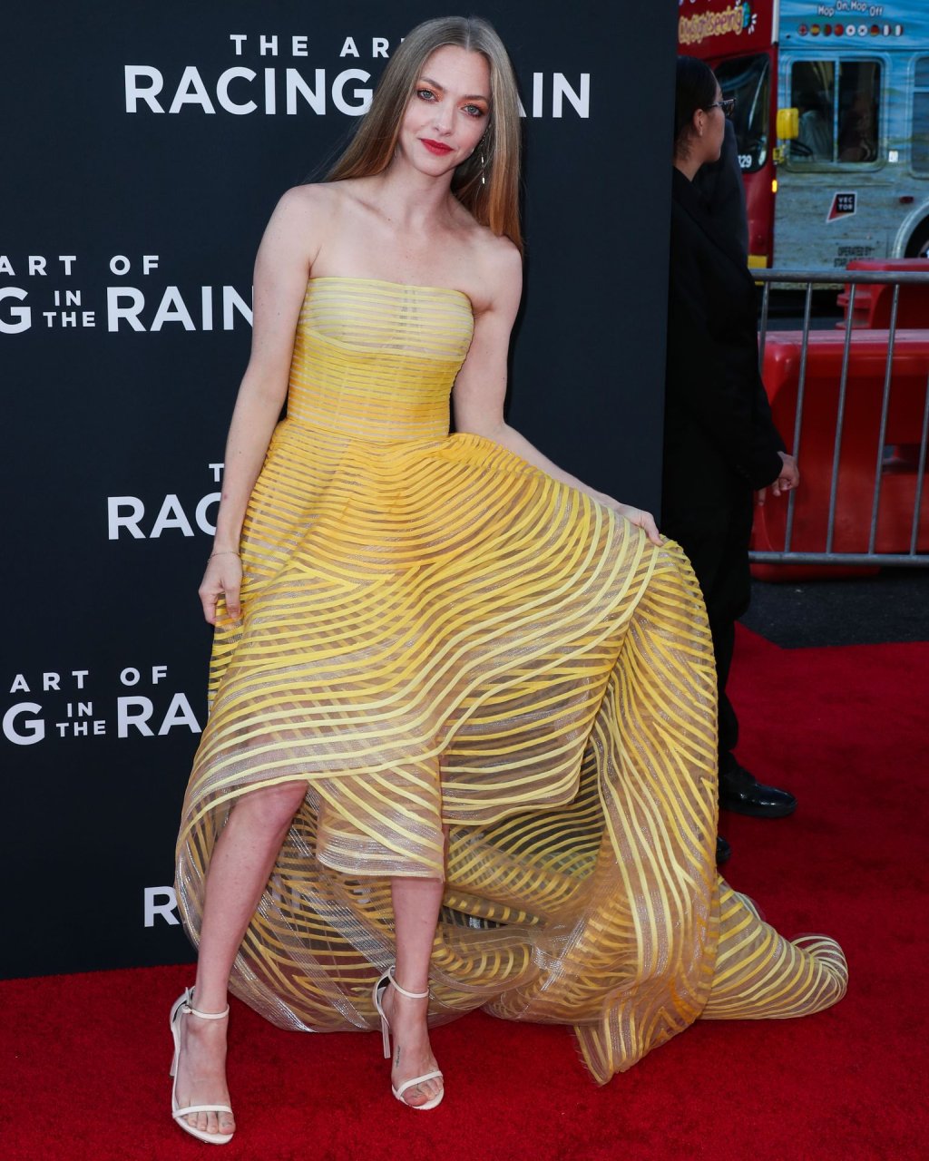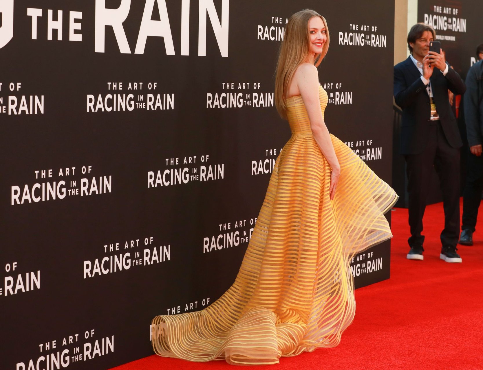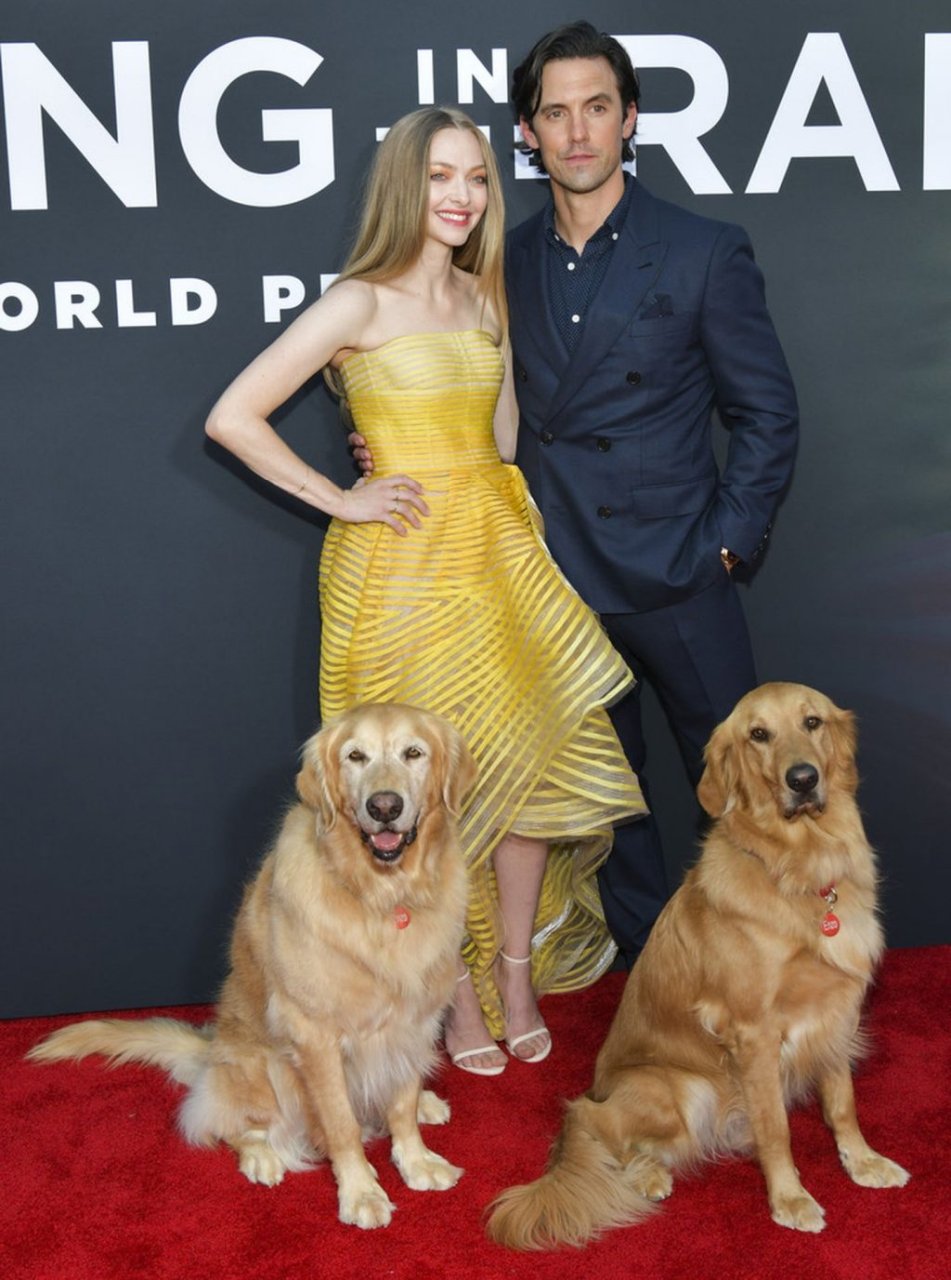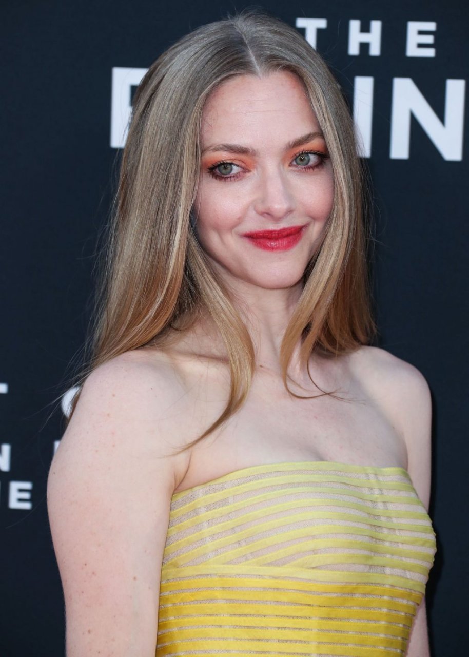 Actrice Amanda Seyfried portant une robe Oscar de la Renta, des talons Stuart Weitzman et des boucles d’oreilles Jennifer Meyer arrive à la première à Los Angeles du film de 20th Century Fox ‘The Art Of Racing In The Rain’ tenue au El Capitan Theatre à Hollywood, Los Angeles, le 01/08/2019.