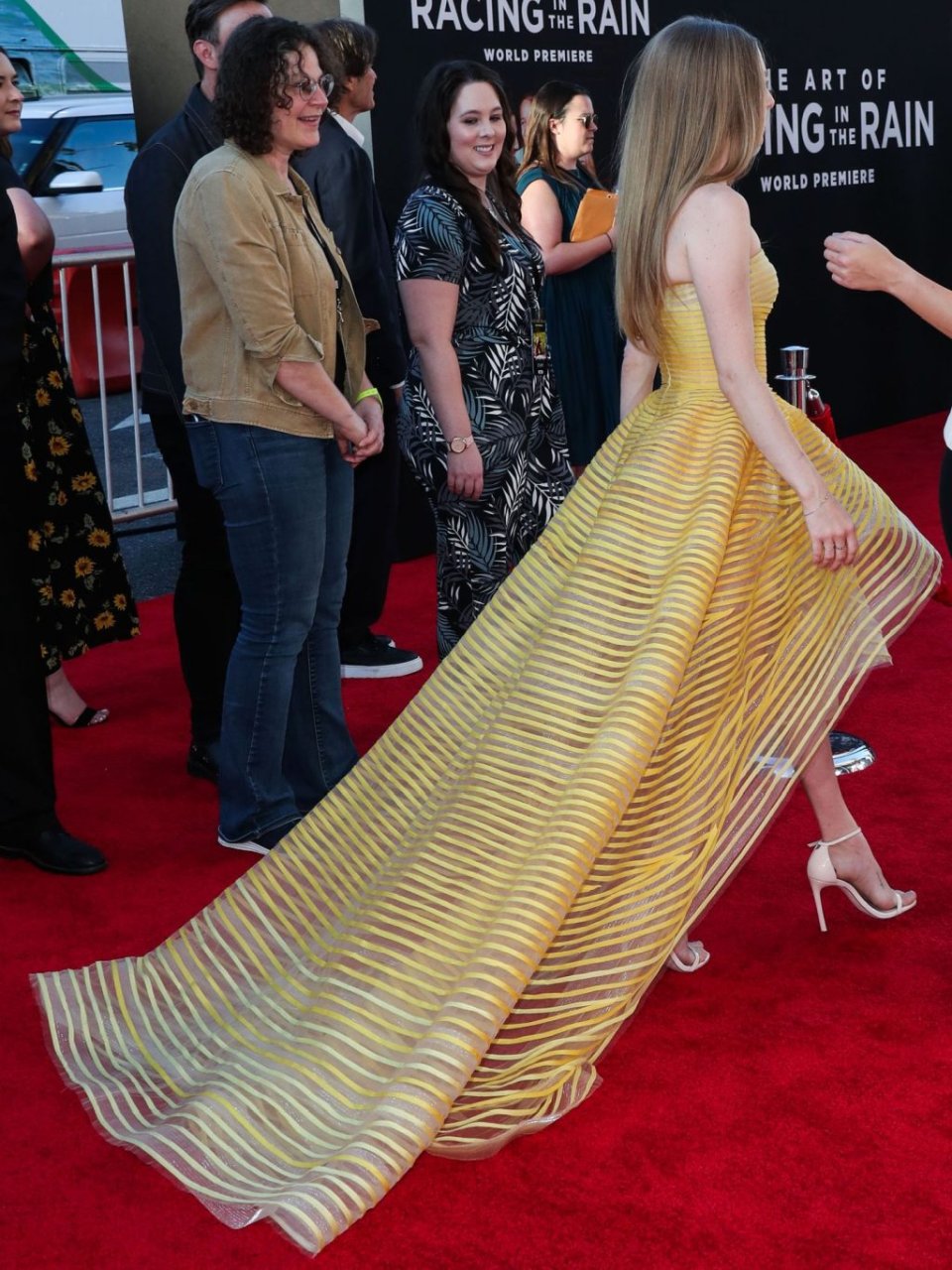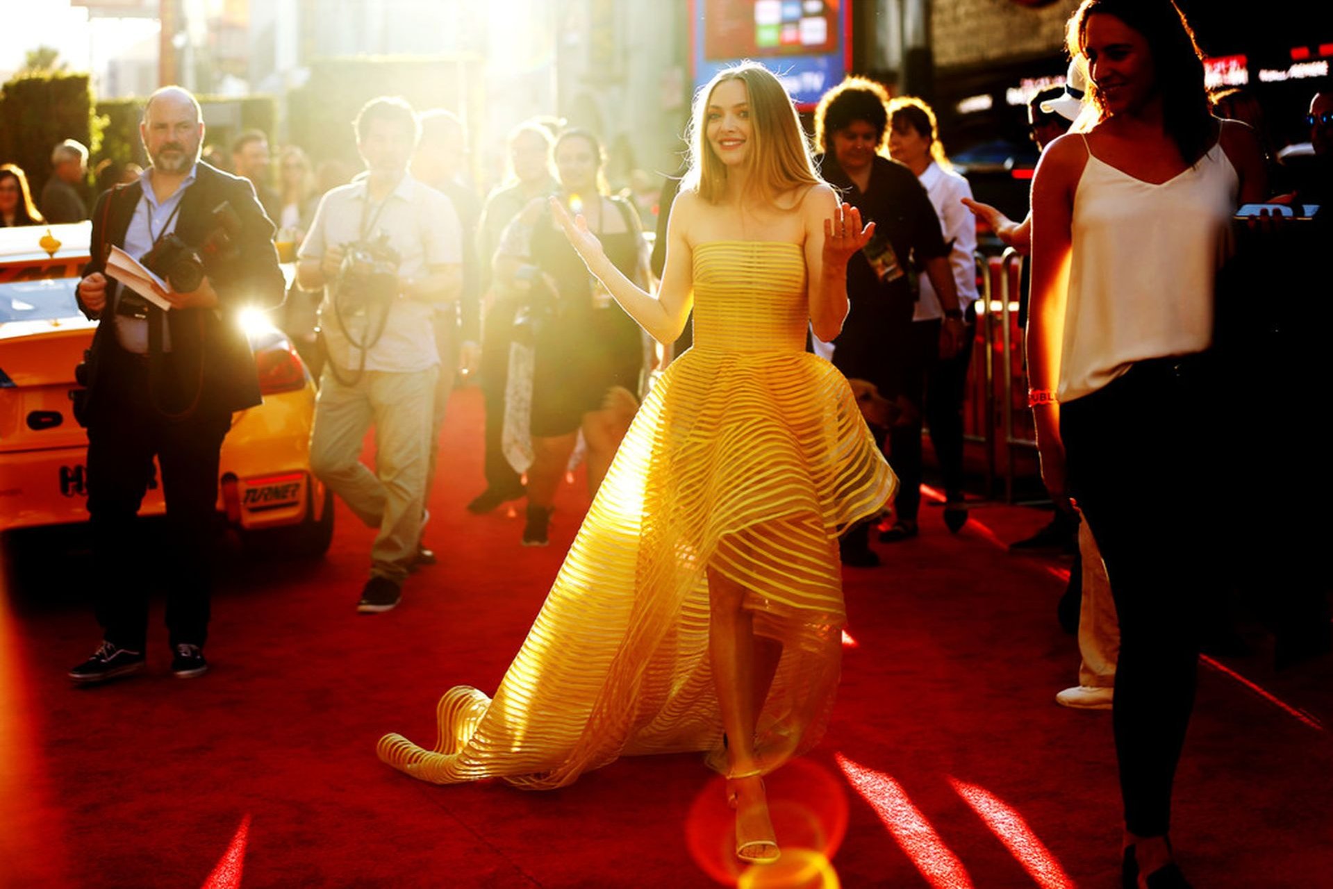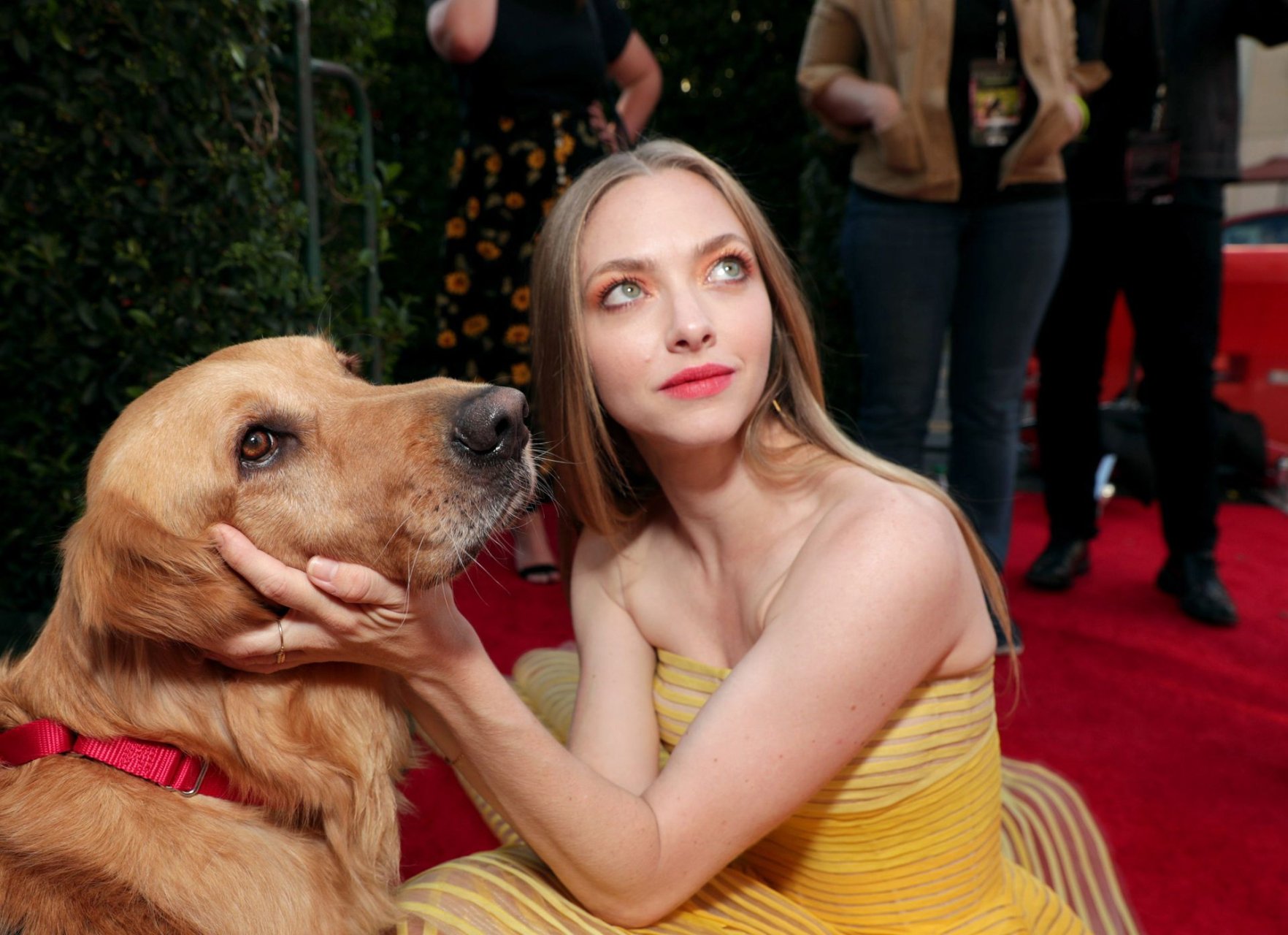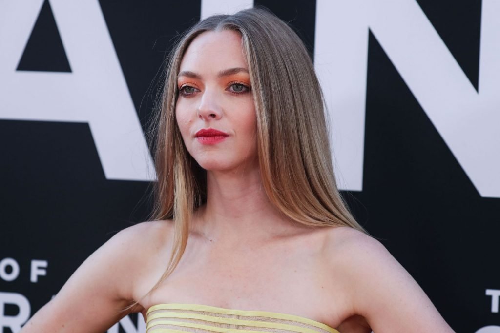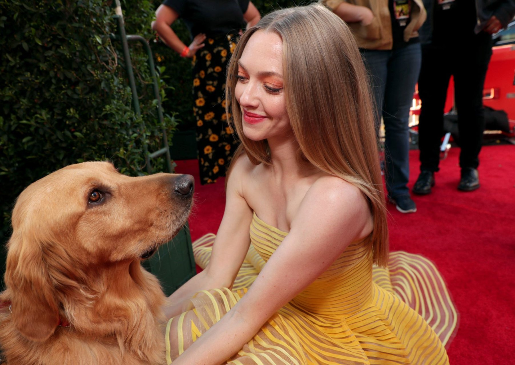 Actrice Amanda Seyfried portant une robe Oscar de la Renta, des talons Stuart Weitzman et des boucles d’oreilles Jennifer Meyer arrive à la première à Los Angeles du film de 20th Century Fox ‘The Art Of Racing In The Rain’ tenue au El Capitan Theatre à Hollywood, Los Angeles, le 01/08/2019.
