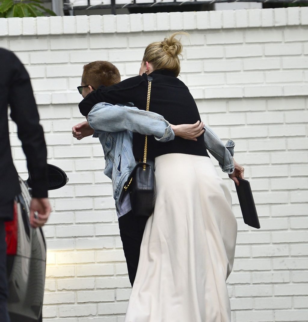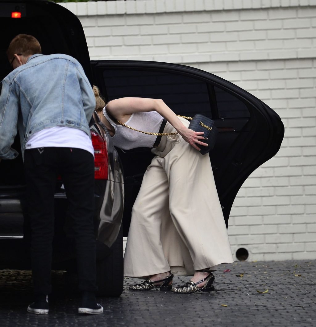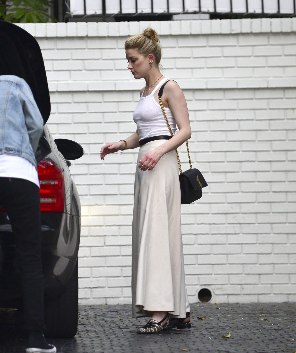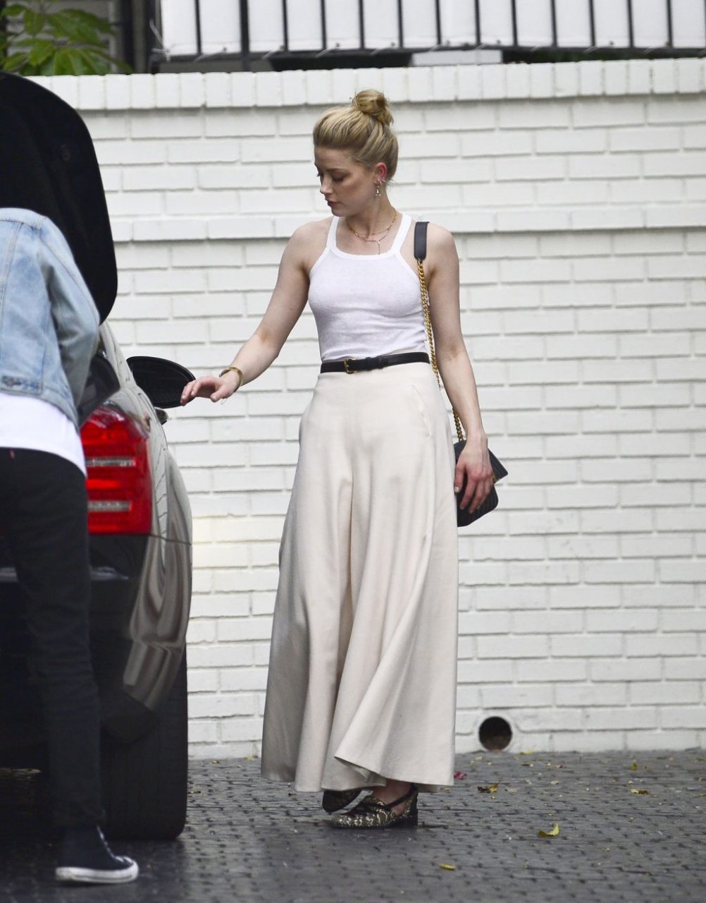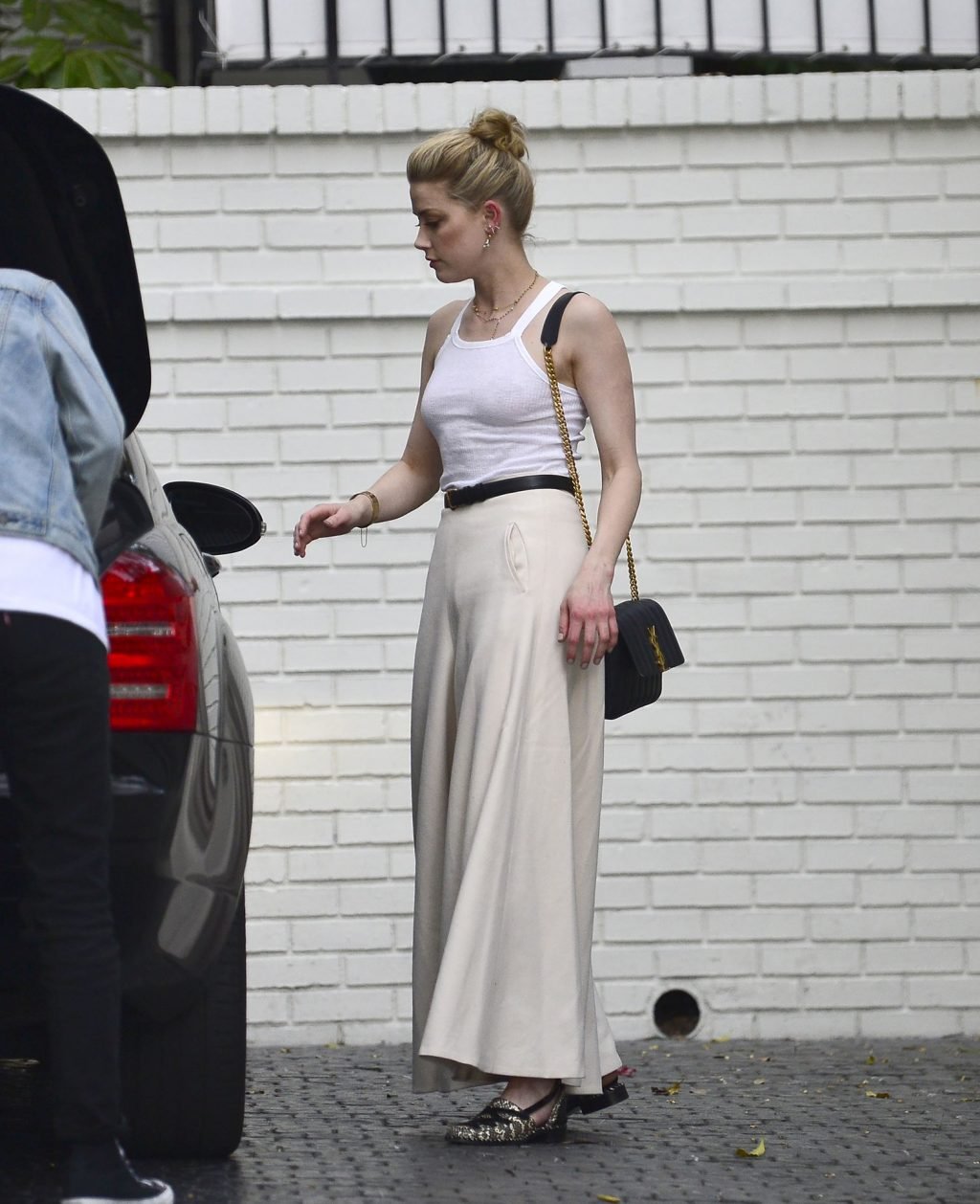 L’actrice et star de The Fappening Amber Heard essaie de se faire porter sur le dos d’un ami en arrivant à l’hôtel Chateau Marmont à Los Angeles, le 01/04/2019. L’actrice de 32 ans portait un débardeur blanc, une veste noire, un pantalon ample et des chaussures en peau de serpent.