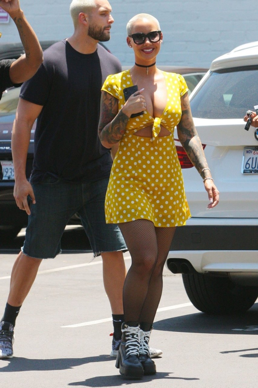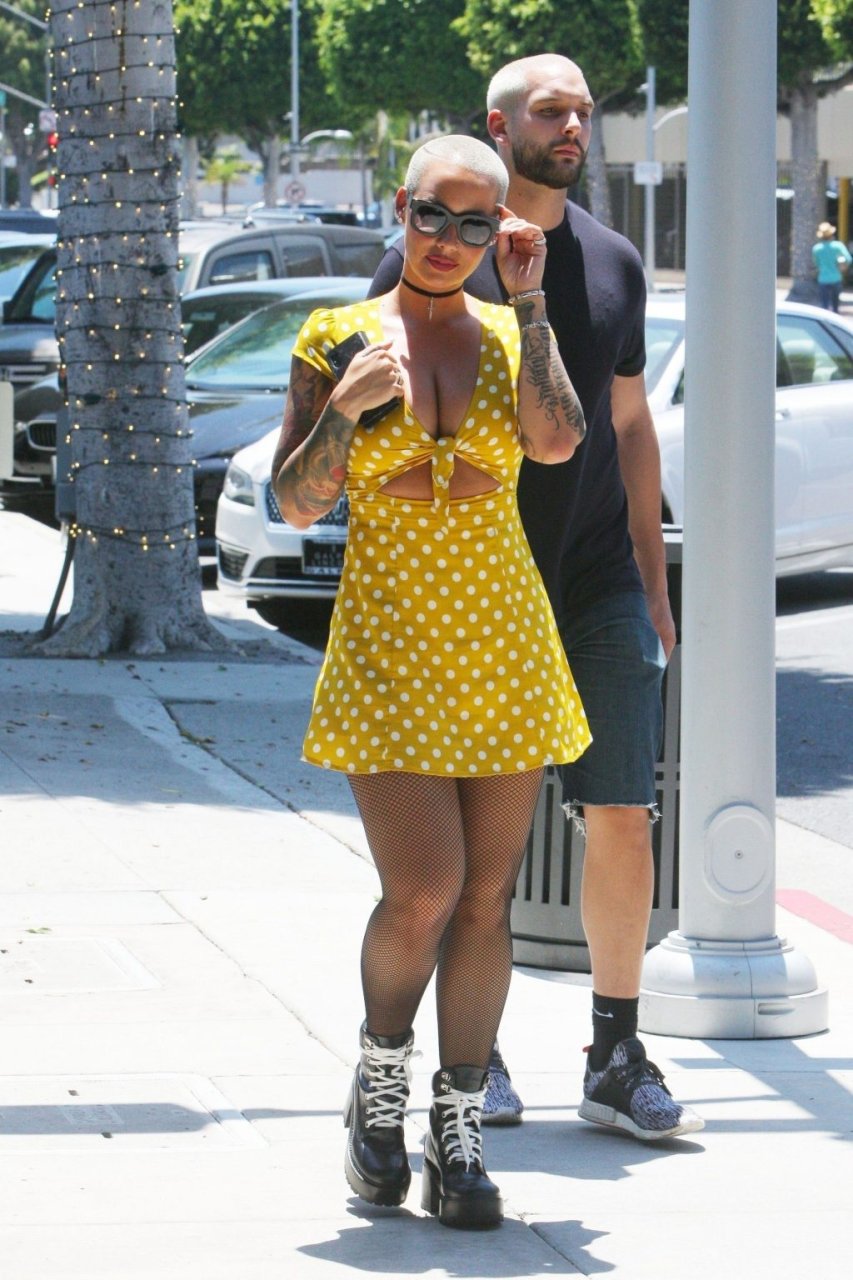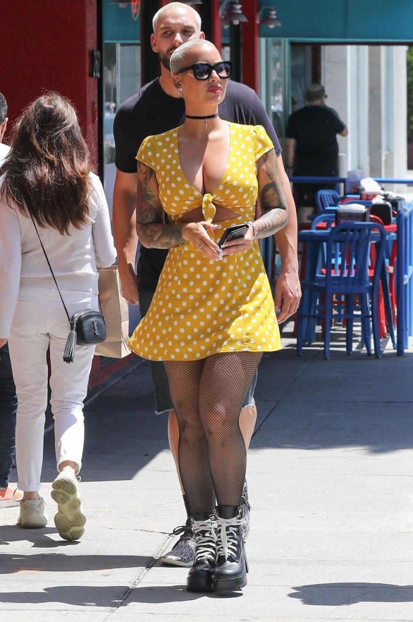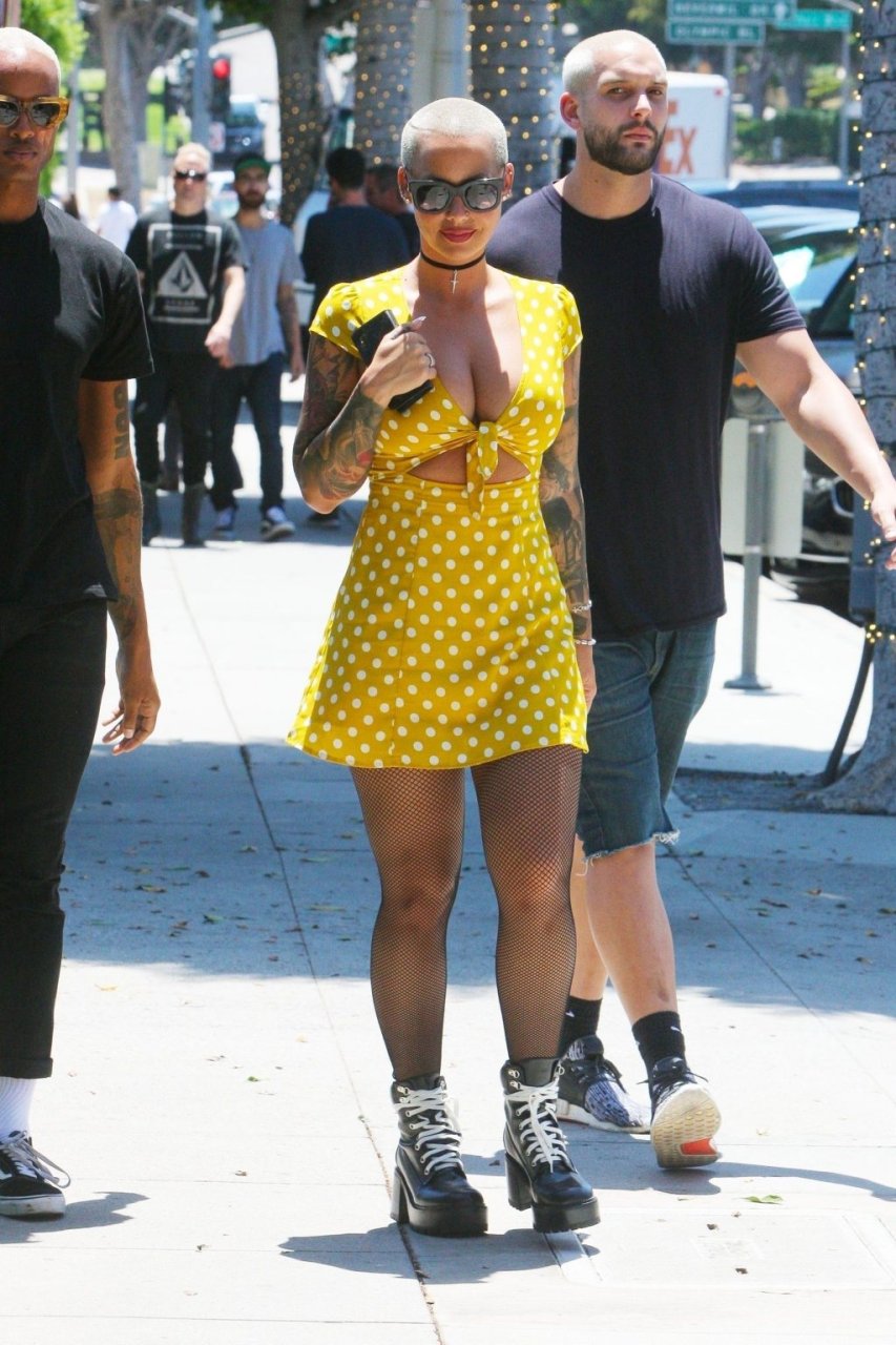 La star d’Internet et de la télévision a déambulé dans Beverly Hills dans une courte robe jaune à pois. Son look était complété par des collants et des chaussures géantes. On dirait qu’Amber portait une robe du placard de la petite amie de son fils de 5 ans.