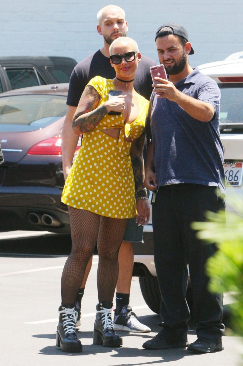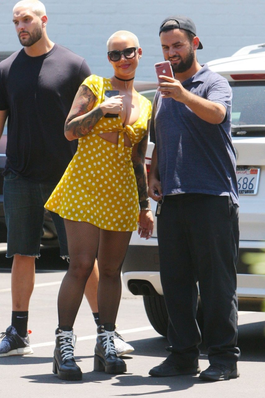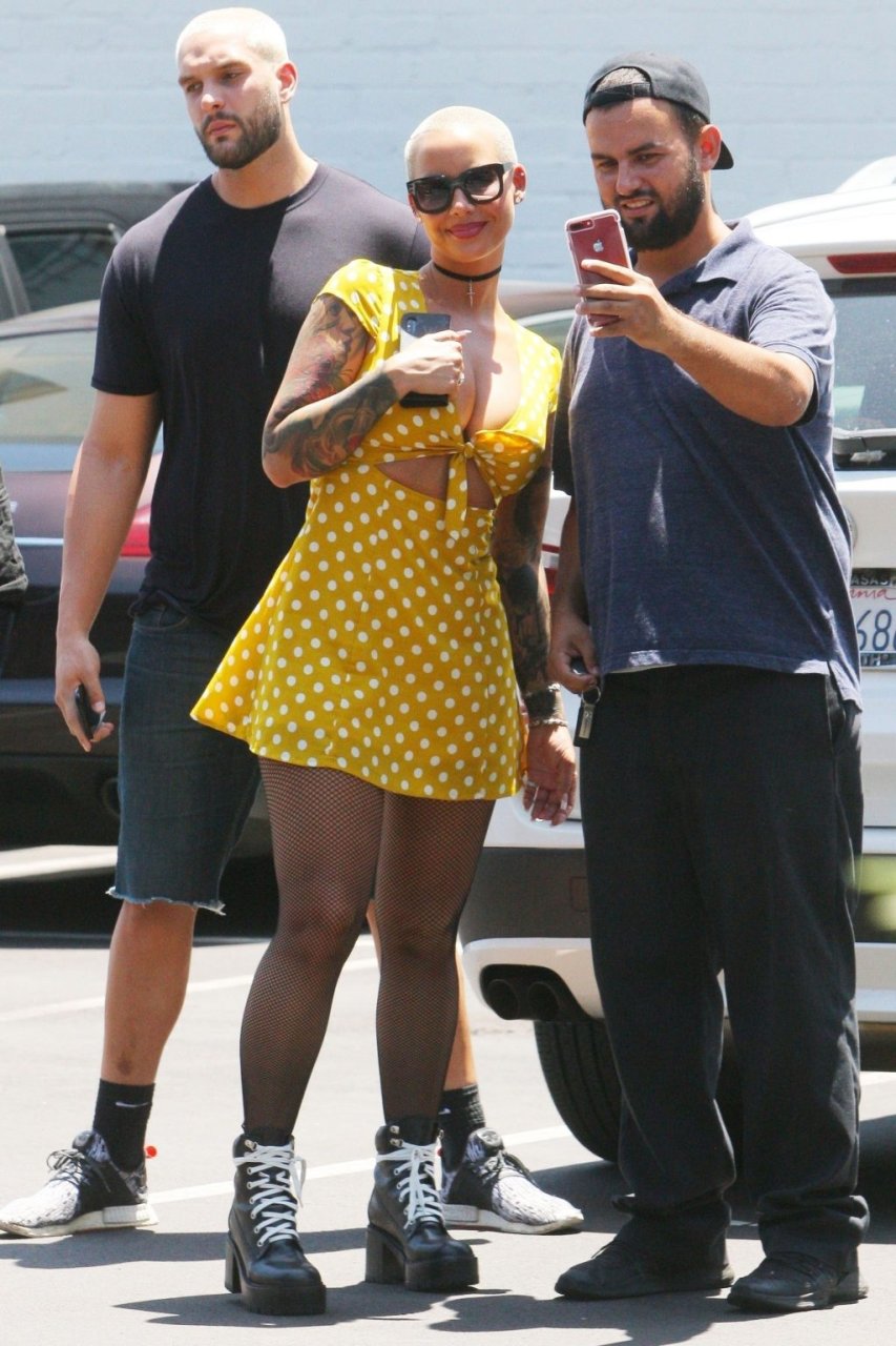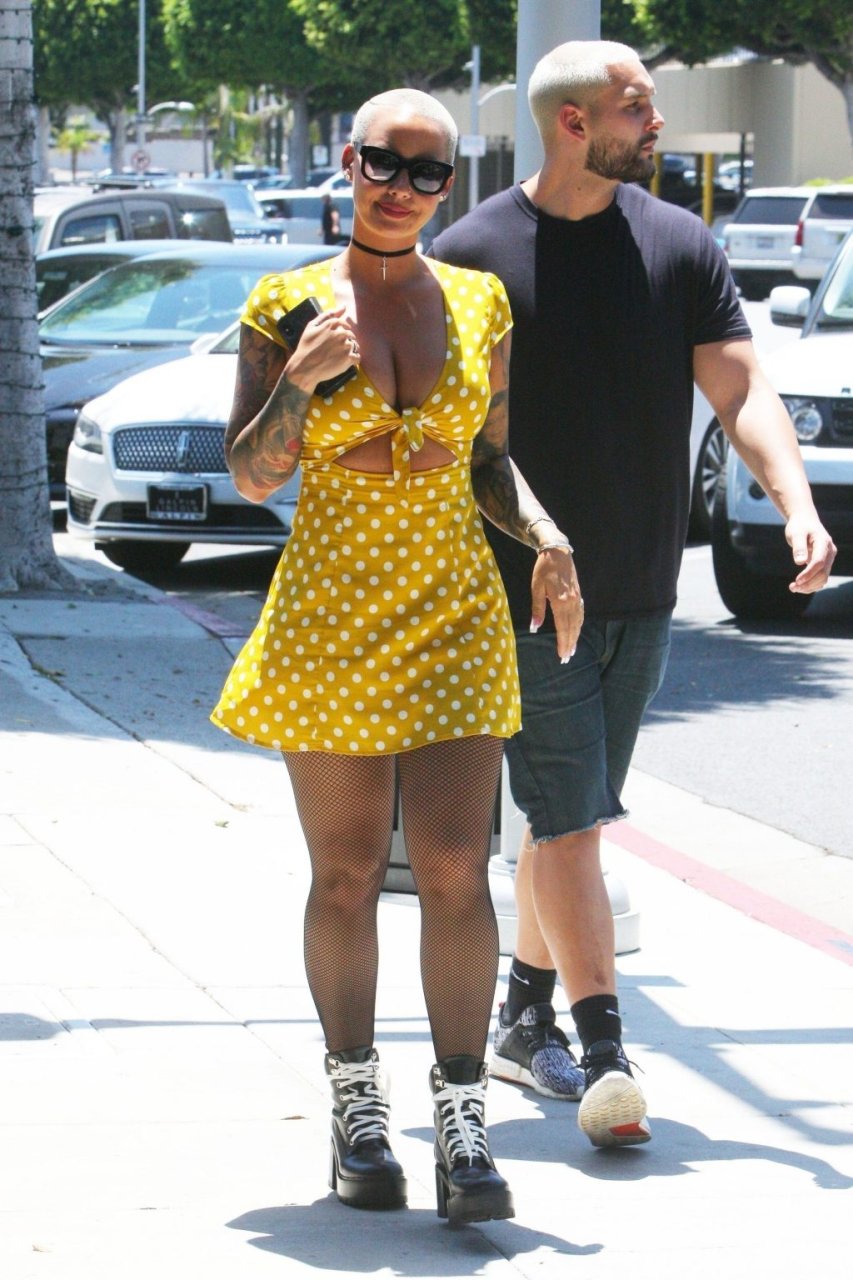 La star d’Internet et de la télévision a déambulé dans Beverly Hills dans une courte robe jaune à pois. Son look était complété par des collants et des chaussures géantes. On dirait qu’Amber portait une robe du placard de la petite amie de son fils de 5 ans.