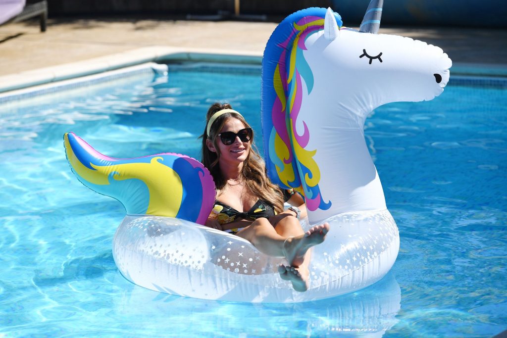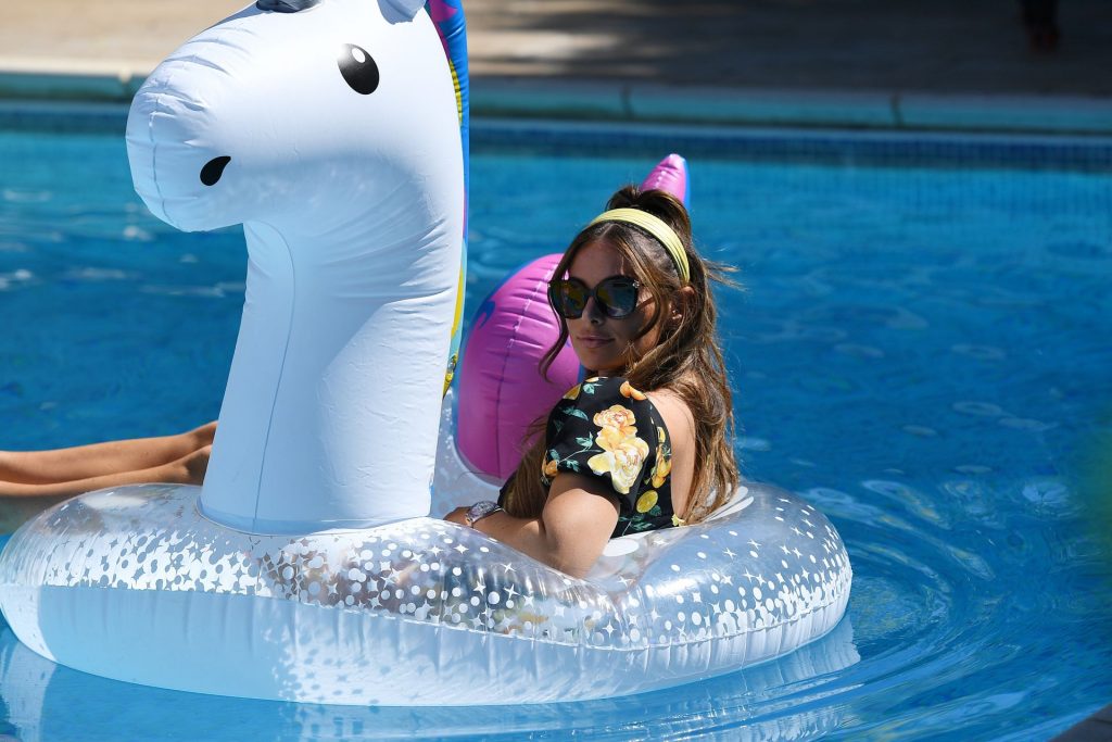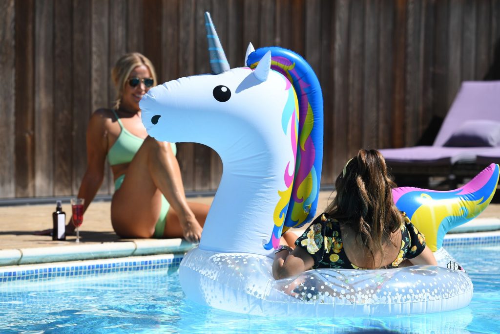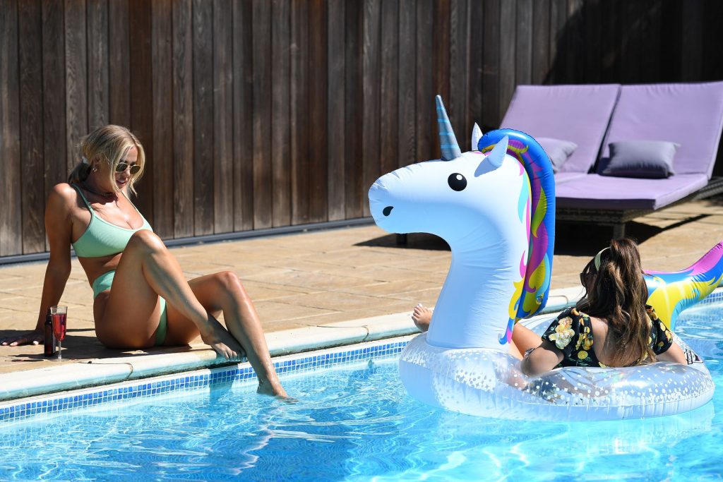 Amber Turner, Chloe Meadows, Courtney Green montrent leurs corps sexy lors du tournage de l’émission télévisée “The Only Way is Essex” au bord de la piscine, 29/07/2020.