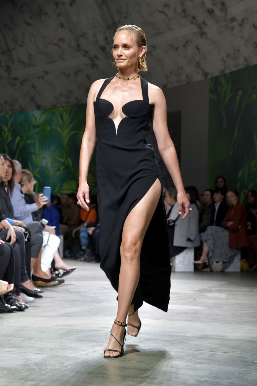 La mannequin vétéran Amber Valletta a exhibé ses jambes sexy et sa poitrine sur le podium du défilé Versace Printemps/Été 2020 lors de la Fashion Week de Milan en Italie, le 20/09/2019.