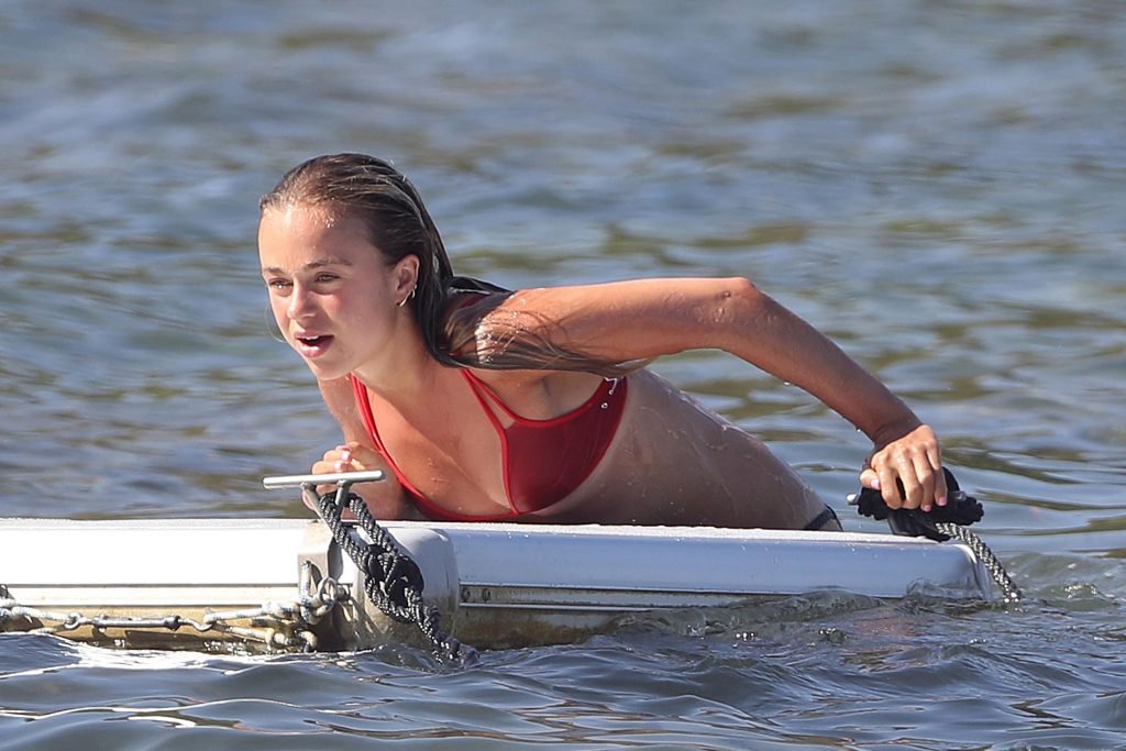 Lady Amelia Windsor se baigne à la plage, 27/07/2018. La jeune royale de 22 ans a profité d’une baignade relaxante avant de se faire des amis avec un chien avec lequel elle a joué au frisbee.