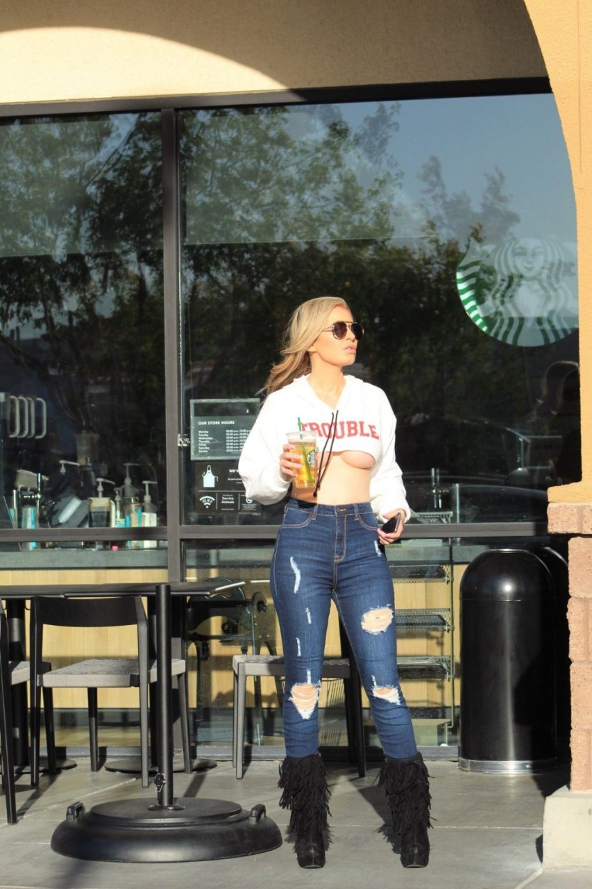 La Playmate brésilienne Ana Braga montre un important underboob lors d’une course au Starbucks à Calabasas, le 14/10/2018. Le mannequin de 36 ans a un petit problème de garde-robe alors qu’elle retourne à son véhicule avec un pull court.