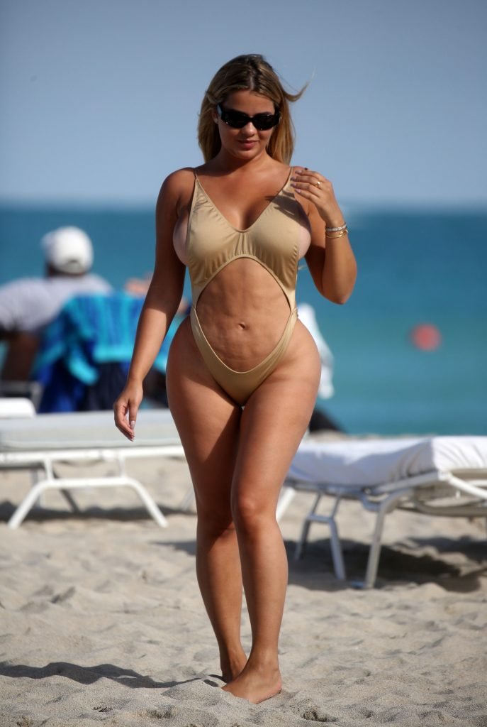 La superstar d’Instagram Anastasia Kvitko, 23 ans, met en valeur ses courbes dans un maillot de bain doré avec un string à la plage de Miami Beach, le 08/03/2018.