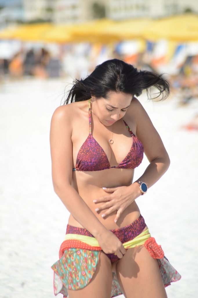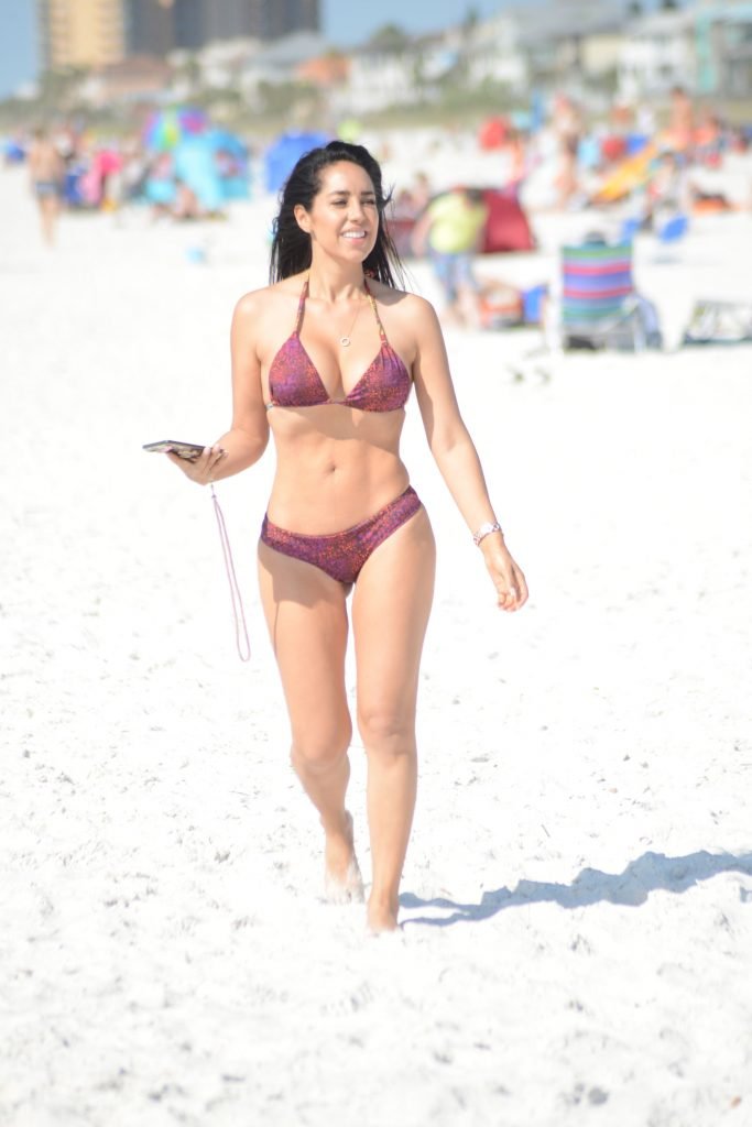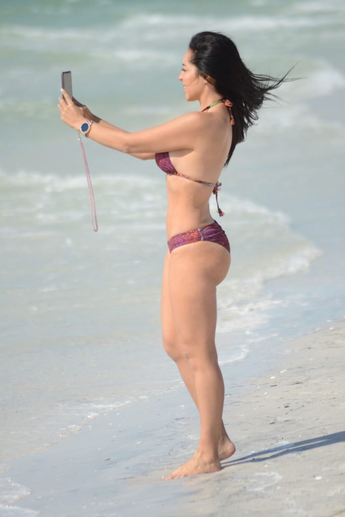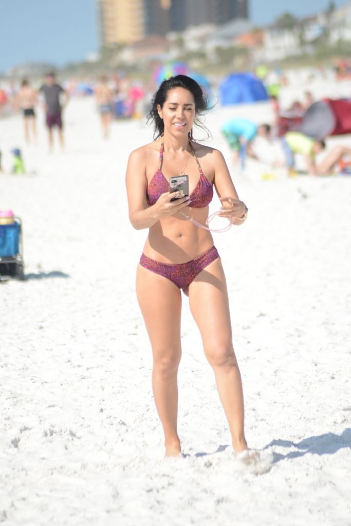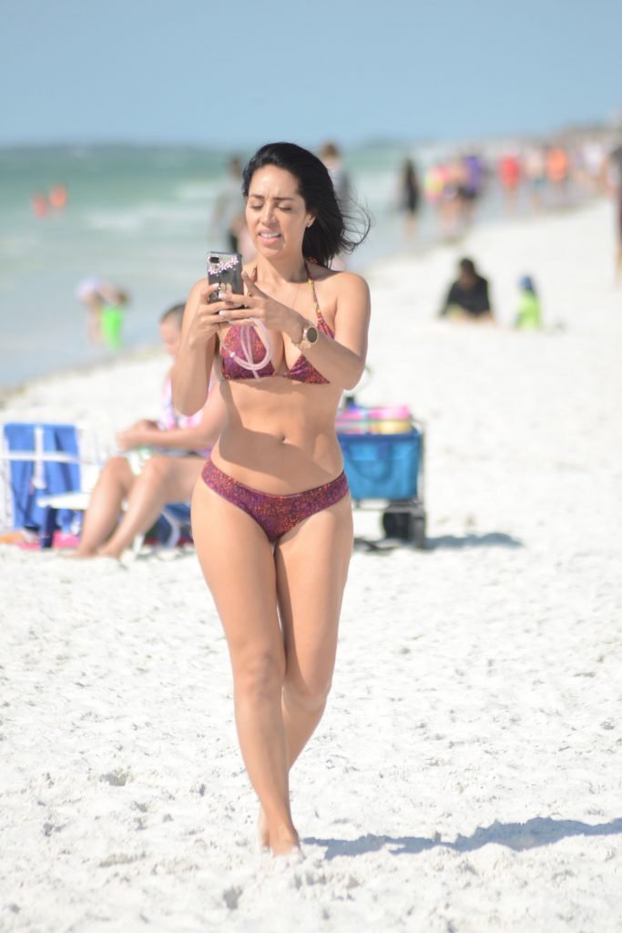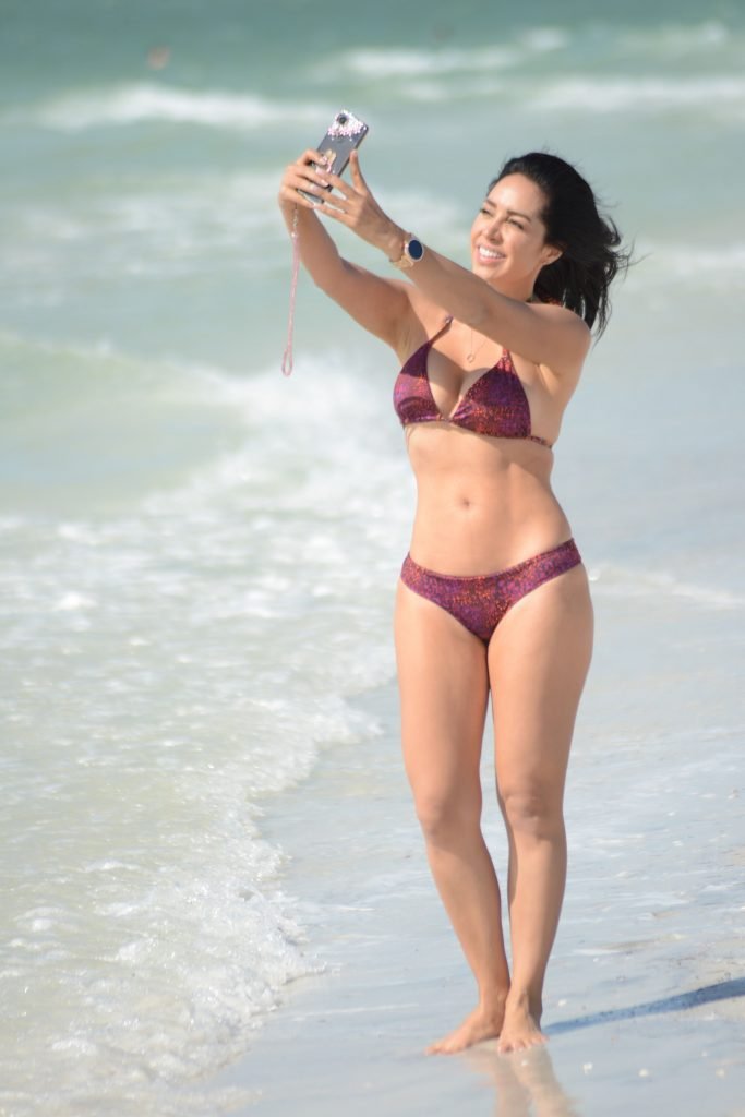 Modèle tonique et en forme et commentatrice sportive Andrea Calle, 35 ans, filmant et prenant des selfies pour ses fans ou une personne spéciale à la plage de Miami, le 24/04/2018. La commentatrice MMA / UFC en forme attirait les regards alors qu’elle marchait le long de la plage.