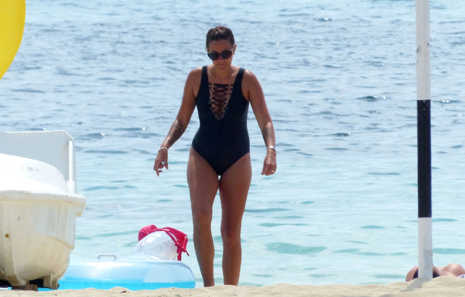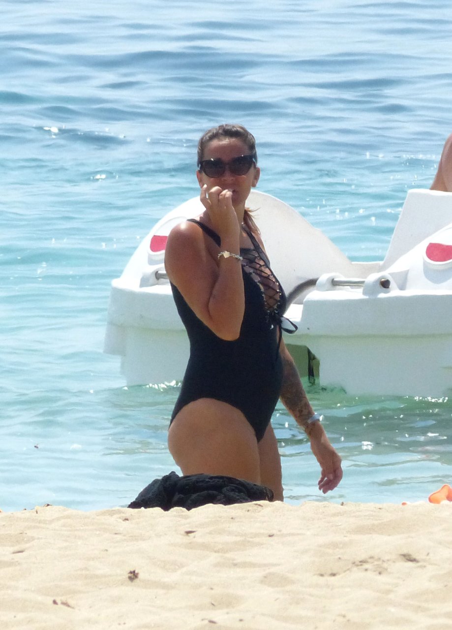 Le mannequin britannique et ancienne star de la télé-réalité de l’émission Love Island d’ITV, Angel Flukes, a été vue en maillot de bain noir sur une plage à Palma, en Espagne, le 07/12/2018.